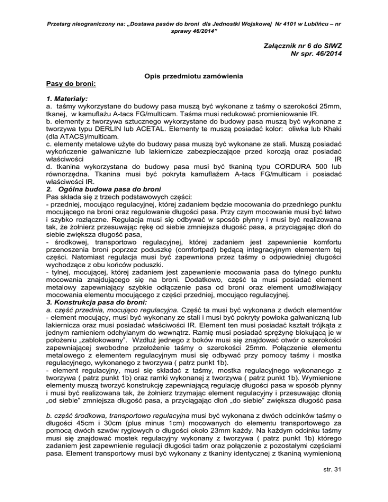 Przetarg nieograniczony na: „Dostawa pasów do broni dla Jednostki Wojskowej Nr 4101 w Lublińcu – nr sprawy 46/2014” Załącznik nr 6 do SIWZ Nr spr. 46/2014 Opis przedmiotu zamówienia Pasy do broni: 1. Materiały: a. taśmy wykorzystane do budowy pasa muszą być wykonane z taśmy o szerokości 25mm, tkanej, w kamuflażu A-tacs FG/multicam. Taśma musi redukować promieniowanie IR. b. elementy z tworzywa sztucznego wykorzystane do budowy pasa muszą być wykonane z tworzywa typu DERLIN lub ACETAL. Elementy te muszą posiadać kolor: oliwka lub Khaki (dla ATACS)/multicam. c. elementy metalowe użyte do budowy pasa muszą być wykonane ze stali. Muszą posiadać wykończenie galwaniczne lub lakiernicze zabezpieczające przed korozją oraz posiadać właściwości IR d. tkanina wykorzystana do budowy pasa musi być tkaniną typu CORDURA 500 lub równorzędna. Tkanina musi być pokryta kamuflażem A-tacs FG/multicam i posiadać właściwości IR. 2. Ogólna budowa pasa do broni Pas składa się z trzech podstawowych części: - przedniej, mocująco regulacyjnej, której zadaniem będzie mocowania do przedniego punktu mocującego na broni oraz regulowanie długości pasa. Przy czym mocowanie musi być łatwo i szybko rozłączne. Regulacja musi się odbywać w sposób płynny i musi być realizowana tak, że żołnierz przesuwając rękę od siebie zmniejsza długość pasa, a przyciągając dłoń do siebie zwiększa długość pasa, - środkowej, transportowo regulacyjnej, której zadaniem jest zapewnienie komfortu przenoszenia broni poprzez poduszkę (comfortpad) będącą integracyjnym elementem tej części. Natomiast regulacja musi być zapewniona przez taśmy o odpowiedniej długości wychodzące z obu końców poduszki. - tylnej, mocującej, której zadaniem jest zapewnienie mocowania pasa do tylnego punktu mocowania znajdującego się na broni. Dodatkowo, część ta musi posiadać element metalowy zapewniający szybkie odłączenie pasa od broni oraz element umożliwiający mocowania elementu mocującego z części przedniej, mocująco regulacyjnej. 3. Konstrukcja pasa do broni: a. część przednia, mocująco regulacyjna. Część ta musi być wykonana z dwóch elementów - element mocujący, musi być wykonany ze stali i musi być pokryty powłoka galwaniczną lub lakiernicza oraz musi posiadać właściwości IR. Element ten musi posiadać kształt trójkąta z jednym ramieniem odchylanym do wewnątrz. Ramię musi posiadać sprężynę blokującą je w położeniu „zablokowany”. Wzdłuż jednego z boków musi się znajdować otwór o szerokości zapewniającej swobodne przełożenie taśmy o szerokości 25mm. Połączenie elementu metalowego z elementem regulacyjnym musi się odbywać przy pomocy taśmy i mostka regulacyjnego, wykonanego z tworzywa ( patrz punkt 1b). - element regulacyjny, musi się składać z taśmy, mostka regulacyjnego wykonanego z tworzywa ( patrz punkt 1b) oraz ramki wykonanej z tworzywa ( patrz punkt 1b). Wymienione elementy muszą tworzyć konstrukcję zapewniającą regulację długości pasa w sposób płynny i musi być realizowana tak, że żołnierz trzymając element regulacyjny i przesuwając dłonią „od siebie” zmniejsza długość pasa, a przyciągając dłoń „do siebie” zwiększa długość pasa b. część środkowa, transportowo regulacyjna musi być wykonana z dwóch odcinków taśmy o długości 45cm i 30cm (plus minus 1cm) mocowanych do elementu transportowego za pomocą dwóch szwów ryglowych o długości około 23mm każdy. Na każdym odcinku taśmy musi się znajdować mostek regulacyjny wykonany z tworzywa ( patrz punkt 1b) którego zadaniem jest zapewnienie regulacji długości taśm oraz połączenie z pozostałymi częściami pasa. Element transportowy musi być wykonany z tkaniny identycznej z tkaniną wymienioną str. 31 Przetarg nieograniczony na: „Dostawa pasów do broni dla Jednostki Wojskowej Nr 4101 w Lublińcu – nr sprawy 46/2014” w punkcie 1d. Tkanina musi na całej długości obejmować piankę polietylenową o grubości 3 do 4mm. Połączenie tkaniny musi się odbywać za pomocą szwu biegnącego wzdłuż osi podłużnej elementu transportowego. W ten sposób powstaje „poduszka” której zadaniem jest zapewnienie komfortu przenoszenia broni przed długie okresy czasu. c. część tylna, mocująca. Część ta musi być wykonana z -- oczka stalowego w kształcie litery D. Podstawa oczka musi posiadać wymiar wewnętrzny nie mniejszy niż 25 mm. Oczko musi być wykonane z pręta stalowego trwale połączonego. Oczko musi być pokryte powłoką lakierniczą lub galwaniczną zabezpieczająca przed korozją. - elementu mocującego, który musi być wykonany z metalu. Konstrukcja elementu mocującego musi zapewniać przełożenie przez jeden z jego końców taśmy o szerokości 25mm. Na drugim końcu musi się znajdować odchylane ramię, którego wymiary zapewnią przełożenie go przez oczka o średnicy nie mniejszej niż 10mm. Odchylane ramie elementu mocującego musi być blokowane przez bolec, który wychodząc z korpusu elementu mocującego jest wprowadzany w oczko znajdujące się na końcu odchylanego ramienia. Gniazdo bolca musi posiadać sprężynę utrzymującą go w pozycji ryglującej. Na drugim końcu bolca musi być umieszczony element ułatwiający uchwycenie i odciągnięcie bolca. - łącznika taśmowego, który musi być wykonany z taśmy o szerokości 25mm. Łącznik, po połączeniu musi posiadać długość zawierająca się w przedziale 8,5cm plus minus 5mm. Połączenie musi być realizowane za pomocą dwóch szwów mocujących biegnących prostopadle do osi podłużnej łącznika oraz jednego szwu ryglowego o długości 23mm biegnącego prostopadle do osi podłużnej łącznika. Element mocujący i oczko stalowe muszą być trwale połączone ze sobą za pomocą łącznika taśmowego. Na łączniku taśmowym muszą się znajdować szwy ryglowe, których zadaniem jest stab