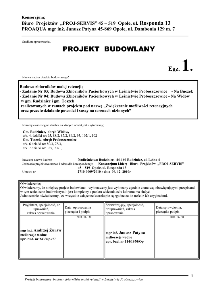 Konsorcjum; Biuro Projektów „PROJ-SERVIS” 45 – 519 Opole, ul. Rosponda 13 PROAQUA mgr inŜ. Janusz Patyna 45-869 Opole, ul. Dambonia 129 m. 7 Stadium opracowania: PROJEKT BUDOWLANY Egz. 1. Nazwa i adres obiektu budowlanego: Budowa zbiorników małej retencji; - Zadanie Nr 03; Budowa Zbiorników Paciorkowych w Leśnictwie Proboszczowice - Na Buczek - Zadanie Nr 04; Budowa Zbiorników Paciorkowych w Leśnictwie Proboszczowice - Na Widów w gm. Rudziniec i gm. Toszek realizowanych w ramach projektu pod nazwą „Zwiększanie moŜliwości retencyjnych oraz przeciwdziałanie powodzi i suszy na terenach nizinnych” Numery ewidencyjne działek na których obiekt jest usytuowany; Gm. Rudziniec, obręb Widów, ark. 4. działki nr: 95, 88/2, 87/2, 86/2, 93, 102/1, 102 Gm. Toszek, obręb Proboszczowice ark. 6 działki nr: 80/3, 78/3, ark. 7 działki nr: 85, 87/1, Inwestor nazwa i adres: Nadleśnictwo Rudziniec, 44-160 Rudziniec, ul. Leśna 4 Jednostka projektowa nazwa i adres dla korespondencji; Konsorcjum Lider; Biuro Projektów „PROJ-SERVIS” Umowa nr 45 – 519 Opole, ul. Rosponda 13 2710-0009/2010 z dnia 06. 12. 2010r Oświadczenie; Oświadczamy, Ŝe niniejszy projekt budowlano - wykonawczy jest wykonany zgodnie z umową, obowiązującymi przepisami w tym techniczno-budowlanymi i jest kompletny z punktu widzenia celu któremu ma słuŜyć. Jednocześnie oświadczamy , Ŝe wszystkie załączone kserokopie są zgodne co do treści z ich oryginałami. Projektant, specjalność, nr uprawnień, zakres opracowania. Data opracowania pieczątka i podpis Sprawdzający, specjalność, nr uprawnień, zakres opracowania 2011. 06. .30 mgr inŜ. Andrzej śuraw melioracje wodne upr. bud. nr 243/Op./77 Data sprawdzenia, pieczątka podpis 2011. 06..30 mgr inŜ. Janusz Patyna melioracje wodne upr. bud. nr 114/1970/Op 1 Projekt budowlany budowy zbiorników małej retencji w Leśnictwie Proboszczowice 1. Spis zawartości projektu budowlanego Strona tytułowa Spis zawartości projektu budowlanego Część I. BUDOWA ZBIORNIKÓW MAŁEJ RETENCJI I. CZĘŚĆ OPISOWA PROJEKTU BUDOWLANEGO 1. Podstawa i zakres opracowania a). Podstawą prawna opracowania projektu budowlanego jest; b). Zakres opracowania c). Rozmiar obiektu d). Wyłączenia z pozwolenia budowlanego; 2. Opis istniejącego zagospodarowania terenu 3. Charakterystyczne dane o przydatności gruntu do celów budowy 4. Projektowane rozwiązania techniczne 4.1. Ustalenia koncepcyjne przedprojektowe 4.2. Projektowane zbiorniki małej retencji 4.1. Zbiorniki małej retencji 4.2. Groble 4.3. Mnichy 4.4. Przelewy powodziowe (koronowych) 4.5. Korekcje spadku podłuŜnego rowów 4.6. Drogi dojazdowe do zbiorników 4.7. Odwodnienie wykopów 4.8. Wytyczne realizacji 4.9. Wytyczne do eksploatacji 4.10. Wytyczne organizacji ruchu w okresie wykonania 5. Dane o ochronie zabytków 6. Wpływ inwestycji na środowisko przyrodnicze 7. Decyzje, opinie, uzgodnienia 7.1. Zgodność projektowanej inwestycji z Planem Zagospodarowania 7. 2. Dowód stwierdzający prawo dysponowania terenem 7.3. Opinie i uzgodnienia I. ZAŁĄCZNIKI GRAFICZNE do części I 1. Mapa zlewni i poglądowa w skali 1:25 000 2. Plan zagospodarowania budowy zbiorników – Na Buczek w skali 1:1000 ark 1- 2 3. Plan zagospodarowania budowy zbiorników – Na Widów w skali 1:1000 ark 1- 3 4. Rysunek konstrukcyjny ogólny; Grobla , mnich, bystrotok, przelew powodziowy 5. Rysunek konstrukcyjny ogólny; Progi dla korekcji spadku podłuŜnego rowów Część II. INFORMACJA DO PLANU BEZPIECZEŃSTWA I OCHRONY ZDROWIA 1. Zakres robót 2. Wykaz istniejących obiektów budowlanych 3. Wskazanie elementów zagospodarowania terenu, które mogą stwarzać zagroŜenie bezpieczeństwa i zdrowia ludzi 4. Wskazanie przewidywanych zagroŜeń występujących podczas realizacji robót budowlanych 5. Wskazanie sposobu prowadzenia instruktaŜu pracowników 6. Wskazanie środków technicznych i organizacyjnych zapobiegających niebezpieczeństwom wynikającym z wykonania robót 2. Wykaz uzgodnień i opinii; 1. 2. 3. Wypis i wyrys z Planu Zagospodarowania gminy Rudziniec, pismo nr GP. 6727.18.2011 z dnia 01.02.1011r Wypis i wyrys z Planu Zagospodarowania gminy Toszek, pismo nr GP. 6727.18.2011 z dnia 01.02.1011r Decyzja środowiskowych uwarunkowań realizacji przedsięwzięcia wydana przez Wójta Gminy Rudziniec 2 Projekt budowlany budowy zbiorników małej retencji w Leśnictwie Proboszczowice Budowa ZBIORNIKÓW MAŁEJ RETENCJI - Zadanie Nr 03; Budowa Zbiorników Paciorkowych w Leśnictwie Proboszczowice - Na Buczek - Zadanie Nr 04; Budowa Zbiorników Paciorkowych w Leśnictwie Proboszczowice - Na Widów w gm. Rudziniec i gm. Toszek, realizowanych w ramach projektu pod nazwą „Zwiększanie moŜliwości retencyjnych oraz przeciwdziałanie powodzi i suszy na terenach nizinnych” I. CZĘŚĆ OPISOWA PROJEKTU BUDOWLANEGO 2. Podstawa i zakres opracowania a). Podstawą prawna opracowania projektu budowlanego jest; 1. Zlecenie na prace projektowe Nadleśnictwa Rudziniec, 44-160 Rudziniec, ul. Leśna 4 do Konsorcjum; Biura Projektów „PROJ-SERVIS z Opola i PROAQUA mgr inŜ. Janusz Patyna 45-869 Opole, ul. Dambonia 129 m. 7 2. Ustawa nr 414 z dnia 7 lipca 1994 r. Prawo budowlane Dz. U. Nr 89 z 25 sierpnia 1994 r, Rozdz. 4, art. 33, 34 (wraz z późniejszymi zmianami). 3. Rozporządzenie Ministra Infrastruktury w sprawie szczegółowego zakresu i formy projektu budowlanego, z dnia 3 lipca 2003r (Dz. U. Nr 120. poz.1133) Inwestor; - Skarb Państwa, Państwowe Gospodarstwo Leśne, Lasy Państwowe, Nadleśnictwa Rudziniec, 44-160 Rudziniec, ul. Leśna 4 Terytorialnie zbiorniki są zlokalizowane w obszarze gruntów leśnych wsi Widów gm. Rudziniec i wsi Proboszczowice gm. Toszek UŜytkownik zbiorników - Nadleśnictwa Rudziniec, 44-160 Rudziniec, ul. Leśna 4 b). Zakres opracowania Projekt budowlany (PB) opracowano w zakresie niezbędnym dla wystąpienia do starosty gliwickiego o uzyskanie pozwolenia budowlanego na; Budowę zbiorników