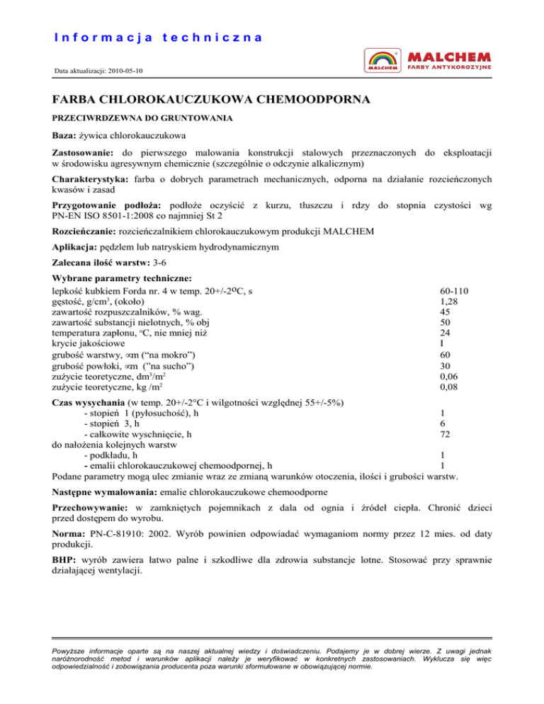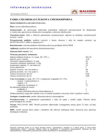Informacja techniczna Data aktualizacji: 2010-05-10 FARBA CHLOROKAUCZUKOWA CHEMOODPORNA PRZECIWRDZEWNA DO GRUNTOWANIA Baza: żywica chlorokauczukowa Zastosowanie: do pierwszego malowania konstrukcji stalowych przeznaczonych do eksploatacji w środowisku agresywnym chemicznie (szczególnie o odczynie alkalicznym) Charakterystyka: farba o dobrych parametrach mechanicznych, odporna na działanie rozcieńczonych kwasów i zasad Przygotowanie podłoża: podłoże oczyścić z kurzu, tłuszczu i rdzy do stopnia czystości wg PN-EN ISO 8501-1:2008 co najmniej St 2 Rozcieńczanie: rozcieńczalnikiem chlorokauczukowym produkcji MALCHEM Aplikacja: pędzlem lub natryskiem hydrodynamicznym Zalecana ilość warstw: 3-6 Wybrane parametry techniczne: lepkość kubkiem Forda nr. 4 w temp. 20+/-2oC, s gęstość, g/cm3, (około) zawartość rozpuszczalników, % wag. zawartość substancji nielotnych, % obj temperatura zapłonu, oC, nie mniej niż krycie jakościowe grubość warstwy, µm (“na mokro”) grubość powłoki, µm (”na sucho”) zużycie teoretyczne, dm3/m2 zużycie teoretyczne, kg /m2 60-110 1,28 45 50 24 I 60 30 0,06 0,08 Czas wysychania (w temp. 20+/-2°C i wilgotności względnej 55+/-5%) - stopień 1 (pyłosuchość), h 1 - stopień 3, h 6 - całkowite wyschnięcie, h 72 do nałożenia kolejnych warstw - podkładu, h 1 - emalii chlorokauczukowej chemoodpornej, h 1 Podane parametry mogą ulec zmianie wraz ze zmianą warunków otoczenia, ilości i grubości warstw. Następne wymalowania: emalie chlorokauczukowe chemoodporne Przechowywanie: w zamkniętych pojemnikach z dala od ognia i źródeł ciepła. Chronić dzieci przed dostępem do wyrobu. Norma: PN-C-81910: 2002. Wyrób powinien odpowiadać wymaganiom normy przez 12 mies. od daty produkcji. BHP: wyrób zawiera łatwo palne i szkodliwe dla zdrowia substancje lotne. Stosować przy sprawnie działającej wentylacji. Powyższe informacje oparte są na naszej aktualnej wiedzy i doświadczeniu. Podajemy je w dobrej wierze. Z uwagi jednak naróżnorodność metod i warunków aplikacji należy je weryfikować w konkretnych zastosowaniach. Wyklucza się więc odpowiedzialność i zobowiązania producenta poza warunki sformułowane w obowiązującej normie.