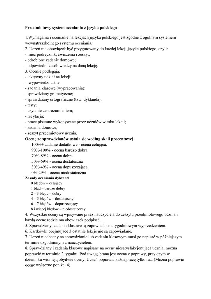 Przedmiotowy system oceniania z języka polskiego 1.Wymagania i ocenianie na lekcjach języka polskiego jest zgodne z ogólnym systemem wewnątrzszkolnego systemu oceniania. 2. Uczeń ma obowiązek być przygotowany do każdej lekcji języka polskiego, czyli: - mieć podręcznik, ćwiczenia i zeszyt; - odrobione zadanie domowe; - odpowiedni zasób wiedzy na daną lekcję. 3. Ocenie podlegają: - aktywny udział na lekcji; - wypowiedzi ustne; - zadania klasowe (wypracowania); - sprawdziany gramatyczne; - sprawdziany ortograficzne (tzw. dyktanda); - testy; - czytanie ze zrozumieniem; - recytacja; - prace pisemne wykonywane przez uczniów w toku lekcji; - zadania domowe; - zeszyt przedmiotowy ucznia. Ocenę ze sprawdzianów ustala się według skali procentowej: 100%+ zadanie dodatkowe - ocena celująca. 90%-100% - ocena bardzo dobra 70%-89% - ocena dobra 50%-69% - ocena dostateczna 30%-49% - ocena dopuszczająca 0%-29% - ocena niedostateczna Zasady oceniania dyktand 0 błędów – celujący 1 błąd – bardzo dobry 2 – 3 błędy – dobry 4 – 5 błędów – dostateczny 6 – 7 błędów – dopuszczający 8 i więcej błędów – niedostateczny 4. Wszystkie oceny są wpisywane przez nauczyciela do zeszytu przedmiotowego ucznia i każdą ocenę rodzic ma obowiązek podpisać. 5. Sprawdziany, zadania klasowe są zapowiadane z tygodniowym wyprzedzeniem. 6. Kartkówki obejmujące 3 ostatnie lekcje nie są zapowiadane. 7. Uczeń nieobecny na sprawdzianie lub zadaniu klasowym musi go napisać w późniejszym terminie uzgodnionym z nauczycielem. 8. Sprawdziany i zadania klasowe napisane na ocenę niesatysfakcjonującą ucznia, można poprawić w terminie 2 tygodni. Pod uwagę brana jest ocena z poprawy, przy czym w dzienniku widnieją obydwie oceny. Uczeń poprawia każdą pracę tylko raz. (Można poprawić ocenę wyłączne poniżej 4). 9. Sprawdziany, testy, zadania klasowe uczniowie otrzymują do analizy na lekcji. Rodzic może je zobaczyć na zebraniach, konsultacjach lub w terminie ustalonym przez nauczyciela. 10. Odpowiedzi ustnych uczeń nie poprawia. 11. Uczeń ma prawo 3 razy w semestrze zgłosić nieprzygotowanie się do lekcji. Przez nieprzygotowanie rozumie się: brak zeszytu, brak zeszytu ćwiczeń, brak zadania domowego, nieprzygotowanie do odpowiedzi. 12. Po wykorzystaniu limitu określonego powyżej uczeń otrzymuje „minus”. Za pięć „minusów” uczeń otrzymuje ocenę niedostateczną. 13. Aktywność nagradzana jest „plusami”. Za 5 „plusów” uczeń otrzymuje ocenę bardzo dobrą 14. Na ocenę roczną i śródroczną uczeń pracuje systematycznie przez cały rok. Ma możliwość poprawy ocen na bieżąco w czasie całego roku szkolnego. 15. Ocenę semestralną i roczną uwzględniają oceny cząstkowe z zachowaniem następującej hierarchii: • pisemne prace klasowe (sprawdziany, testy) • kartkówki • odpowiedzi ustne • prace domowe • aktywność