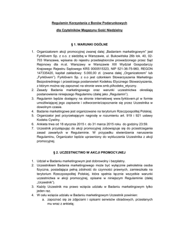 Regulamin Korzystania z Bonów Podarunkowych dla Czytelników Magazynu Gość Niedzielny § 1. WARUNKI OGÓLNE 1. Organizatorem akcji promocyjnej zwanej dalej „Badaniem marketingowym” jest Fyrklövern Sp. z o.o. z siedzibą w Warszawie, ul. Bukowińska 26b lok. 40, 02703 Warszawa, wpisana do rejestru przedsiębiorców prowadzonego przez Sąd Rejonowy dla m.st. Warszawy w Warszawie XIII Wydział Gospodarczy Krajowego Rejestru Sądowego KRS 0000515323, NIP 521-36-75-960, REGON 147335420, kapitał zakładowy: 5.000,00 zł. (zwana dalej „Organizatorem” lub „Fyrklövern”). Fyrklövern Sp. z o.o jest członkiem Stowarzyszenia Marketingu Bezpośredniego i przestrzega postanowień Kodeksu Etycznego Stowarzyszenia, z którym można się zapoznać na stronie www.smb.pl/kodeks_etyczny. 2. Zasady Badania marketingowego oraz warunki uczestnictwa określają postanowienia niniejszego Regulaminu (dalej jako „Regulamin”). 3. Regulamin będzie dostępny na stronie internetowej www.fyrklovern.pl w formie umożliwiającej jego zapisanie i odtworzenie/zapoznanie się przez Uczestnika w dowolnym czasie. 4. Badanie marketingowe jest organizowane na terytorium Rzeczpospolitej Polskiej. 5. Organizator jest przyrzekającym nagrodę w rozumieniu art. 919 i 921 ustawy Kodeks Cywilny. 6. Ankieta trwa od 18 stycznia 2015 r. do 31 marca 2015 roku do godziny 23:59. 7. Uczestnik przystępując do akcji promocyjnej zobowiązuje się do przestrzegania zasad zawartych w Regulaminie. W przypadku stwierdzenia naruszenia Regulaminu, Organizator będzie uprawniony do wykluczenia Uczestnika z akcji promocyjnej. § 2. UCZESTNICTWO W AKCJI PROMOCYJNEJ 1. Udział w Badaniu marketingowym jest dobrowolny i bezpłatny. 2. Uczestnikiem Badania marketingowego może być wyłącznie pełnoletnia osoba fizyczna, posiadająca pełną zdolność do czynności prawnych, zamieszkała na terytorium Rzeczpospolitej Polskiej, która spełnia łącznie wszystkie warunki uczestnictwa w akcji promocyjnej, opisane w niniejszym Regulaminie (dalej „Uczestnik”). 3. Każdy Uczestnik ma prawo wzięcia udziału w Badaniu marketingowym tylko jeden raz. 4. W celu wzięcia udziału w Badaniu marketingowym Uczestnik powinien: a. zapoznać się ze zdjęciami i opisami serwisów obiadowych, przesłanych mu wraz z ankietą; b. udzielić odpowiedzi na dwa pytania zamieszczone w przesłanej ankiecie: Pytanie nr 1: Który z poniższych serwisów podoba się Pani najbardziej? Pytanie nr 2: Który z poniższych serwisów zasługuje Pani zdaniem na drugie miejsce? c. na podstawie wyżej wskazanych pytań wskazać numery wybranych serwisów poprzez ich wpisanie w okienko znajdujące się przy każdym pytaniu; d. uzupełnić dane kontaktowe w rubryce na dole ankiety; e. włożyć uzupełnioną ankietę do koperty zwrotnej i odesłać ją na wskazany tam adres. 5. Uczestnik nie ponosi żadnych kosztów związanych z odesłaniem ankiety – przesyłka jest opłacona przez Organizatora. 6. Po odesłaniu prawidłowo wypełnionej ankiety Uczestnik otrzyma w prezencie Bon Podarunkowy o wartości 100 złotych na zakup produktów marki Fyrklövern. 7. Bon Podarunkowy można zrealizować podczas jednorazowego zakupu produktów marki Fyrklövern u Organizatora za kwotę minimum 600 zł, dokonanego między 19 stycznia 2015 roku, a 31 sierpnia 2015 roku. 8. Wskazana w punkcie powyższym kwota, musi być ceną regularną danego produktu bądź zestawu – Bon Podarunkowy nie łączy się z innymi promocjami ani rabatami i nie obowiązuje przy zakupie produktów objętych promocją, nie można go zrealizować przy zakupie Pakietu Jubileuszowego, ani w przypadku stosowania Cen Kolekcjonerskich. 9. Niewykorzystanie Bonu Podarunkowego, zgodnie z terminem, określonym w punkcie 7 powyżej, jest równoznaczne z utratą ważności Bonu Podarunkowego i nie stanowi podstawy do wystąpienia jego posiadacza wobec Organizatora z roszczeniami w tym zakresie. 10. Bon Podarunkowy jest bonem imiennym (nie na okaziciela) przypisanym do Uczestnika Badania Marketingowego i nie może zostać przekazany osobie trzeciej. 11. Uczestnikom nie przysługuje prawo wymiany Bonu Podarunkowego na nagrodę innego rodzaju, bądź na ekwiwalent pieniężny. 12. Organizator nie odpowiada za zgubienie, uszkodzenie lub ujawnienie numeru kontrolnego Bonu Podarunkowego przez Uczestnika. Organizator nie wydaje duplikatów. 13. Bony zostaną przekazane Uczestnikom po okresie trwania promocji, najpóźniej do dnia 30 kwietnia 2015 roku. § 3. POSTĘPOWANIE REKLAMACYJNE 1. Reklamacje dotyczące akcji promocyjnej mogą być zgłaszane pisemnie na adres Organizatora akcji promocyjnej do dnia 30 września 2015 r. 2. Reklamacja powinna zawierać imię, nazwisko, adres Uczestnika oraz dokładny opis przyczyny reklamacji. 3. Reklamacje będą rozpatrywane przez Organizatora niezwłocznie, w kolejności wpływania, jednak nie później niż w terminie 14 dni od dnia ich otrzymania. Decyzja Organizatora w przedmiocie danej reklamacji jest ostateczna i wiążąca, i zostanie przesłana Uczestnikowi listem poleconym na adres podany w reklamacji. Powyższe postanowienia nie wyłączają możliwości dochodzenia przez Uczestnika swoich praw zgodnie z obowiązującymi przepisami prawa. § 4. OCHRONA DANYCH OSOBOWYCH 1. Administratorem danych osobowych Uczestników akcji promocyjnej jest Organizator. 2. Dane osobowe będą przetwarzane przez Organizatora w celu przeprowadzenia akcji promocyjnej, w tym badania wyników przesłanych ankiet i realizacji Nagród, a w przypadku składanych reklamacji – w celu rozpatrzenia reklamacji. 3. Uczestnikom akcji promocyjnej przysługuje prawo dostępu do treści dotyczących ich danych i ich poprawiania. 4. Podanie danych osobowych jest dobrowolne jednak niezbędne do wzięcia udziału w akcji promocyjnej i uzyskania nagród, określonych w § 2 pkt 6 Regulaminu. § 5. POSTANOWIENIA KOŃCOWE 1. Warunkiem otrzymania nagrody, określonej w § 2 pkt 6 Regulaminu (Bonu Podarunkowe