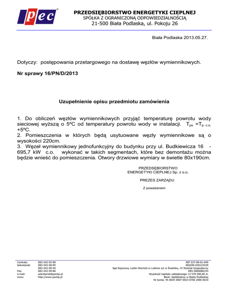 PRZEDSIĘBIORSTWO ENERGETYKI CIEPLNEJ SPÓŁKA Z OGRANICZONĄ ODPOWIEDZIALNOŚCIĄ 21-500 Biała Podlaska, ul. Pokoju 26 Biała Podlaska 2013.05.27. Dotyczy: postępowania przetargowego na dostawę węzłów wymiennikowych. Nr sprawy 16/PN/D/2013 Uzupełnienie opisu przedmiotu zamówienia 1. Do obliczeń węzłów wymiennikowych przyjąć temperaturę powrotu wody sieciowej wyższą o 5ºC od temperatury powrotu wody w instalacji. Tps =Tp c.o. +5ºC. 2. Pomieszczenia w których będą usytuowane węzły wymiennikowe są o wysokości 220cm. 3. Węzeł wymiennikowy jednofunkcyjny do budynku przy ul. Budkiewicza 16 695,7 kW c.o. wykonać w takich segmentach, które bez demontażu można będzie wnieść do pomieszczenia. Otwory drzwiowe wymiary w świetle 80x190cm. PRZEDSĘBIORSTWO ENERGETYKI CIEPLNEJ Sp. z o.o. PREZES ZARZĄDU Z poważaniem Centrala: Sekretariat: Fax: e-mail: www: 083-342-55-98 083-342-58-99 083-342-59-49 083-342-59-88 [email protected] http://www.pecbp.pl NIP 537-00-01-649 REGON 030124339 Sąd Rejonowy Lublin-Wschód w Lublinie z/s w Świdniku, VI Wydział Gospodarczy KRS 0000086154 Wysokość kapitału zakładowego 13 578 500,00 zł. Bank: Spółdzielczy w Białej Podlaskiej Nr konta: 45 8025 0007 0023 8706 2000 0010