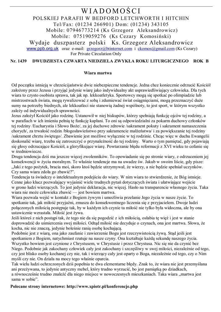WIADOMOŚCI POLSKIEJ PARAFII W BEDFORD LETCHWORTH I HITCHIN Tel/Fax: (01234 266901) Dom: (01234) 343105 Mobile: 07946773214 (Ks Grzegorz Aleksandrowicz) Mobile: 07519059276 (Ks Cezary Komosi ński) Wydaje duszpasterz polski Ks. Grzegorz Aleksandrowicz www.ppb.org.uk oraz e-mail: [email protected] i [email protected] (Ks Cezary) For Private Circulation Only Nr. 1439 DWUDZIESTA CZWARTA NIEDZIELA ZWYKŁA ROKU LITURGICZNEGO ROK B Wiara martwa Od początku istnieją w chrześcijaństwie dwie niebezpieczne tendencje. Jedna chce koniecznie odrzucić Kościół założony przez Jezusa i przyjąć jedynie wiarę jako indywidualny akt usprawiedliwiający człowieka. Dla tych wiara to czysto osobista sprawa, tak jak np. lekkoatletyka. Sportowcy mogą się spotkać po olimpiadzie lub mistrzostwach świata, mogą rywalizować z sobą i zdumiewać świat osiągnięciami, mogą przeznaczyć duże sumy na potrzeby biednych, ale lekkoatleci nie stanowią żadnej wspólnoty, to jest sport, w którym wszystko zależy od indywidualnych sprawności. Jezus założył Kościół jako rodzinę. Ustanowił w niej biskupów, którzy spełniają funkcję ojców tej rodziny, a w parafiach w ich imieniu pełnią tę funkcję kapłani. To oni są odpowiedzialni za pokarm duchowy członków tej rodziny /Eucharystia i Słowo Boże/, za jej duchowe zdrowie /sakrament pokuty i sakrament namaszczenia chorych/, za trwałość rodzin /błogosławieństwo przy sakramencie małżeństwa/ i za powiększanie tej rodziny /sakrament chrztu świętego/. Zbawienie jest możliwe wyłącznie w tej rodzinie. Chcąc więc w duchu Ewangelii doskonalić wiarę, trzeba się zatroszczyć o przynależność do tej rodziny. Warto o tym pamiętać, gdy pojawiają się głosy odrzucające Kościół, a gloryfikujące wiarę. Powtarzanie błędu reformacji z XVI wieku to cofanie się w średniowiecze. Druga tendencja dziś ma jeszcze więcej zwolenników. To opowiadanie się po stronie wiary, z odrzuceniem jej konsekwencji w życiu moralnym. Te właśnie tendencje ma na uwadze św. Jakub w swoim liście, gdy pisze: „Jaki z tego pożytek, bracia moi, skoro ktoś będzie utrzymywał, że wierzy, a nie będzie spełniał uczynków. Czy sama wiara zdoła go zbawić?”. Tendencja ta świadczy o intelektualnym podejściu do wiary. W nim wiara to stwierdzenie, że Bóg istnieje. Cenne jako klucz pozwalający wyjaśnić wiele trudnych pytań dotyczących świata i ułatwiające wejście w grono ludzi wierzących. To jest jedynie deklaracja, nic więcej. Hasło na transparencie własnego życia. Taka wiara nie może człowieka zbawić — jest bowiem martwa. Wiara pozwala wejść w kontakt z Bogiem żywym i umożliwia przelanie Jego życia w nasze życie. To spotkanie tak, jak miłość przyjaźni, zmusza do konsekwentnego liczenia się z przyjacielem. Dwoje ludzi połączonych miłością postępuje tak, by w każdym ich czynie ta miłość nie tylko była widoczna, ale by ona ustawicznie wzrastała. Miłość jest żywa. Jeśli któreś z nich postąpi tak, że tego nie da się pogodzić z ich miłością, osłabia tę więź i jest w stanie doprowadzić do uśmiercenia swej miłości. Odtąd miłość nie decyduje o czynach, ona jest martwa. Słowa, że kocha, nic nie znaczą, jedynie boleśnie ranią osobę kochającą. Podobnie jest z wiarą, ona jako zaufanie i zawierzenie Bogu jest rzeczywistością żywą. Stąd jeśli jest spotkaniem z Bogiem, natychmiast rzutuje na nasze czyny. Ona kształtuje każdą sekundę naszego życia. Wszystko bowiem jest czynione z Chrystusem, w Chrystusie i przez Chrystusa. Nic się nie da czynić bez Niego. Podobnie jak zakochany człowiek cały jest zakochany i szczęśliwy w swej miłości, niezależnie od tego, czy jest blisko osoby kochanej czy nie, tak i wierzący cały jest oparty o Boga, niezależnie od tego, czy o Nim myśli czy nie. On działa na mocy tego właśnie oparcia. Tak wielu ludzi ochrzczonych dziś popełnia te dwa elementarne błędy. Znak to, że wiara nie jest przemyślana ani przeżywana, to jedynie antyczny mebel, który trudno wyrzucić, bo jest pamiątką po dziadkach, a równocześnie trudno znaleźć dla niego miejsce w nowoczesnych mieszkaniach. Taka wiara „martwa jest sama w sobie”. Polecane strony internetowe: http://www.xpiotr.pl/konferencje.php MSZE ŚWIĘTE I NABOŻEŃSTWA w BEDFORD: Charity Reg.No.1119423 Niedziela,13.09.2015 DWUDZIESTA CZWARTA NIEDZIELA ROKU LITURGICZNEGO Godz. 9.30 -W int.dziękczynnej Moniki i Pawła Śmigasiewicz z okazji 10-ej rocznicy ślubu. Godz.11.00 - za dusze ś.p. Ks Leona Kołodziejskiego. Godz.19.00 - O błog. Boże dla Katarzyny i Marcina z okazji 10-ej rocznicy ślubu. Poniedziałek, 14.09. - ŚWIĘTO PODWYŻSZENIA KRZYŻA ŚWIĘTEGO Godz. 9.30 - Intencja wolna. Wtorek. 15.09.2015 Godz. 9.30 - Mszy świętej nie będzie. Środa, 16.09.2015 Godz.19.00 - Wolna intencja. Czwartek,17.09.2015 Godz. 9.30 Godz.19.00 Piątek, 18.09.2015 Godz. 15.00 Św.Stanisława KostkiuisSt Godz. 19.00 - O błogosławieństwo Boże dla Jasia z okazji urodzin. - Intencja wolna. - Intencja wolna . Koronka do Miłosierdzia Bożego. - W pewnej intencji. Sobota, 19.09.2015 Godz. 9.30 Godz. 19.00 Niedziela,20.09.2015 Godz. 9.30 Godz.11.00 Godz.19.00 Poniedziałek, 21.09. Godz. 9.30 Św.Mateusza Ap. Godz.19.00 Wtorek, 22.09.2015 Godz. 9.30 Godz.19.00 Środa, 23.09.2015 Godz. 9.30 Św. Padre Pio Godz.19.00 Czwartek,24.09.2015 Godz. 9.30 Godz.19.00 Piatek, 25.09.2015 Godz.15.00 Godz.19.00 Sobota, 26.09.2015 Godz. 9.30 Godz.19.00 - Intencja wolna. ADORACJA NAJŚWIĘTSZEGO SAKRAMENTU. - Intencja wolna. DWUDZIESTA PIĄTA NIEDZIELA ROKU LITURGICZNEGO Rok B - za dusze ś.p. Haliny Trice - int. matki. - W intencji dzieci i młodzieży na rozpoczęcie nowego roku szkolnego. - za dusze ś.p. Iwony Pilarczyk - int. córki i wnuka. - za dusze ś.p. Wacława, Zygmunta, Mieczysława i Józefa Ławińskich - Intencja wolna int. siostry Anny Nadańskiej z rodziną. - O błog. Boże i po