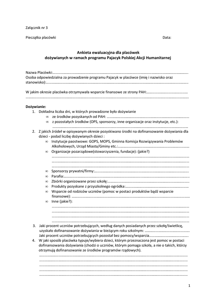 Załącznik nr 3 Pieczątka placówki Data: Ankieta ewaluacyjna dla placówek dożywianych w ramach programu Pajacyk Polskiej Akcji Humanitarnej Nazwa Placówki:…………………………………………………………………………………………………………………………………. Osoba odpowiedzialna za prowadzenie programu Pajacyk w placówce (imię i nazwisko oraz stanowisko):……………………………………………………………………………………………………………………………………….. W jakim okresie placówka otrzymywała wsparcie finansowe ze strony PAH:……………………………………… ……………………………………………………………………………………………………………………………………………………………. Dożywianie: 1. Dokładna liczba dni, w których prowadzone było dożywianie • ze środków pozyskanych od PAH: ……………………………………………………………………………… • z pozostałych środków (OPS, sponsorzy, inne organizacje oraz instytucje, etc.): ……………………………………………………….………………………………………………………………………… 2. Z jakich źródeł w opisywanym okresie pozyskiwano środki na dofinansowanie dożywiania dla dzieci - podad liczbę dożywianych dzieci : • Instytucje paostwowe: GOPS, MOPS, Gminna Komisja Rozwiązywania Problemów Alkoholowych, Urząd Miasta/Gminy etc.:…………………………………………………………………… • Organizacje pozarządowe(stowarzyszenia, fundacje): (jakie?) …………………………………………………………………………………………………………………………………… …………………………………………………………………………………………………………………………………… …………………………………………………………………………………………………………………………………… • Sponsorzy prywatni/firmy:…………………………………………………………………………………………. • Parafia:……………………………………………………………………………………………………………………….. • Zbiórki organizowane przez szkołę:…………………………………………………………………………….. • Produkty pozyskane z przyszkolnego ogródka:…………………………………………………………… • Wsparcie od rodziców uczniów (pomoc w postaci produktów bądź wsparcie finansowe): ………………………………………………………………………………………………………………… • Inne (jakie?): …………………………………………………………………………………………………………………………………… …………………………………………………………………………………………………………………………………… …………………………………………………………………………………………………………………………………… …………………………………………………………………………………………………………………………………… 3. Jaki procent uczniów potrzebujących, według danych posiadanych przez szkołę/świetlicę, uzyskało dofinansowanie dożywiania w bieżącym roku szkolnym: …………………………………………. Jaki procent uczniów potrzebujących pozostał bez pomocy/wsparcia……………………………………. 4. W jaki sposób placówka typuje/wybiera dzieci, którym przeznaczona jest pomoc w postaci dofinansowania dożywiania (chodzi o uczniów, którym pomaga szkoła, a nie o takich, którzy otrzymują dofinansowanie ze środków programów rządowych). ……………………………………………………………………………………………………………………………………………… ……………………………………………………………………………………………………………………………………………… ……………………………………………………………………………………………………………………………………………… ……………………………………………………………………………………………………………………………………………… ……………………………………………………………………………………………………………………………………………… 1 ……………………………………………………………………………………………………………………………………………… ……………………………………………………………………………………………………………………………………………… ………………………………………………………………………………………………………………………………………………. Dotacje: 1. Czy placówka, oprócz środków na dożywianie uczniów, pozyskuje środki zewnętrzne (granty, organizacje pozarządowe, inni sponsorzy) na dodatkową działalnośd? ………………………………………………………………………… Jeśli tak, na jakiego rodzaju działalnośd pozyskiwano środki (można zaznaczyd więcej niż 1 odpowiedź): • Wycieczki • Remonty • Zakup sprzętu • Materiały edukacyjne • Zajęcia edukacyjne • Wynagrodzenie za dodatkowe godziny pracowników • Inne (proszę opisad ) …………………………