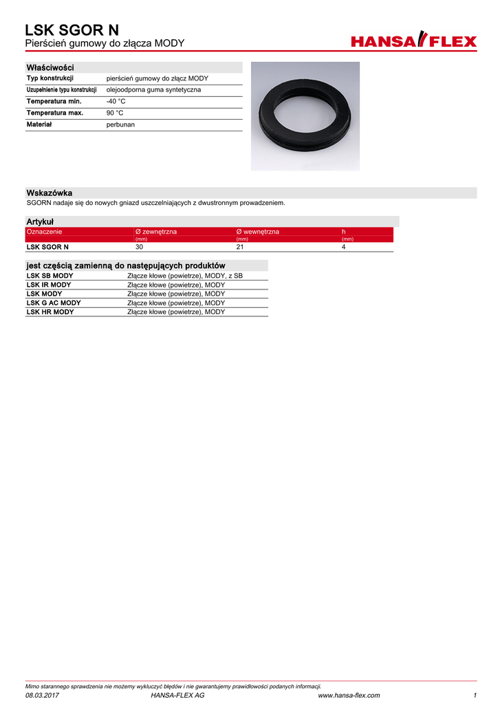 LSK SGOR N Pierścień gumowy do złącza MODY Właściwości Typ konstrukcji pierścień gumowy do złącz MODY Uzupełnienie typu konstrukcji olejoodporna guma syntetyczna Temperatura min. -40 °C Temperatura max. 90 °C Materiał perbunan Wskazówka SGORN nadaje się do nowych gniazd uszczelniających z dwustronnym prowadzeniem. Artykuł Oznaczenie LSK SGOR N Ø zewnętrzna Ø wewnętrzna h (mm) (mm) (mm) 30 21 4 jest częścią zamienną do następujących produktów LSK LSK LSK LSK LSK SB MODY IR MODY MODY G AC MODY HR MODY Złącze kłowe (powietrze), MODY, z SB Złącze kłowe (powietrze), MODY Złącze kłowe (powietrze), MODY Złącze kłowe (powietrze), MODY Złącze kłowe (powietrze), MODY Mimo starannego sprawdzenia nie możemy wykluczyć błędów i nie gwarantujemy prawidłowości podanych informacji. 08.03.2017 HANSA-FLEX AG www.hansa-flex.com 1