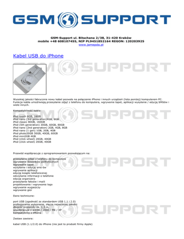 GSM-Support ul. Bitschana 2/38, 31-420 Kraków mobile +48 608107455, NIP PL9451852164 REGON: 120203925 www.jamepda.pl Kabel USB do iPhone Wysokiej jakości fabrycznie nowy kabel pozwala na połączenie iPhone i innych urządzeń (lista poniżej) komputerem PC. Funkcje kabla umożliwiają przesyłanie zdjęć z telefonu do komputera, wgrywanie tapet, aplikacji wysyłanie / edycję SMSów i wiele innych. Kompatybilność kabla: iPod iPod iPod iPod iPod iPod iPod iPod iPod iPod touch 8GB, 16GB nano (3rd generation)4GB, 8GB classic 80GB, 160GB (5th generation) 30GB, 60GB, 80GB nano (2nd generation) 2GB, 4GB, 8GB nano (1 gen) 1GB, 2GB, 4GB photo20GB 30GB, 40GB, 60GB mini2GB 4GB (click wheel) 20GB, 40GB (click wheel) 20GB, 40GB Przewód współpracuje z oprogramowaniem pozwalającym na: przesyłanie zdjęć z telefonu do komputera wgrywanie dzwonków polifonicznych wgrywanie tapet wysyłanie i edycję sms-ów wgrywanie aplikacji edycję książki telefonicznej odczytanie informacji o telefonie edycję organizera przesyłanie faksów i maili projektowanie i wgrywanie logo wgrywanie wygaszczy wgrywanie gier Dane techniczne: port USB (zgodność ze standardem USB 1.1 i 2.0) profesjonalne wykonanie, złącza najwyższej jakości długość przewodu ok. 1,3 m. współpracuje z win98 / 2000 / ME / XP kompatybilny z iPhone Zestaw zawiera: kabel USB (1.1/2.0) do iPhone (nie jest to produkt firmy Apple) ©2012 www.jamepda.pl Opis ten nie stanowi oferty w rozumieniu Kodeksu Cywilnego. GSM-Support zastrzega sobie prawo do możliwych błędów w opisie produktu. Prosimy o weryfikację z Państwa strony, a w razie wątpliwości o kontakt. GSM-Support ul. Bitschana 2/38 31-420 Kraków POLSKA tel. 608107455 e-mail: [email protected] Powered by TCPDF (www.tcpdf.org)