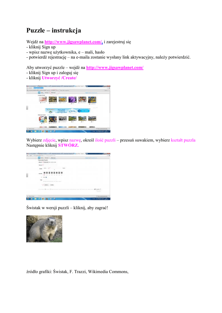 Puzzle – instrukcja Wejdź na http://www.jigsawplanet.com/, i zarejestruj się - kliknij Sign up - wpisz nazwę użytkownika, e – mali, hasło - potwierdź rejestrację – na e-maila zostanie wysłany link aktywacyjny, należy potwierdzić. Aby utworzyć puzzle – wejdź na http://www.jigsawplanet.com/ - kliknij Sign up i zaloguj się - kliknij Utworzyć /Create/ Wybierz zdjęcie, wpisz nazwę, określ ilość puzzli – przesuń suwakiem, wybierz kształt puzzla Następnie kliknij STWÓRZ. Świstak w wersji puzzli – kliknij, aby zagrać! 12 źródło grafiki: Świstak, F. Trazzi, Wikimedia Commons,