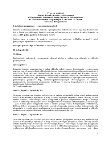 Program praktyki z Pediatrii i pielęgniarstwa pediatrycznego w Karkonoskiej Państwowej Szkole WyŜszej w Jeleniej Górze dla studentów studiów stacjonarnych II i III roku – 4 i 5 sem. Kierunek: Pielęgniarstwo I. ZałoŜenia programowe – organizacyjne praktyk Praktyka z zakresu przedmiotu: Pediatria i pielęgniarstwo pediatryczne trwa 4 tygodnie. Realizowana jest w formie praktyki ciągłej. Praktyka powinna być realizowana w wymiarze 8 godzin dziennie, co stanowi 160 godzin (godzina dydaktyczna-45min.) Student moŜe przystąpić do praktyki zawodowej po zaliczeniu wykładów, ćwiczeń i zajęć praktycznych z przedmiotu w danym semestrze. Praktyka powinna być realizowana w oddziale pediatrycznym. II. Cele praktyki: 1) Główny Doskonalenie umiejętności zastosowania zdobytej wiedzy w praktycznym działaniu w oddziale pediatrycznym. 2) Szczegółowe: Poznanie struktury organizacyjnej i zadań oddziału pediatrycznego, doskonalenie i wykonywanie pracy na róŜnych stanowiskach oddziału dziecięcego, doskonalenie umiejętności komunikowania się z dzieckiem i jego rodzicami, doskonalenie planowania i oceniania opieki nad dzieckiem chorym, doskonalenie umiejętności prowadzenia dokumentacji w oddziale dziecięcym, prowadzenie edukacji zdrowotnej dla dziecka i jego rodziny – samokontroli i samooceny w wykonywanych czynnościach, przestrzeganie przepisów bhp, sanitarno-epidemiologicznych obowiązujących w oddziale pediatrycznym, doskonalenie umiejętności współpracy w zespole terapeutycznym i z rodzicami, zapobieganie skutkom hospitalizacji. 3) Treści kształcenia: Sem.4 – 80 godz. – 2 punkt ECTS Struktura organizacyjna oddziału pediatrycznego; zadania pielęgniarki pediatrycznej; dokumentacja dziecka i dokumentacja wynikająca z pracy oddziału; etiologia, patogeneza, obraz kliniczny chorób układu: krąŜenia, oddechowego; udział pielęgniarki w procesie diagnozowania, terapii i rozwoju dzieci w oddziale pediatrycznym; proces pielęgnowania w chorobach: układu krąŜenia, oddechowego - jako metoda pracy pielęgniarki, teorie i modele pielęgnowania: F.Nightingale, V.Henderson, D.Orem, C.Roy; gromadzenie informacji: wywiad, obserwacja, pomiar, analiza dokumentacji; rola pielęgniarki w zespole interdyscyplinarnym; przestrzeganie norm i zasad obowiązujących w oddziale pediatrycznym, odpowiedzialność pielęgniarki za podejmowane decyzje. Sem.5 – 80 godz. – 2 punkt ECTS Struktura organizacyjna oddziału pediatrycznego; zadania pielęgniarki pediatrycznej; dokumentacja dziecka i dokumentacja wynikająca z pracy oddziału; etiologia, patogeneza, obraz kliniczny chorób układu: pokarmowego, moczowego, krwiotwórczego, kostno – stawowego i skóry; udział pielęgniarki w procesie diagnozowania, terapii i rozwoju dzieci w oddziale pediatrycznym; proces pielęgnowania w chorobach: układu pokarmowego, moczowego, krwiotwórczego, kostno – stawowego i skóry - jako 1 metoda pracy pielęgniarki, teorie i modele pielęgnowania: F.Nightingale, V.Henderson, D.Orem, C.Roy; gromadzenie informacji: wywiad, obserwacja, pomiar, analiza dokumentacji; rola pielęgniarki w zespole interdyscyplinarnym; przestrzeganie norm i zasad obowiązujących w oddziale pediatrycznym, odpowiedzialność pielęgniarki za podejmowane decyzje. 4) Umiejętności wynikające z realizacji praktyki: W wyniku realizacji praktyk student powinien umieć: określić przyczyny, objawy i metody leczenia chorób wieku dziecięcego; określić rolę i odpowiedzialność pielęgniarki w procesie diagnozowania i leczenia; znać zakres opieki pielęgniarskiej; znać normy i interpretować wyniki badań diagnostycznych przeprowadzonych w oddziale pediatrycznym; róŜnicować objawy chorób wieku dziecięcego i wykorzystywać je w procesie pielęgnowania; przygotować dziecko do badań diagnostycznych, uczestniczyć w badaniach, opiekować się dzieckiem po badaniach; zastosować nabyte umiejętności z zakresu podstaw pielęgniarstwa dostosowując je do opieki nad dzieckiem w oddziale pediatrycznym; zastosować nabyte umiejętności zabiegowe, doskonalić technikę wykonywanych zabiegów mających na celu wsparcie procesu leczenia; wdroŜyć do działalności praktycznej treści zawarte w teorii pielęgnowania: Nightingale, Henderson, Orem, Roy; obserwować i współpracować z dzieckiem i jego rodziną w róŜnych okresach choroby; rozpoznawać problemy i wdraŜać odpowiednie działania zgodne z załoŜeniami procesu pielęgnowania w schorzeniach wieku dziecięcego w róŜnych okresach choroby w obrębie układów: oddechowego, krąŜenia, pokarmowego, moczowego, ruchu, krwiotwórczego i skóry; prowadzić dokumentację dziecka i dokumentację wynikającą z pracy oddziału; posługiwać się terminologią zawodową; posługiwać się sprzętem stosowanym w ramach pielęgnacji dziecka jak i stosowanym w terapii; współpracować z zespołem terapeutycznym, uczestniczyć w działaniach profilaktycznych i edukacji zdrowotnej wobec dziecka i jego rodziny. 5) Postawy wykazywane i osiągnięte przez studenta w toku praktyki. Sumienność i dokładność w realizowaniu zadań, odpowiedzialność za podejmowane decyzje, aktywność i zaangaŜowanie w pracy; humanitaryzm i szacunek wobec dziecka i jego rodziny. Literatura podstawowa: 1. Mary E Muscaari wydanie polskie: K. Bernat Pediatria i pielęgniarstwo pediatryczne Wydaw. Czelej, Lublin 2005 2. Władysław Pawlaczyk, Pielęgniarstwo pediatryczne, P.Z.W.L. Warszawa 2007 3. B.Górnicki – Pediatria tom I i II P.Z.W.L. Warszawa 1995 4. Karla L. Luxner Pielęgniarstwo pediatryczne Delmara ElsevierUrban&Partner Wrocław 2006 5. Małgorzata Brykczyńska Pielęgniarstwo pediatryczne - zagadnienia etyczne P.Z.W.L. Warszawa 2006 6. Ewa Barczykowska wydanie zbiorowe Pielęgniarstwo w pediatrii Wyd. Medyczne Borgis Warszawa 2006 7. Wybrane standardy i procedury w pielęgniarstwie pediatrycznym.- Lublin: Wydaw. Czelej, 2001. 8. Algranati, P. S. Pediatria : Urban & P
