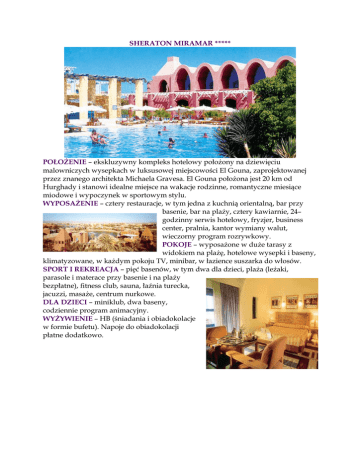 SHERATON MIRAMAR ***** POŁOŻENIE – ekskluzywny kompleks hotelowy położony na dziewięciu malowniczych wysepkach w luksusowej miejscowości El Gouna, zaprojektowanej przez znanego architekta Michaela Gravesa. El Gouna położona jest 20 km od Hurghady i stanowi idealne miejsce na wakacje rodzinne, romantyczne miesiące miodowe i wypoczynek w sportowym stylu. WYPOSAŻENIE – cztery restauracje, w tym jedna z kuchnią orientalną, bar przy basenie, bar na plaży, cztery kawiarnie, 24– godzinny serwis hotelowy, fryzjer, business center, pralnia, kantor wymiany walut, wieczorny program rozrywkowy. POKOJE – wyposażone w duże tarasy z widokiem na plażę, hotelowe wysepki i baseny, klimatyzowane, w każdym pokoju TV, minibar, w łazience suszarka do włosów. SPORT I REKREACJA – pięć basenów, w tym dwa dla dzieci, plaża (leżaki, parasole i materace przy basenie i na plaży bezpłatne), fitness club, sauna, łaźnia turecka, jacuzzi, masaże, centrum nurkowe. DLA DZIECI – miniklub, dwa baseny, codziennie program animacyjny. WYŻYWIENIE – HB (śniadania i obiadokolacje w formie bufetu). Napoje do obiadokolacji płatne dodatkowo.