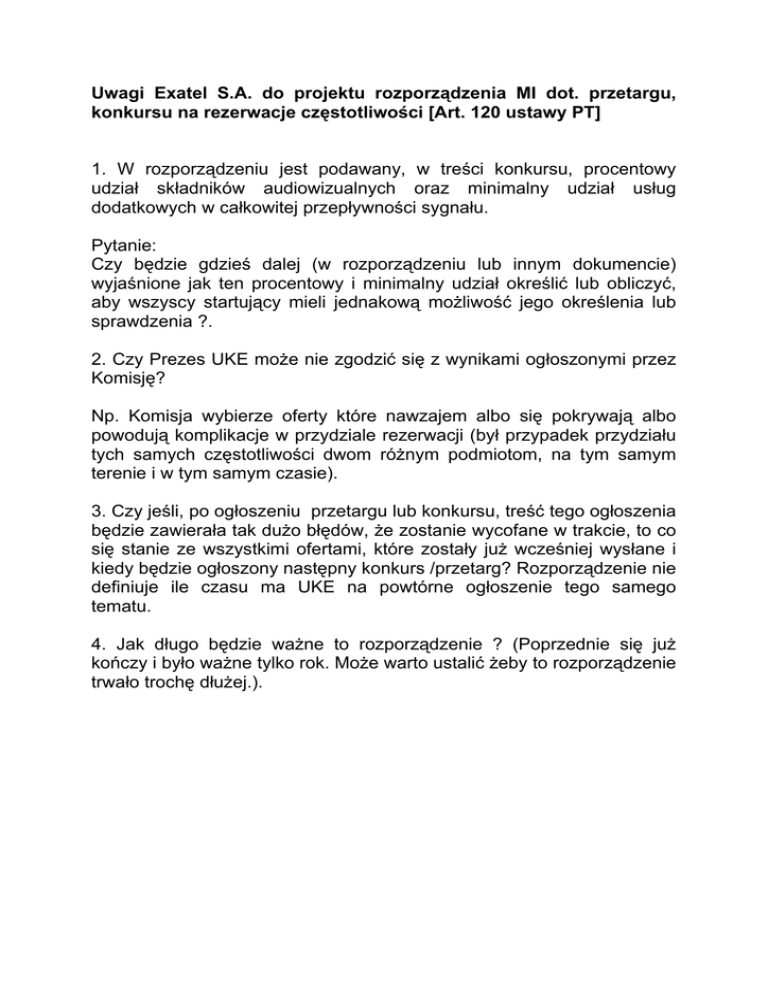 Uwagi Exatel S.A. do projektu rozporządzenia MI dot. przetargu, konkursu na rezerwacje częstotliwości [Art. 120 ustawy PT] 1. W rozporządzeniu jest podawany, w treści konkursu, procentowy udział składników audiowizualnych oraz minimalny udział usług dodatkowych w całkowitej przepływności sygnału. Pytanie: Czy będzie gdzieś dalej (w rozporządzeniu lub innym dokumencie) wyjaśnione jak ten procentowy i minimalny udział określić lub obliczyć, aby wszyscy startujący mieli jednakową możliwość jego określenia lub sprawdzenia ?. 2. Czy Prezes UKE może nie zgodzić się z wynikami ogłoszonymi przez Komisję? Np. Komisja wybierze oferty które nawzajem albo się pokrywają albo powodują komplikacje w przydziale rezerwacji (był przypadek przydziału tych samych częstotliwości dwom różnym podmiotom, na tym samym terenie i w tym samym czasie). 3. Czy jeśli, po ogłoszeniu przetargu lub konkursu, treść tego ogłoszenia będzie zawierała tak dużo błędów, że zostanie wycofane w trakcie, to co się stanie ze wszystkimi ofertami, które zostały już wcześniej wysłane i kiedy będzie ogłoszony następny konkurs /przetarg? Rozporządzenie nie definiuje ile czasu ma UKE na powtórne ogłoszenie tego samego tematu. 4. Jak długo będzie ważne to rozporządzenie ? (Poprzednie się już kończy i było ważne tylko rok. Może warto ustalić żeby to rozporządzenie trwało trochę dłużej.).