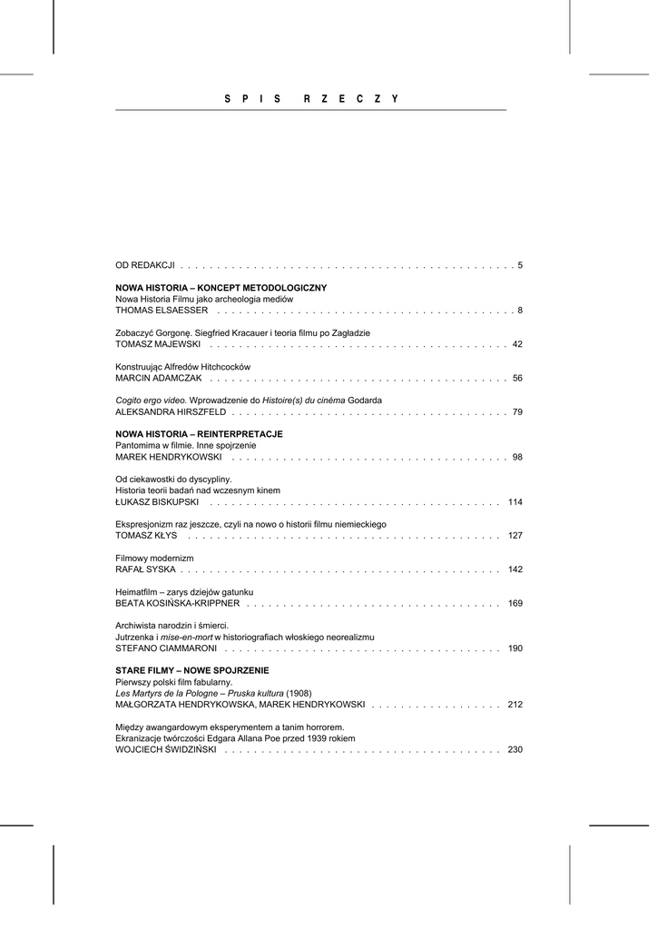 S P I S R Z E C Z Y OD REDAKCJI . . . . . . . . . . . . . . . . . . . . . . . . . . . . . . . . . . . . . . . . . . . . . . 5 NOWA HISTORIA – KONCEPT METODOLOGICZNY Nowa Historia Filmu jako archeologia mediów THOMAS ELSAESSER . . . . . . . . . . . . . . . . . . . . . . . . . . . . . . . . . . . . . . . . . 8 Zobaczyć Gorgone˛. Siegfried Kracauer i teoria filmu po Zagładzie TOMASZ MAJEWSKI . . . . . . . . . . . . . . . . . . . . . . . . . . . . . . . . . . . . . . . . . 42 Konstruuja˛c Alfredów Hitchcocków MARCIN ADAMCZAK . . . . . . . . . . . . . . . . . . . . . . . . . . . . . . . . . . . . . . . . . 56 Cogito ergo video. Wprowadzenie do Histoire(s) du cinéma Godarda ALEKSANDRA HIRSZFELD . . . . . . . . . . . . . . . . . . . . . . . . . . . . . . . . . . . . . . 79 NOWA HISTORIA – REINTERPRETACJE Pantomima w filmie. Inne spojrzenie MAREK HENDRYKOWSKI . . . . . . . . . . . . . . . . . . . . . . . . . . . . . . . . . . . . . . 98 Od ciekawostki do dyscypliny. Historia teorii badań nad wczesnym kinem ŁUKASZ BISKUPSKI . . . . . . . . . . . . . . . . . . . . . . . . . . . . . . . . . . . . . . . . 114 Ekspresjonizm raz jeszcze, czyli na nowo o historii filmu niemieckiego TOMASZ KŁYS . . . . . . . . . . . . . . . . . . . . . . . . . . . . . . . . . . . . . . . . . . . 127 Filmowy modernizm RAFAŁ SYSKA . . . . . . . . . . . . . . . . . . . . . . . . . . . . . . . . . . . . . . . . . . . . 142 Heimatfilm – zarys dziejów gatunku BEATA KOSIŃSKA-KRIPPNER . . . . . . . . . . . . . . . . . . . . . . . . . . . . . . . . . . . 169 Archiwista narodzin i śmierci. Jutrzenka i mise-en-mort w historiografiach włoskiego neorealizmu STEFANO CIAMMARONI . . . . . . . . . . . . . . . . . . . . . . . . . . . . . . . . . . . . . . 190 STARE FILMY – NOWE SPOJRZENIE Pierwszy polski film fabularny. Les Martyrs de la Pologne – Pruska kultura (1908) MAŁGORZATA HENDRYKOWSKA, MAREK HENDRYKOWSKI . . . . . . . . . . . . . . . . . . 212 Mie˛dzy awangardowym eksperymentem a tanim horrorem. Ekranizacje twórczości Edgara Allana Poe przed 1939 rokiem WOJCIECH ŚWIDZIŃSKI . . . . . . . . . . . . . . . . . . . . . . . . . . . . . . . . . . . . . . 230 S P I S R Z E C Z Y Na nabrzeżach Elii Kazana w meandrach historii kina MARCIN PIEŃKOWSKI . . . . . . . . . . . . . . . . . . . . . . . . . . . . . . . . . . . . . . . 243 Socrealizm à rebours. Skowronki na uwie˛zi Jiřiego Menzla MACIEJ ROBERT . . . . . . . . . . . . . . . . . . . . . . . . . . . . . . . . . . . . . . . . . . 261 Nasza komedia narodowa TADEUSZ LUBELSKI . . . . . . . . . . . . . . . . . . . . . . . . . . . . . . . . . . . . . . . . 286 OKIEM I UCHEM Kino spontaniczne MARCIN GIŻYCKI . . . . . . . . . . . . . . . . . . . . . . . . . . . . . . . . . . . . . . . . . . 304 KSIA˛ŻKI O FILMIE Dynamika historii TERESA RUTKOWSKA . . . . . . . . . . . . . . . . . . . . . . . . . . . . . . . . . . . . . . . 309 Podzwonne dla filmowego Lwowa TADEUSZ LUBELSKI . . . . . . . . . . . . . . . . . . . . . . . . . . . . . . . . . . . . . . . . 315 Munk – artysta niezasta˛piony BEATA KOSIŃSKA-KRIPPNER . . . . . . . . . . . . . . . . . . . . . . . . . . . . . . . . . . . 319 Jak mamy żyć ŁUKASZ MACIEJEWSKI . . . . . . . . . . . . . . . . . . . . . . . . . . . . . . . . . . . . . . 327 Krakowski projekt czterotomowej Historii kina TADEUSZ LUBELSKI . . . . . . . . . . . . . . . . . . . . . . . . . . . . . . . . . . . . . . . . 332 KRONIKA Kino polskie w kontekście mie˛dzynarodowym. Manchester, 3-5 grudnia 2009 KAROLINA KOSIŃSKA . . . . . . . . . . . . . . . . . . . . . . . . . . . . . . . . . . . . . . . 336 POŻEGNANIA Partia szachów z Ojcem. Jerzy Giżycki (1919-2009) MARCIN GIŻYCKI . . . . . . . . . . . . . . . . . . . . . . . . . . . . . . . . . . . . . . . . . . 342 NOTY O AUTORACH . . . . . . . . . . . . . . . . . . . . . . . . . . . . . . . . . . . . . . . . 345 SUMMARY . . . . . . . . . . . . . . . . . . . . . . . . . . . . . . . . . . . . . . . . . . . . . . 347 TABLE DES MATIÈRES . . . . . . . . . . . . . . . . . . . . . . . . . . . . . . . . . . . . . . . 352