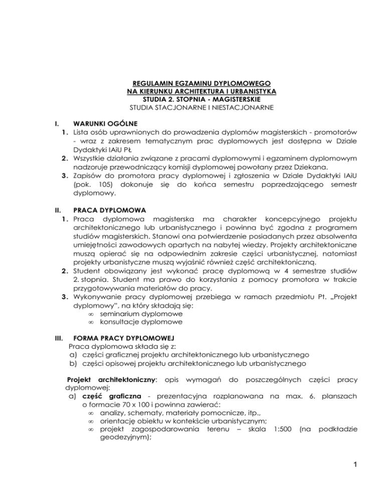 REGULAMIN EGZAMINU DYPLOMOWEGO NA KIERUNKU ARCHITEKTURA I URBANISTYKA STUDIA 2. STOPNIA - MAGISTERSKIE STUDIA STACJONARNE I NIESTACJONARNE I. WARUNKI OGÓLNE 1. Lista osób uprawnionych do prowadzenia dyplomów magisterskich - promotorów - wraz z zakresem tematycznym prac dyplomowych jest dostępna w Dziale Dydaktyki IAiU PŁ 2. Wszystkie działania związane z pracami dyplomowymi i egzaminem dyplomowym nadzoruje przewodniczący komisji dyplomowej powołany przez Dziekana. 3. Zapisów do promotora pracy dyplomowej i zgłoszenia w Dziale Dydaktyki IAiU (pok. 105) dokonuje się do końca semestru poprzedzającego semestr dyplomowy. II. PRACA DYPLOMOWA 1. Praca dyplomowa magisterska ma charakter koncepcyjnego projektu architektonicznego lub urbanistycznego i powinna być zgodna z programem studiów magisterskich. Stanowi ona potwierdzenie posiadanych przez absolwenta umiejętności zawodowych opartych na nabytej wiedzy. Projekty architektoniczne muszą opierać się na odpowiednim zakresie części urbanistycznej, natomiast projekty urbanistyczne muszą wyjaśnić również część architektoniczną. 2. Student obowiązany jest wykonać pracę dyplomową w 4 semestrze studiów 2. stopnia. Student ma prawo do korzystania z pomocy promotora w trakcie przygotowywania materiałów do pracy. 3. Wykonywanie pracy dyplomowej przebiega w ramach przedmiotu Pt. „Projekt dyplomowy”, na który składają się: • seminarium dyplomowe • konsultacje dyplomowe III. FORMA PRACY DYPLOMOWEJ Praca dyplomowa składa się z: a) części graficznej projektu architektonicznego lub urbanistycznego b) części opisowej projektu architektonicznego lub urbanistycznego Projekt architektoniczny: opis wymagań do poszczególnych części pracy dyplomowej: a) część graficzna - prezentacyjna rozplanowana na max. 6. planszach o formacie 70 x 100 i powinna zawierać: • analizy, schematy, materiały pomocnicze, itp., • orientację obiektu w kontekście urbanistycznym; • projekt zagospodarowania terenu – skala 1:500 (na podkładzie geodezyjnym); 1 • b) uzgodnione z promotorem opracowanie projektu odpowiednie dla przyjętego zakresu i skali opracowania; część opisowa - wykonana w technice trwałej, wydrukowana i oprawiona w formacie A4, powinna zawierać następujące elementy merytoryczne: • • • • • • • • • • • • • wstęp uzasadniający podjęty temat pracy, w którym określony jest przedmiot i zakres opracowania; krótkie omówienie zagadnienia opracowania; analizy uwarunkowań dotyczące kontekstu historycznego, funkcjonalnoprzestrzennego, zagadnień formalno-prawnych; opis idei projektu architektonicznego; szczegółowy opis układu funkcjonalnego i przestrzennego obiektu; opis rozwiązań konstrukcyjnych i materiałowych; opis rozwiązań instalacyjnych; rozwiązania ochrony przeciwpożarowej; literatura przedmiotu; w wykazie bibliograficznym należy podać zapis według schematu – nazwisko i imię autora, tytuł, wydawnictwo, miejsce wydania, rok wydania, stronice; informacja o źródłach/miejscach pochodzenia materiałów, zdjęć wykorzystywanych w pracy; rysunki wyjaśniające koncepcję architektoniczną; pomniejszone wszystkie plansze prezentacyjne; płyta CD obejmująca całość opracowania Projekt urbanistyczny: opis wymagań do poszczególnych części pracy dyplomowej: a) część graficzna - prezentacyjna rozplanowana na max. 6. planszach o formacie 70 x 100 i powinna zawierać: • graficzne przedstawienie analiz stanu istniejącego w zakresie niezbędnym do wyciągnięcia wniosków i przesłanek projektowych, oraz wiedzy o stanie formalno-prawnym; • koncepcję urbanistyczną o zasięgu i skali odpowiednich do problematyki podjętego tematu; • opracowanie fragmentu projektu w skali dobranej stosownie do problematyki; • uzgodnione z promotorem opracowanie projektu odpowiednie dla przyjętego zakresu i skali opracowania; b) część opisowa - wykonana w technice trwałej, wydrukowana i oprawiona w formacie A4, powinna zawierać następujące elementy merytoryczne: • • • • • • • wstęp uzasadniający podjęty temat pracy, w którym określony jest przedmiot i zakres opracowania; krótkie omówienie zagadnienia opracowania; analizy uwarunkowań dotyczące kontekstu historycznego, funkcjonalnoprzestrzennego, zagadnień formalno-prawnych; opis idei projektu urbanistycznego; opis koncepcji układu przestrzennego i funkcjonalnego prezentowanego projektu; opis zagadnień krajobrazowych, przyrodniczych, itp.; zestawienie wszystkich niezbędnych wskaźników urbanistycznych; 2 • • • • • literatura przedmiotu; w wykazie bibliograficznym należy podać zapis według schematu – nazwisko i imię autora, tytuł, wydawnictwo, miejsce wydania, rok wydania, stronice; informacja o źródłach/miejscach pochodzenia materiałów, zdjęć wykorzystywanych w pracy; rysunki wyjaśniające koncepcję urbanistyczną; pomniejszone wszystkie plansze prezentacyjne; płyta CD obejmująca całość opracowania IV. PRZYJĘCIE PRACY DYPLOMOWEJ 1. Kierujący pracą potwierdza wykonanie pracy dyplomowej podpisując podanie do dziekana o dopuszczenie do egzaminu dyplomowego oraz dokonuje jej oceny (opisowej i liczbowej) na formularzu – załącznik nr 3. Dokonuje wpisu w Zintegrowanym Terminalu Nauczyciela (zal.) 2. Prodziekani ds. studiów stacjonarnych i niestacjonarnych na wniosek Przewodniczącego Komisji Egzaminu Dyplomowego wyznaczają recenzenta pracy, który przygotowuje recenzję w ciągu jednego tygodnia po otrzymaniu pracy, nie później niż trzy dni przed terminem obrony i dostarcza ją do dziekanatu – jest to warunek dopuszczenia do egzaminu. V. EGZAMIN DYPLOMOWY 1. Warunkiem dopuszczenia do egzaminu dyplomowego jest: a) uzyskanie odpowiedniej liczby punktów ECTS, wynikającej z programu studiów, oraz spełnienie pozostałych wymagań wynikających z programu studiów; b) uzyskanie oceny pracy dyplomowej co najmniej „trzy”; c) złożenie