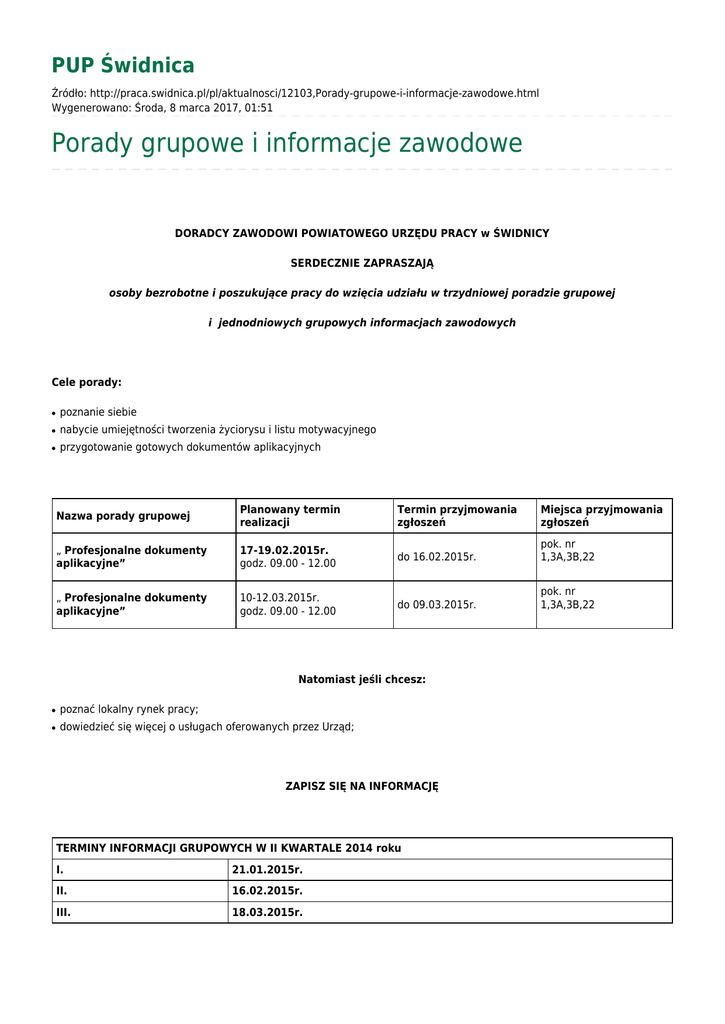 PUP Świdnica Źródło: http://praca.swidnica.pl/pl/aktualnosci/12103,Porady-grupowe-i-informacje-zawodowe.html Wygenerowano: Środa, 8 marca 2017, 01:51 Porady grupowe i informacje zawodowe DORADCY ZAWODOWI POWIATOWEGO URZĘDU PRACY w ŚWIDNICY SERDECZNIE ZAPRASZAJĄ osoby bezrobotne i poszukujące pracy do wzięcia udziału w trzydniowej poradzie grupowej i jednodniowych grupowych informacjach zawodowych Cele porady: ● poznanie siebie ● nabycie umiejętności tworzenia życiorysu i listu motywacyjnego ● przygotowanie gotowych dokumentów aplikacyjnych Nazwa porady grupowej Planowany termin realizacji Termin przyjmowania zgłoszeń Miejsca przyjmowania zgłoszeń „ Profesjonalne dokumenty aplikacyjne” 17-19.02.2015r. godz. 09.00 - 12.00 do 16.02.2015r. pok. nr 1,3A,3B,22 „ Profesjonalne dokumenty aplikacyjne” 10-12.03.2015r. godz. 09.00 - 12.00 do 09.03.2015r. pok. nr 1,3A,3B,22 Natomiast jeśli chcesz: ● poznać lokalny rynek pracy; ● dowiedzieć się więcej o usługach oferowanych przez Urząd; ZAPISZ SIĘ NA INFORMACJĘ TERMINY INFORMACJI GRUPOWYCH W II KWARTALE 2014 roku I. 21.01.2015r. II. 16.02.2015r. III. 18.03.2015r. Miejsce udzielania informacji: Osoby chętne do uczestnictwa w zajęciach prosimy o kontakt z doradcą zawodowym Powiatowy Urząd Pracy w Świdnicy, ul. M. Skłodowskiej - Curie 5, pok. 1, 3A, 3B, 22 tel. 74/856-18-06 ; 74/ 856-18-35 ; 74/ 856-18-31 ; 74/856-18-47 ; 74/856-18-49 Metryka strony Data publikacji 31.12.2014 Rejestr zmian Osoba publikująca: Krzysztof Bober Autor: Krzysztof Bober Liczba wejść: 814 Drukuj Generuj PDF Powiadom znajomego Wstecz