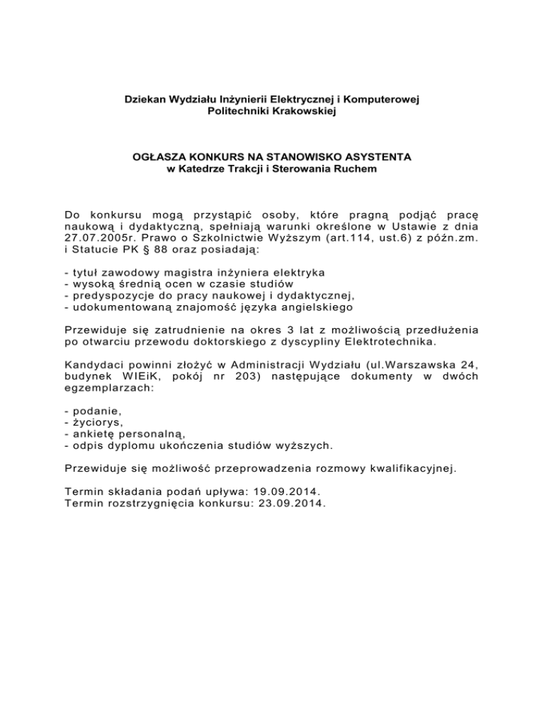 Dziekan Wydziału Inżynierii Elektrycznej i Komputerowej Politechniki Krakowskiej OGŁASZA KONKURS NA STANOWISKO ASYSTENTA w Katedrze Trakcji i Sterowania Ruchem Do konkursu mogą przystąpić osoby, które pragną podjąć pracę naukową i dydaktyczną, spełniają warunki określone w Ustawie z dnia 27.07.2005r. Prawo o Szkolnictwie W yższym (art.114, ust.6) z późn.zm. i Statucie PK § 88 oraz posiadają: - tytuł zawodowy magistra inżyniera elektryka wysoką średnią ocen w czasie studiów predyspozycje do pracy naukowej i dydaktycznej, udokumentowaną znajomość języka angielskiego Przewiduje się zatrudnienie na okres 3 lat z możliwością przedłużenia po otwarciu przewodu doktorskiego z dyscypliny Elektrotechnika. Kandydaci powinni złożyć w Administracji W ydziału (ul.W arszawska 24, budynek W IEiK, pokój nr 203) następujące dokumenty w dwóch egzemplarzach: - podanie, życiorys, ankietę personalną, odpis dyplomu ukończenia studiów wyższych. Przewiduje się możliwość przeprowadzenia rozmowy kwalifikacyjnej. Termin składania podań upływa: 19.09.2014. Termin rozstrzygnięcia konkursu: 23.09.2014.