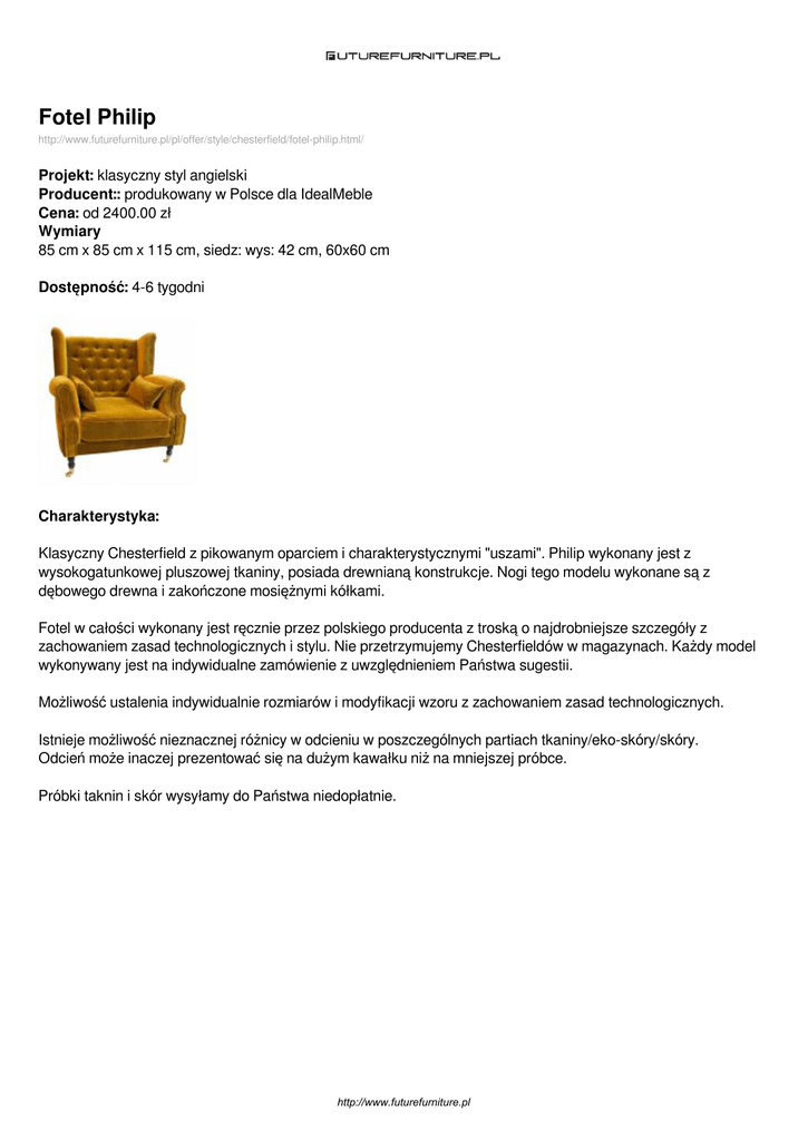 Fotel Philip http://www.futurefurniture.pl/pl/offer/style/chesterfield/fotel-philip.html/ Projekt: klasyczny styl angielski Producent:: produkowany w Polsce dla IdealMeble Cena: od 2400.00 zł Wymiary 85 cm x 85 cm x 115 cm, siedz: wys: 42 cm, 60x60 cm Dostępność: 4-6 tygodni Charakterystyka: Klasyczny Chesterfield z pikowanym oparciem i charakterystycznymi "uszami". Philip wykonany jest z wysokogatunkowej pluszowej tkaniny, posiada drewnianą konstrukcje. Nogi tego modelu wykonane są z dębowego drewna i zakończone mosiężnymi kółkami. Fotel w całości wykonany jest ręcznie przez polskiego producenta z troską o najdrobniejsze szczegóły z zachowaniem zasad technologicznych i stylu. Nie przetrzymujemy Chesterfieldów w magazynach. Każdy model wykonywany jest na indywidualne zamówienie z uwzględnieniem Państwa sugestii. Możliwość ustalenia indywidualnie rozmiarów i modyfikacji wzoru z zachowaniem zasad technologicznych. Istnieje możliwość nieznacznej różnicy w odcieniu w poszczególnych partiach tkaniny/eko-skóry/skóry. Odcień może inaczej prezentować się na dużym kawałku niż na mniejszej próbce. Próbki taknin i skór wysyłamy do Państwa niedopłatnie. http://www.futurefurniture.pl http://www.futurefurniture.pl Zdjęcia produktu: http://www.futurefurniture.pl Powered by TCPDF (www.tcpdf.org)