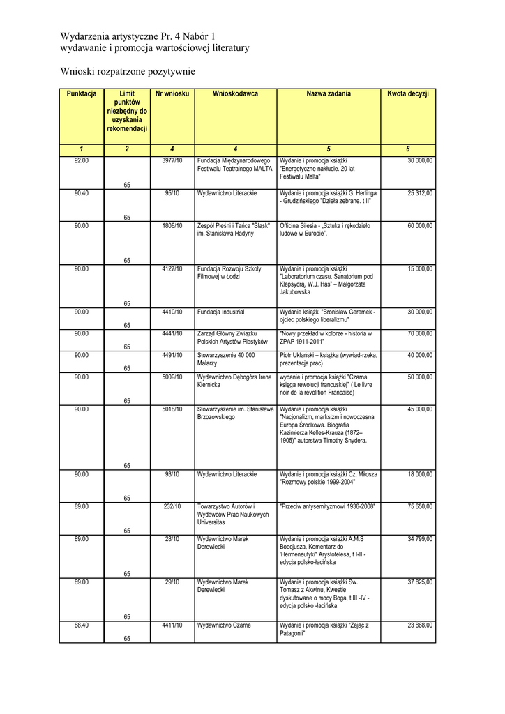 Wydarzenia artystyczne Pr. 4 Nabór 1 wydawanie i promocja wartościowej literatury Wnioski rozpatrzone pozytywnie Punktacja Limit punktów niezbędny do uzyskania rekomendacji Nr wniosku Wnioskodawca Nazwa zadania Kwota decyzji 1 2 4 4 5 6 3977/10 Fundacja Międzynarodowego Festiwalu Teatralnego MALTA Wydanie i promocja książki "Energetyczne nakłucie. 20 lat Festiwalu Malta" 30 000,00 Wydawnictwo Literackie Wydanie i promocja książki G. Herlinga - Grudzińskiego "Dzieła zebrane. t II" 25 312,00 1808/10 Zespół Pieśni i Tańca "Śląsk" im. Stanisława Hadyny Officina Silesia - „Sztuka i rękodzieło ludowe w Europie”. 60 000,00 4127/10 Fundacja Rozwoju Szkoły Filmowej w Łodzi Wydanie i promocja książki "Laboratorium czasu. Sanatorium pod Klepsydrą. W.J. Has” – Małgorzata Jakubowska 15 000,00 4410/10 Fundacja Industrial Wydanie książki "Bronisław Geremek ojciec polskiego liberalizmu" 30 000,00 4441/10 Zarząd Główny Związku Polskich Artystów Plastyków "Nowy przekład w kolorze - historia w ZPAP 1911-2011" 70 000,00 4491/10 Stowarzyszenie 40 000 Malarzy Piotr Uklański – książka (wywiad-rzeka, prezentacja prac) 40 000,00 5009/10 Wydawnictwo Dębogóra Irena Kiernicka wydanie i promocja książki "Czarna księga rewolucji francuskiej" ( Le livre noir de la revolition Francaise) 50 000,00 5018/10 Stowarzyszenie im. Stanisława Wydanie i promocja książki Brzozowskiego "Nacjonalizm, marksizm i nowoczesna Europa Środkowa. Biografia Kazimierza Kelles-Krauza (1872– 1905)" autorstwa Timothy Snydera. 45 000,00 93/10 Wydawnictwo Literackie Wydanie i promocja książki Cz. Miłosza "Rozmowy polskie 1999-2004" 18 000,00 232/10 Towarzystwo Autorów i Wydawców Prac Naukowych Universitas "Przeciw antysemityzmowi 1936-2008" 75 650,00 28/10 Wydawnictwo Marek Derewiecki Wydanie i promocja książki A.M.S Boecjusza, Komentarz do 'Hermeneutyki" Arystotelesa, t I-II edycja polsko-łacińska 34 799,00 29/10 Wydawnictwo Marek Derewiecki Wydanie i promocja książki Św. Tomasz z Akwinu, Kwestie dyskutowane o mocy Boga, t.III -IV edycja polsko -łacińska 37 825,00 4411/10 Wydawnictwo Czarne Wydanie i promocja książki "Zając z Patagonii" 23 868,00 92.00 65 90.40 95/10 65 90.00 65 90.00 65 90.00 65 90.00 65 90.00 65 90.00 65 90.00 65 90.00 65 89.00 65 89.00 65 89.00 65 88.40 65 Wydarzenia artystyczne Pr. 4 Nabór 1 wydawanie i promocja wartościowej literatury Wnioski rozpatrzone pozytywnie 88.00 1049/10 Oficyna Wydawnicza Errata s. c. Maria Napiontek, Joanna Krakowska-Narożna Wydanie i promocja książki: Barbara Osterloff "Pejzaż. Rozmowy z Mają Komorowską" 12 000,00 2849/10 Fundacja Ośrodka KARTA Przygotowanie i publikacja albumu zdjęć Juliena Bryana 60 000,00 258/10 Towarzystwo Autorów i Wydawców Prac Naukowych Universitas "Ciorian, Eliade, Ionesco - zapominanie faszyzmu" 16 800,00 4687/10 Państwowy Instytut Wydawniczy Wydanie i promocja utworu B. Leśmiana "Dzieła Wszystkie" (tytuł roboczy), t. I poezje w oprac. J. Trznadla 20 630,40 4725/10 Dom Spotkań z Historią Wydanie i promocja książki "Spojrzenia na warszawskie getto" 26 880,00 569/10 Polska Akademia Umiejętności Wydanie Polskiego Słownika Biograficznego - zeszytu 192 i 193 46/10 Towarzystwo "Więź" Wydanie i promocja książki: Maria Dąbrowska, Jerzy Stempowki: "Korespondencja 1926-1965" . Opracowanie Andrzej St. Kowalczyk, Tomy 1-3 69 628,00 4408/10 Wydawnictwo Czarne Wydanie i promocja książki "Kraj z Księżyca" 12 001,20 4727/10 Dom Spotkań z Historią Wydanie i promocja albumu Świat Kresów 25 728,00 491/10 Wydawnictwo Karakter s.c. Przemysław Dębowski, Magdalena Hajduk-Dębowsk, Małgorzata Szczurek Wydanie i promocja książki Susan Sontag pt. "Widok cudzego cierpienia" 14 793,60 573/10 Instytut Mikołowski Wydanie i promocja książki "Traktat skłamany" 2531/10 Fundacja Ośrodka KARTA Wydanie i promocja książki "Dzienniki Jerzego Zawieyskiego 1955-69" 49 961,70 110/10 Biuro Literackie Artur Burszta "Wiersze, tom 1" TymoteuszKarpowicz oraz publikacjie towarzyszące edycji Dzieł Zebranych 21 175,00 457/10 Fundacja Zeszytów Literackich Wydanie i promocja książki Tomas Venclova "Z dzienników podróży" 18 816,00 4760/10 Wojewódzka Biblioteka Publiczna i Centrum Animacji Kultury w Poznaniu Wydanie i promocja tomów XIII-XVIII serii Biblioteka Poezji Współczesnej 23 040,00 634/10 Wydawnictwo słowo/obraz terytoria sp. z o.o. w Gdańsku Wydanie książki Michała Bristigera "Transkrypcje. Pisma i przekłady" 14 364,00 1781/10 Krakowskie Biuro Festiwalowe Seria Wydawnicza Sacrum Profanum Linia Muzyczna 97 760,00 217/10 Społeczny Instytut Wydawniczy ZNAK Sp. z o.o. Wydanie biografii Czesława Miłosza autorstwa A. Franaszka 74 600,00 2873/10 Instytut Mikołowski Wydanie i promocja książki "Komentarze do fotografii" 65 88.00 65 84.00 65 84.00 65 84.00 65 83.20 65 82.40 351 104,00 65 82.20 65 80.40 65 80.40 65 78.80 65 77.40 65 77.00 3 546,00 65 76.80 65 76.80 65 75.60 65 75.20 65 74.60 65 74.40 65 6 547,20 Wydarzenia artystyczne Pr. 4 Nabór 1 wydawanie i promocja wartościowej literatury Wnioski rozpatrzone pozytywnie 74.00 4682/10 WYTWÓRNIA Magdalena Kłos - Podsiadło Wydanie i promocja książki dla dzieci "Brzechwa. Wiersze dla dzieci" Jana Brzechwy w oprac. graf. Lecha Majewskiego, Piotra Młodożeńca, Macieja Buszewicza i Grażyny Lange 17 908,00 638/10 Instytut Myśli Józefa Tischnera Wydanie książki "Solidarność znaczy więź" Zbigniewa Stawrowskiego 9 902,64 56/10 Stowarzyszenie Kulturalne FRONDA Wydanie książki "Klasyka wywiadu polskiego" praca zbiorowa 6 154,00 1590/10 Galeria Miejska Arsenał Sztuka i feminizm 16 071,72 4709/10 Fundacja ŚWIETEGO MIKOŁAJA Publikacja tomu Między Atenami a Jerozolimą. Eseje o myśli Erica Voegelina 35 110,20 4930/10 Stowarzyszenie Centrum Badań Nad Zagładą Żydów Publikacja książki B. Engelking i J. Grabowskiego, Półświatek i przestępczość w getcie warszawskim 19 546,80 4977/10 Stowarzyszenie im. Stanis