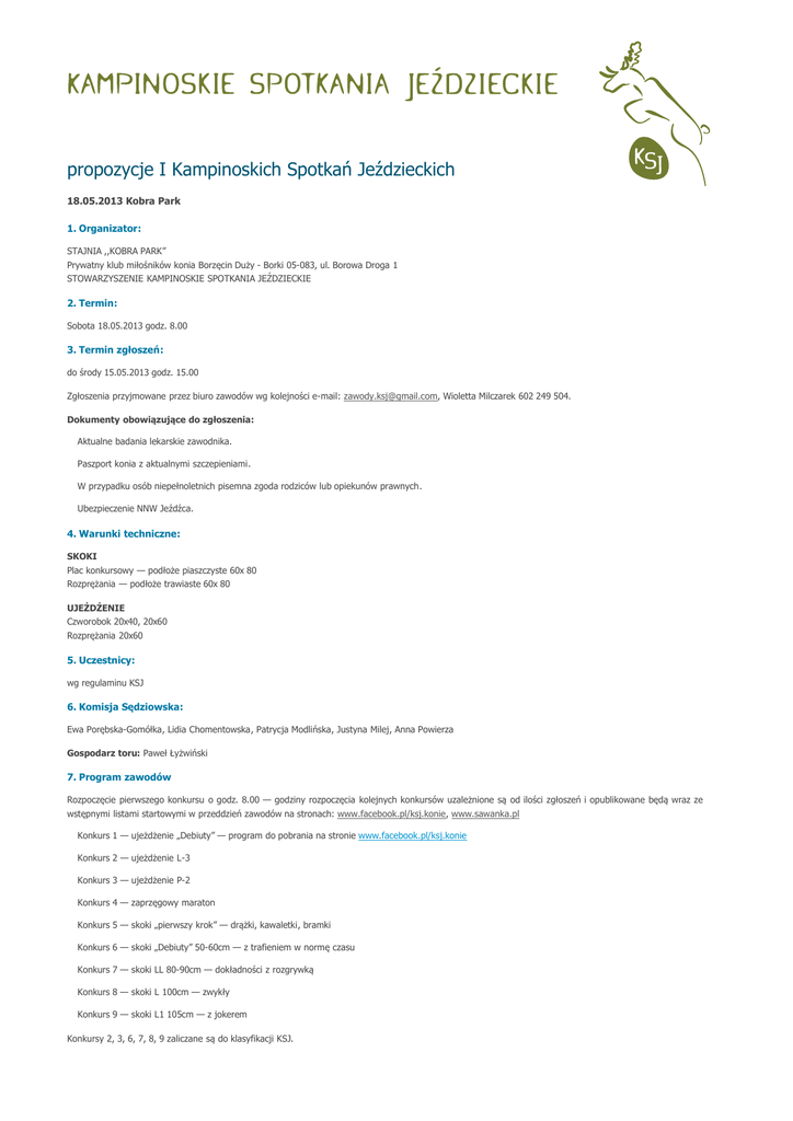 propozycje I Kampinoskich Spotkań Jeździeckich 18.05.2013 Kobra Park 1. Organizator: STAJNIA ,,KOBRA PARK” Prywatny klub miłośników konia Borzęcin Duży - Borki 05-083, ul. Borowa Droga 1 STOWARZYSZENIE KAMPINOSKIE SPOTKANIA JEŹDZIECKIE 2. Termin: Sobota 18.05.2013 godz. 8.00 3. Termin zgłoszeń: do środy 15.05.2013 godz. 15.00 Zgłoszenia przyjmowane przez biuro zawodów wg kolejności e-mail: [email protected], Wioletta Milczarek 602 249 504. Dokumenty obowiązujące do zgłoszenia: Aktualne badania lekarskie zawodnika. Paszport konia z aktualnymi szczepieniami. W przypadku osób niepełnoletnich pisemna zgoda rodziców lub opiekunów prawnych. Ubezpieczenie NNW Jeźdźca. 4. Warunki techniczne: SKOKI Plac konkursowy — podłoże piaszczyste 60x 80 Rozprężania — podłoże trawiaste 60x 80 UJEŻDŻENIE Czworobok 20x40, 20x60 Rozprężania 20x60 5. Uczestnicy: wg regulaminu KSJ 6. Komisja Sędziowska: Ewa Porębska-Gomółka, Lidia Chomentowska, Patrycja Modlińska, Justyna Milej, Anna Powierza Gospodarz toru: Paweł Łyżwiński 7. Program zawodów Rozpoczęcie pierwszego konkursu o godz. 8.00 — godziny rozpoczęcia kolejnych konkursów uzależnione są od ilości zgłoszeń i opublikowane będą wraz ze wstępnymi listami startowymi w przeddzień zawodów na stronach: www.facebook.pl/ksj.konie, www.sawanka.pl Konkurs 1 — ujeżdżenie „Debiuty” — program do pobrania na stronie www.facebook.pl/ksj.konie Konkurs 2 — ujeżdżenie L-3 Konkurs 3 — ujeżdżenie P-2 Konkurs 4 — zaprzęgowy maraton Konkurs 5 — skoki „pierwszy krok” — drążki, kawaletki, bramki Konkurs 6 — skoki „Debiuty” 50-60cm — z trafieniem w normę czasu Konkurs 7 — skoki LL 80-90cm — dokładności z rozgrywką Konkurs 8 — skoki L 100cm — zwykły Konkurs 9 — skoki L1 105cm — z jokerem Konkursy 2, 3, 6, 7, 8, 9 zaliczane są do klasyfikacji KSJ. 8. Zawody rozgrywane zgodnie z Przepisami i Regulaminem PZJ. Zawodników i konie obowiązuje dokumentacja wg regulaminów i przepisów PZJ. Wszystkie konkursy są konkursami towarzyskimi i rozgrywane są zgodnie z Uchwałą PZJ z dnia 06.02.2013 oraz z równą dbałością o konie, zawodników i rywalizację sportową jak konkursy Zawodów oficjalnych. 9. Zgodnie z Regulaminem B PZJ 2013 i A PZJ 2013: Koń w wieku od 6 lat może startować w konkursach do klasy L1 włącznie trzykrotnie w ciągu dnia z zachowaniem zasady maksymalnie dwukrotnego startu w jednym konkursie (art. 5 pkt. 3), W tym samym konkursie, dwukrotny start konia - pod tym samym lub różnymi zawodnikami – jest dozwolony w konkursach do klasy L1 włącznie. Jeżeli na tym samym koniu, w tym samym konkursie startuje ten sam zawodnik, to w konkursach, w których o zwycięstwie decyduje czas przejazdu, zalicza się tylko wynik pierwszego startu (art. 5 pkt. 5). Koń ma prawo startu w konkursach ujeżdżenia bez ograniczeń po osiągnięciu odpowiedniego wieku, zgodnego z tabelą nr 1. Dzienny limit startów dla konia (w różnych konkursach) wynosi dwa, bez ograniczeń ze względu na klasę konkursu. 10. Zawodnicy zobowiązani są do przedstawienia dokumentów i wniesienia opłat przed rozpoczęciem konkursu w którym biorą udział. 11. Opłaty: Wpisowe 50zł od konia Startowe 10zł Zgodnie z Przepisami B PZJ zmiany na listach startowych powinny być wniesione do 30 minut przed rozpoczęciem konkursu. Po tym terminie i w innych przypadkach obowiązuje opłata manipulacyjna w wysokości 20zł. Organizator nie zapewnia miejsc dla koni oraz paszy. 12. Nagrody: Floats dla każdego zawodnika puchary dla zwycięzców nagrody rzeczowe 13. Informacje ogólne: Podczas zawodów będzie obecna karetka pogotowia. Lekarz weterynarii będzie dostępny w nagłych przypadkach. Organizator nie ponosi żadnej odpowiedzialności w razie wypadków i zachorowań zawodników, luzaków i koni jak również w przypadku kradzieży, zniszczeń, pożarów i innych zdarzeń losowych. Wstęp na teren zawodów jest bezpłatny. Katering – bar na terenie zawodów. Organizator zastrzega sobie prawo do korekt w programie i propozycjach zawodów. Zawody zatwierdzone przez PZJ. Dzieci do 13-go roku życia dodatkowo obowiązuje kamizelka ochronna na kręgosłup. Kontakt personalny: Andrzej Gadaś, tel. 607 460 995, e-mail: [email protected] ___________________________________________________________________________________________ KODEKS POSTĘPOWANIA Z KONIEM I. Na wszystkich etapach treningu i przygotowań konia do startu w zawodach, dobro konia musi stać ponad wszelkimi innymi wymaganiami. Dotyczy to stałej opieki, metod treningu, starannego obrządku, kucia i transportu. II. Konie i jeźdźcy muszą być wytrenowani, kompetentni i zdrowi zanim wezmą udział w zawodach. Odnosi się to także do podawania leków i środków medycznych, zabiegów chirurgicznych zagrażających dobru konia lub ciąży klaczy oraz do przypadków nadużywania pomocy. III. Zawody nie mogą zagrażać dobru konia. Wymaga to zwrócenia szczególnej uwagi na teren zawodów, powierzchnię podłoża, pogodę, warunki stajenne, kondycję koni i ich bezpieczeństwo, także podczas podróży powrotnej z zawodów. IV. Należy dołożyć wszelkich starań, aby zapewnić koniom staranną opiekę po zakończeniu zawodów, a także humanitarne traktowanie po zakończeniu kariery sportowej. Dotyczy to właściwej opieki weterynaryjnej, leczenia obrażeń odniesionych na zawodach, spokojnej starości, ewentualnie eutanazji. V. Polski Związek Jeździecki usilnie zachęca wszystkie osoby działające w sporcie jeździeckim do stałego podnoszenia swojej wiedzy oraz umiejętności dotyczących wszelkich aspektów współpracy z koniem.