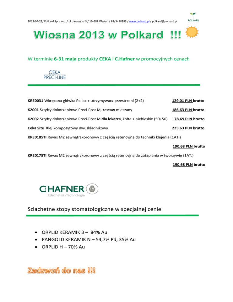 2013-04-23/ Polkard Sp. z o.o. / ul. Jaroszyka 3 / 10-687 Olsztyn / 89/5418383 / www.polkard.pl / [email protected] W terminie 6-31 maja produkty CEKA i C.Hafner w promocyjnych cenach KRE0031 Wkręcana główka Pallax + utrzymywacz przestrzeni (2+2) 129,01 PLN brutto K2001 Sztyfty dokorzeniowe Preci-Post M, zestaw mieszany 186,63 PLN brutto K2002 Sztyfty dokorzeniowe Preci-Post M dla lekarza, żółte + niebieskie (50+50) Ceka Site Klej kompozytowy dwuskładnikowy 78,69 PLN brutto 225,63 PLN brutto KRE0185TI Revax M2 zewnątrzkoronowy z częścią retencyjną do techniki klejenia (1AT.) 190,68 PLN brutto KRE0175TI Revax M2 zewnątrzkoronowy z częścią retencyjną do zatapiania w tworzywie (1AT.) 190,68 PLN brutto Szlachetne stopy stomatologiczne w specjalnej cenie ORPLID KERAMIK 3 – 84% Au PANGOLD KERAMIK N – 54,7% Pd, 35% Au ORPLID H – 70% Au