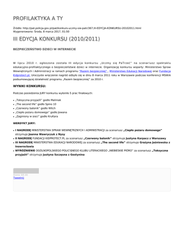 PROFILAKTYKA A TY Źródło: http://pat.policja.gov.pl/pat/konkurs-uczmy-sie-patr/367,III-EDYCJA-KONKURSU-20102011.html Wygenerowano: Środa, 8 marca 2017, 01:50 III EDYCJA KONKURSU (2010/2011) BEZPIECZEŃSTWO DZIECI W INTERNECIE W lipcu 2010 r. ogłoszona została III edycja konkursu „Uczmy się PaTrzeć” na scenariusz spektaklu edukacyjno-profilaktycznego o bezpieczeństwie dzieci w internecie. Organizację konkursu wsparły: Ministerstwo Spraw Wewnętrznych i Administracji w ramach programu "Razem bezpieczniej" , Ministerstwo Edukacji Narodowej oraz Fundacja Kidprotect.pl. Uroczyste wręczenie nagród odbyło się w dniu 8 marca 2011 roku w Warszawie podczas konferencji MSWiA podsumowującej działalność programu „Razem bezpieczniej” za 2010 r. WYNIKI KONKURSU: Podczas posiedzenia JURY konkursu wyłoniło 5 prac finałowych: ● „Toksyczna przyjaźń” godło Maliniak ● „The second life” godło Spino 10 ● „Czerwony balonik” godło Witch ● „Ciepło pożaru domowego” godło Jowana ● „Zaginiony w sieci” godło KruKara WERDYKT JURY: ● I NAGRODĘ MINISTERSTWA SPRAW WEWNĘTRZNYCH I ADMINISTRACJI za scenariusz „Ciepło pożaru domowego” otrzymuje Joanna Wawryczuk z Nysy ● II NAGRODĘ FUNDACJI KIDPROTECT.PL za scenariusz „Czerwony balonik” otrzymuje Justyna Karpacz z Warszawy ● III NAGRODĘ MINISTERSTWA EDUKACJI NARODOWEJ za scenariusz „The second life” otrzymuje Grażyna Jaśniowska z Inowrocławia ● WYRÓŻNIENIE OGÓLNOPOLSKIEGO POLICYJNEGO KLUBU LITERACKIEGO „NIEBIESKIE PIÓRO” za scenariusz „Toksyczna przyjaźń” otrzymuje Justyna Szczęsna z Gostynina Ocena: 0/5 (0) Tweetnij