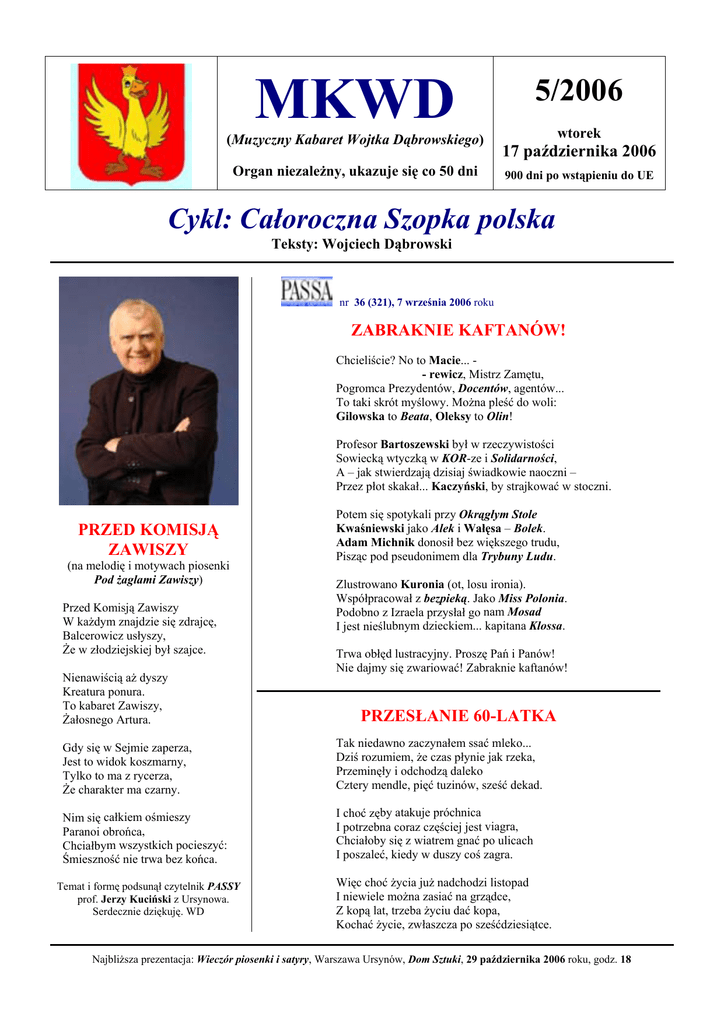 MKWD (Muzyczny Kabaret Wojtka Dąbrowskiego) Organ niezależny, ukazuje się co 50 dni 5/2006 wtorek 17 października 2006 900 dni po wstąpieniu do UE Cykl: Całoroczna Szopka polska Teksty: Wojciech Dąbrowski nr 36 (321), 7 września 2006 roku ZABRAKNIE KAFTANÓW! Chcieliście? No to Macie... - rewicz, Mistrz Zamętu, Pogromca Prezydentów, Docentów, agentów... To taki skrót myślowy. Można pleść do woli: Gilowska to Beata, Oleksy to Olin! Profesor Bartoszewski był w rzeczywistości Sowiecką wtyczką w KOR-ze i Solidarności, A – jak stwierdzają dzisiaj świadkowie naoczni – Przez płot skakał... Kaczyński, by strajkować w stoczni. PRZED KOMISJĄ ZAWISZY (na melodię i motywach piosenki Pod żaglami Zawiszy) Przed Komisją Zawiszy W każdym znajdzie się zdrajcę, Balcerowicz usłyszy, Że w złodziejskiej był szajce. Nienawiścią aż dyszy Kreatura ponura. To kabaret Zawiszy, Żałosnego Artura. Potem się spotykali przy Okrągłym Stole Kwaśniewski jako Alek i Wałęsa – Bolek. Adam Michnik donosił bez większego trudu, Pisząc pod pseudonimem dla Trybuny Ludu. Zlustrowano Kuronia (ot, losu ironia). Współpracował z bezpieką. Jako Miss Polonia. Podobno z Izraela przysłał go nam Mosad I jest nieślubnym dzieckiem... kapitana Klossa. Trwa obłęd lustracyjny. Proszę Pań i Panów! Nie dajmy się zwariować! Zabraknie kaftanów! PRZESŁANIE 60-LATKA Gdy się w Sejmie zaperza, Jest to widok koszmarny, Tylko to ma z rycerza, Że charakter ma czarny. Tak niedawno zaczynałem ssać mleko... Dziś rozumiem, że czas płynie jak rzeka, Przeminęły i odchodzą daleko Cztery mendle, pięć tuzinów, sześć dekad. Nim się całkiem ośmieszy Paranoi obrońca, Chciałbym wszystkich pocieszyć: Śmieszność nie trwa bez końca. I choć zęby atakuje próchnica I potrzebna coraz częściej jest viagra, Chciałoby się z wiatrem gnać po ulicach I poszaleć, kiedy w duszy coś zagra. Temat i formę podsunął czytelnik PASSY prof. Jerzy Kuciński z Ursynowa. Serdecznie dziękuję. WD Więc choć życia już nadchodzi listopad I niewiele można zasiać na grządce, Z kopą lat, trzeba życiu dać kopa, Kochać życie, zwłaszcza po sześćdziesiątce. Najbliższa prezentacja: Wieczór piosenki i satyry, Warszawa Ursynów, Dom Sztuki, 29 października 2006 roku, godz. 18 Str. 2 MKWD, nr 5/2006, Warszawa, wtorek, 17 października 2006 roku (900 dni po wstąpieniu do UE) Wybory samorządowe 12 listopada 2006 roku WOJCIECH DĄBROWSKI KANDYDATEM DO RADY DZIELNICY URSYNÓW nr 41 (326), 12 października 2006 roku RADA, TO NIE WYPADA (melodia z filmu Ada, to nie wypada, muz. Zygmunt Wiehler) Rada (to nie wypada!), Nic tylko gada, gada, gada. Gdzie autostrada? Gdzie jest estakada? Gdzie? Zdecydować trzeba się! Rada (to nie wypada!), Wciąż tylko gada, gada, gada. Kto nas okrada? Trzeba wreszcie zbadać, kto? I wyplenić całe zło! Chór mieszkańców (parlando) Autostrada? To zdrada! Estakada? Odpada! Nowy most? Szkoda gadać! Parking? Tak! U sąsiada! TEORIA EWOLUCJI Karol Darwin nie miał racji! Giertych odkrył jedną z przyczyn, Że Ministra Edukacji Ewolucja – nie dotyczy. JUŻ TAKI BYŁ... IV Rzeczpospolita... Ja wcale się nie cieszę. Już taki był na szczytach, Co numerował... Rzesze. Znów kolejna roszada, I intratna posada. Ciągle w starych w układach, Władzy degrengolada. Autorytet upada, Pozostała fasada. Jednym słowem - żenada. Wszystkim biada nam, biada! Ale dobrze się składa: Zmiana się zapowiada! Dość! – mówimy. Nie nada! Stara rada niech spada! Wniosek: Dziś potrzebna nowa Rada! Głosuj mądrze! Na sąsiada! Z okazji Dnia Nauczyciela KĄCIK PEDAGOGICZNY Zanim klapsa wymierzę Najpierw mówię do dziecka: - Grzeczny bądź, bo zabierze Cię posłanka Sobecka! A gdy to nie pomoże, Sposób mam na urwisów: Grożę, że im przyłożę I zaPISzę do PIS-u! LIMERYKI POSELSKIE dedykowane posłance SLD Joannie Senyszyn z okazji przyznania Lustra Szkła Kontaktowego TVN (wrzesień 2006) Chrząszcz, co brzmiał w gminie Szczebrz(y)szyn, Miał wyszynk. Wśród towarzyszy Słynie, bo w trzcinie Słyszy (po winie) Pisk myszy. A to Senyszyn! Przy ciotce wuj z Iwonicza Całkiem stetryczał i zdziczał. Krzyczał, że spotkał Iljicza (Włodka). A ciotka: To Olejniczak! (Joanna Senyszyn) © MKWD (Muzyczny Kabaret Wojtka Dąbrowskiego) Warszawa, tel / fax (22) 641 64 40, 0-600 630 952 www.spotkaniazpiosenka.org Następny numer ukaże się w środę 6 grudnia 2006 roku (950 dni po wstąpieniu do UE)