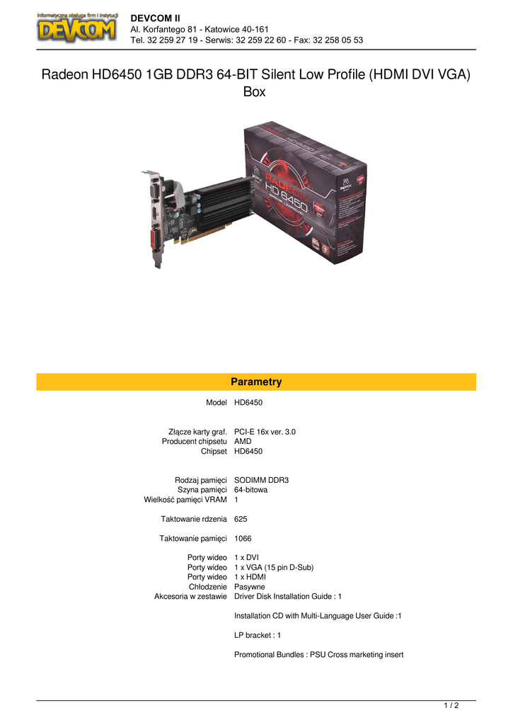 DEVCOM II Al. Korfantego 81 - Katowice 40-161 Tel. 32 259 27 19 - Serwis: 32 259 22 60 - Fax: 32 258 05 53 Radeon HD6450 1GB DDR3 64-BIT Silent Low Profile (HDMI DVI VGA) Box Parametry Model HD6450 Złącze karty graf. PCI-E 16x ver. 3.0 Producent chipsetu AMD Chipset HD6450 Rodzaj pamięci SODIMM DDR3 Szyna pamięci 64-bitowa Wielkość pamięci VRAM 1 Taktowanie rdzenia 625 Taktowanie pamięci 1066 Porty wideo Porty wideo Porty wideo Chłodzenie Akcesoria w zestawie 1 x DVI 1 x VGA (15 pin D-Sub) 1 x HDMI Pasywne Driver Disk Installation Guide : 1 Installation CD with Multi-Language User Guide :1 LP bracket : 1 Promotional Bundles : PSU Cross marketing insert 1/2 DEVCOM II Al. Korfantego 81 - Katowice 40-161 Tel. 32 259 27 19 - Serwis: 32 259 22 60 - Fax: 32 258 05 53 Quick Installation Guide : 1 XFX Serial Number Card : 1 Wymiary 18.1 x 8.1 x 2.8 cm Wersja Box 2/2 Powered by TCPDF (www.tcpdf.org)