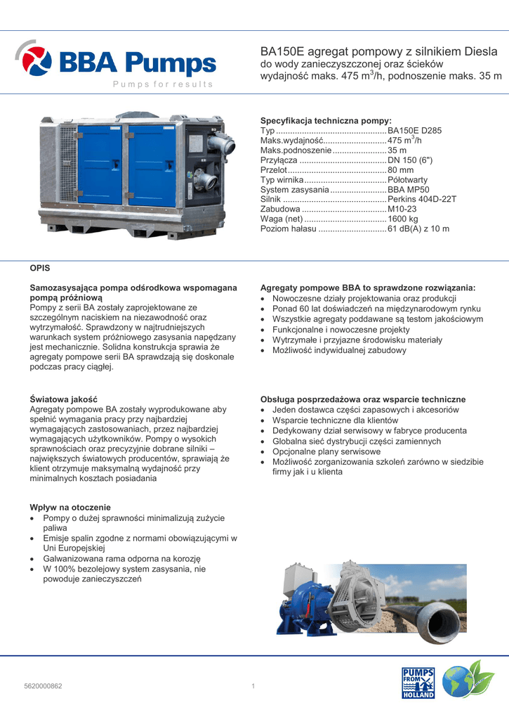 BA150E agregat pompowy z silnikiem Diesla do wody zanieczyszczonej oraz ścieków wydajność maks. 475 m3/h, podnoszenie maks. 35 m Pumps for results Specyfikacja techniczna pompy: Typ ............................................... BA150E D285 3 Maks.wydajność........................... 475 m /h Maks.podnoszenie ....................... 35 m Przyłącza ..................................... DN 150 (6ʺ) Przelot .......................................... 80 mm Typ wirnika ................................... Półotwarty System zasysania ........................ BBA MP50 Silnik ............................................ Perkins 404D-22T Zabudowa .................................... M10-23 Waga (net) ................................... 1600 kg Poziom hałasu ............................. 61 dB(A) z 10 m OPIS Samozasysająca pompa odśrodkowa wspomagana pompą próżniową Pompy z serii BA zostały zaprojektowane ze szczególnym naciskiem na niezawodność oraz wytrzymałość. Sprawdzony w najtrudniejszych warunkach system próżniowego zasysania napędzany jest mechanicznie. Solidna konstrukcja sprawia że agregaty pompowe serii BA sprawdzają się doskonale podczas pracy ciągłej. Agregaty pompowe BBA to sprawdzone rozwiązania: Nowoczesne działy projektowania oraz produkcji Ponad 60 lat doświadczeń na międzynarodowym rynku Wszystkie agregaty poddawane są testom jakościowym Funkcjonalne i nowoczesne projekty Wytrzymałe i przyjazne środowisku materiały Możliwość indywidualnej zabudowy Światowa jakość Agregaty pompowe BA zostały wyprodukowane aby spełnić wymagania pracy przy najbardziej wymagających zastosowaniach, przez najbardziej wymagających użytkowników. Pompy o wysokich sprawnościach oraz precyzyjnie dobrane silniki – największych światowych producentów, sprawiają że klient otrzymuje maksymalną wydajność przy minimalnych kosztach posiadania Obsługa posprzedażowa oraz wsparcie techniczne Jeden dostawca części zapasowych i akcesoriów Wsparcie techniczne dla klientów Dedykowany dział serwisowy w fabryce producenta Globalna sieć dystrybucji części zamiennych Opcjonalne plany serwisowe Możliwość zorganizowania szkoleń zarówno w siedzibie firmy jak i u klienta Wpływ na otoczenie Pompy o dużej sprawności minimalizują zużycie paliwa Emisje spalin zgodne z normami obowiązującymi w Uni Europejskiej Galwanizowana rama odporna na korozję W 100% bezolejowy system zasysania, nie powoduje zanieczyszczeń 5620000862 1 BA150E agregat pompowy z silnikiem Diesla do wody zanieczyszczonej oraz ścieków wydajność maks. 475 m3/h, podnoszenie maks. 35 m Pumps for results KRZYWA PRACY (1750 obr./min) Zgodność z ISO 9906 150 Wydajność Q w m3/h 250 350 450 Zużycie paliwa (BEP) l/h 32 28 23 16 9 29 25 20 14 8 1600 25 21 16 10 7 1500 22 18 13 6 6 Obroty silnika obr./min 1750 1700 5620000862 m 2 BA150E agregat pompowy z silnikiem Diesla do wody zanieczyszczonej oraz ścieków wydajność maks. 475 m3/h, podnoszenie maks. 35 m Pumps for results STANDARDOWA SPECYFIKACJA TECHNICZNA BBA pompa automatycznie zasysająca Typ pompy ...................................... BA150E D285 3 Wydajność maks ............................ 475 m /h Podnoszenie maks ......................... 35 m Typ wirnika...................................... Półotwarty Przelot ............................................. 80 mm Korpus pompy................................. Żeliwo GG20 Wirnik .............................................. 42CrM04 Płyta oporowa ................................. 42CrM04 Wał pompy ...................................... C45 Uszczelnienie pompy ...................... Mechaniczne Uszczelnienie zewnętrzne .............. Węglik wolframu / węglik krzemu Gumowa uszczelka ........................ Viton Próżniowy system zasysania BBA Producent / typ ............................... BBA MP50 / pompa membranowa 3 Wydajność zasysania ..................... 50 m /h Maks.próżnia .................................. 8,5 m Napęd ............................................. Pasek zębaty, napęd stały Zbiornik pływaka ............................. Aluminiowy Zawór zwrotny ................................ Żeliwo GG25 Dysk zaworu ................................... Buna-N Silnik Marka silnika ................................... Perkins Typ silnika ....................................... 404D-22T Moc na kole zamachowym ............. 36 kW (49 Hp) Maks.prędkość obrotowa ................ 1500 – 1750 RPM Zużycie paliwa ................................ 237 g/kWh Pojemność ...................................... 2.2 l Liczba cylindrów ............................. 4 System chłodzenia ......................... Ciecz Norma emisji spalin EU .................. Stage IIIA Norma emisji spalin US .................. Tier 3 Panel sterujący BBA LC20 - Automatyczny start/stop - Dwa pływaki sterujące agregatem (przewód 10 m) - 3 stopniowy włącznik: ręczne sterowanie-0-automatyczna pracą - Obrotomierz - Licznik godzin - Kontrolki ostrzegawcze Układ paliwowy - Zbiornik paliwa PE: 300 L - Wlew paliwa Ø 100 mm - Wskaźnik poziomu na zbiorniku - Wtrysk mechaniczny - Dodatkowy system separacji wody i oczyszczania paliwa 5620000862 System elektryczny oraz zabezpieczenia - Napięcie nominalne 12 Volt - Akumulator klasy Premium 92 amp. - Zabezpieczenie przed pracą przegrzanym silnikiem - Zabezpieczenie przed przeciążeniem 3 BA150E agregat pompowy z silnikiem Diesla do wody zanieczyszczonej oraz ścieków wydajność maks. 475 m3/h, podnoszenie maks. 35 m Pumps for results ZABUDOWA M10-23 Zabudowa dźwiękochłonna BBA Typ zabudowy................................. M10-23 Wymiary Dł x Szer x Wys ............... 2270 x 1050 x 1533 mm Rama .............................................. Cynkowana ogniowo Panele............................................. ABS/ASA Drzwi ............................................... łatwy dostęp (klamka zamykana na klucz) Zb