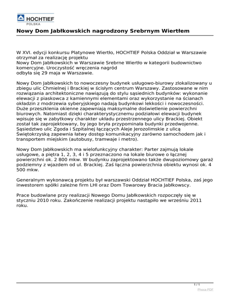 Nowy Dom Jabłkowskich nagrodzony Srebrnym Wiertłem W XVI. edycji konkursu Platynowe Wiertło, HOCHTIEF Polska Oddział w Warszawie otrzymał za realizację projektu Nowy Dom Jabłkowskich w Warszawie Srebrne Wiertło w kategorii budownictwo komercyjne. Uroczystość wręczenia nagród odbyła się 29 maja w Warszawie. Nowy Dom Jabłkowskich to nowoczesny budynek usługowo-biurowy zlokalizowany u zbiegu ulic Chmielnej i Brackiej w ścisłym centrum Warszawy. Zastosowane w nim rozwiązania architektoniczne nawiązują do stylu sąsiednich budynków: wykonanie elewacji z piaskowca z kamiennymi elementami oraz wykorzystanie na ścianach okładzin z modrzewia syberyjskiego nadają budynkowi lekkości i nowoczesności. Duże przeszklenia okienne zapewniają maksymalne doświetlenie powierzchni biurowych. Natomiast dzięki charakterystycznemu podziałowi elewacji budynek wpisuje się w zabytkowy charakter układu przestrzennego ulicy Brackiej. Obiekt został tak zaprojektowany, by jego bryła przypominała budynki przedwojenne. Sąsiedztwo ulic Zgoda i Szpitalnej łączących Aleje Jerozolimskie z ulicą Świętokrzyską zapewnia łatwy dostęp komunikacyjny zarówno samochodem jak i transportem miejskim (autobusy, tramwaje i metro). Nowy Dom Jabłkowskich ma wielofunkcyjny charakter: Parter zajmują lokale usługowe, a piętra 1, 2, 3, 4 i 5 przeznaczono na lokale biurowe o łącznej powierzchni ok. 2 800 mkw. W budynku zaprojektowano także dwupoziomowy garaż podziemny z wjazdem od ul. Brackiej. Zaś łączna powierzchnia obiektu wynosi ok. 4 500 mkw. Generalnym wykonawcą projektu był warszawski Oddział HOCHTIEF Polska, zaś jego inwestorem spółki zależne firm LHI oraz Dom Towarowy Bracia Jabłkowscy. Prace budowlane przy realizacji Nowego Domu Jabłkowskich rozpoczęły się w styczniu 2010 roku. Zakończenie realizacji projektu nastąpiło we wrześniu 2011 roku. 1/1 Phoca PDF Powered by TCPDF (www.tcpdf.org)