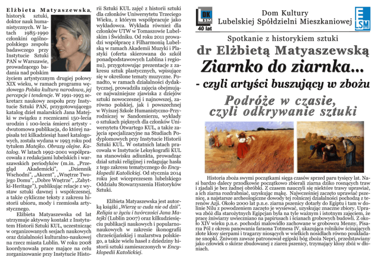 E l ż b i e t a M a t y a s z e w s k a, historyk sztuki, doktor nauk huma nistycznych. W la tach 19851990 członkini ogólno polskiego zespołu badawczego przy Instytucie Sztuki PAN w Warszawie, prowadzącego ba dania nad polskim życiem artystycznym drugiej połowy XIX wieku, w ramach programu wę złowego Polska kultura narodowa, jej percepcje i tendencje. W 19911993 se kretarz naukowy zespołu przy Insty tucie Sztuki PAN, przygotowującego katalog dzieł malarskich Jana Matej ki w związku z rocznicami 150lecia urodzin i 100lecia śmierci artysty dwutomowa publikacja, do której na pisała też kilkadziesiąt haseł katalogo wych, została wydana w 1993 roku pod tytułem Matejko. Obrazy olejne. Ka talog. W latach 19922001 współpra cowała z redakcjami lubelskich i war szawskich periodyków (m.in. „Prze gląd Akademicki”, „Dziennik Wschodni”, „Akcent”, „Wnętrze Two jego Domu”, „Dobre Wnętrze”, „Zabyt kiHeritage”), publikując relacje z wy staw sztuki dawnej i współczesnej, a także cykliczne teksty z zakresu hi storii ubioru, mody i rzemiosła arty stycznego. Elżbieta Matyaszewska od lat utrzymuje aktywny kontakt z Instytu tem Historii Sztuki KUL, uczestnicząc w organizowanych sesjach naukowych oraz działalności kulturalnonaukowej na rzecz miasta Lublin. W roku 2008 koordynowała prace mające na celu zorganizowanie przy Instytucie Histo rii Sztuki KUL zajęć z historii sztuki dla członków Uniwersytetu Trzeciego Wieku, z którym współpracuje jako wykładowca. Wykłada również dla członków UTW w Tomaszowie Lubel skim i Świdniku. Od roku 2011 prowa dzi współpracę z Filharmonią Lubel ską w ramach Akademii Muzyki i Pla styki (oferta skierowana do szkół ponadpodstawowych Lublina i regio nu), przygotowując prezentacje z za kresu sztuk plastycznych, wpisujące się w określone tematy muzyczne. Po nadto, w ramach działalności dydak tycznej, prowadziła zajęcia obejmują ce najważniejsze zjawiska z dziejów sztuki nowoczesnej i najnowszej, za równo polskiej, jak i powszechnej w Wyższej Szkole HumanistycznoPrzy rodniczej w Sandomierzu, wykłady o sztukach pięknych dla członków Uni wersytetu Otwartego KUL, a także za jęcia specjalizacyjne na Studiach Po dyplomowych przy Instytucie Historii Sztuki KUL. W ostatnich latach pra cowała w Instytucie Leksykografii KUL na stanowisku adiunkta, prowadząc dział sztuki religijnej i redagując hasła z tego zakresu tematycznego do Ency klopedii Katolickiej. Od stycznia 2014 roku jest wiceprezesem lubelskiego Oddziału Stowarzyszenia Historyków Sztuki. Elżbieta Matyaszewska jest autor ką książki „Wierzę w cuda nie od dziś”. Religia w życiu i twórczości Jana Ma tejki (Lublin 2007) oraz kilkudziesię ciu publikacji naukowych i popularno naukowych w zakresie ikonografii chrześcijańskiej i malarstwa polskie go, a także wielu haseł z dziedziny hi storii sztuki zamieszczonych w Ency klopedii Katolickiej. Dom Kultury Lubelskiej Spółdzielni Mieszkaniowej 40 lat Spotkanie z historykiem sztuki dr Elżbietą Matyaszewską Ziarnko do ziarnka… czyli artyści buszujący w zbożu Podróże w czasie, czyli odkrywanie sztuki Historia zboża swymi początkami sięga czasów sprzed paru tysięcy lat. Na si bardzo dalecy przodkowie początkowo zbierali ziarna dziko rosnących traw i zjadali je bez żadnej obróbki. Z czasem nauczyli się niektóre trawy uprawiać, a ich ziarna rozdrabniać, uzyskując mąkę. Najwcześniej zaczęto uprawiać psze nicę, a najstarsze archeologiczne dowody tej rolniczej działalności pochodzą z te renów Azji. Około 2000 lat p.n.e. ziarna pszenicy dotarły do Egiptu i tam w do linie Nilu z powodzeniem zaczęto je wysiewać, uzyskując znaczne zbiory. Upra wa zbóż dla starożytnych Egipcjan była na tyle ważnym i istotnym zajęciem, że pracę żniwiarzy uwieczniano na papirusach i ścianach grobowych budowli. Z oko ło XIV wieku p.n.e. pochodzi malowidło zachowane w grobowcu Menny, Pisa rza Pól z okresu panowania faraona Totmesa IV, ukazująca rolników ścinających złote kłosy sierpami i tragarzy niosących w wielkich nosidłach równo poukłada ne snopki. Żniwom zawsze patronował egipski bóg zboża Nepri, przedstawiany jako człowiek o skórze zbudowanej z ziaren pszenicy, trzymający kłosy zbóż w dło niach. Równie ważne miejsce zajmowała uprawa zbóż w gospodarce starożytnej Grecji. Zgodnie z jej mitologią, umie jętność korzystania z przetworzonych ziaren Grecy zawdzięczali bogini De meter, patronce płodności i urodzajów. To właśnie jej mit tłumaczył cykliczność procesów wegetacyjnych i sezonowość zbiorów, stając się inspiracją dla ów czesnych twórców, którzy często two rzyli wizerunki Demeter, przedstawia jąc ją z wieńcem złotych kłosów na gło wie, bądź trzymającą je w dłoniach. W kulturze rzymskiej jej odpowiednicz ką była Ceres, również traktowana ja ko patronka wegetacji i, podobnie jak Demeter, obdarzana atrybutem w po staci kłosów zbóż. Jednakże nie tylko świat starożyt ny wykorzystywał w swej sztuce moty wy kłosów. Sięgnęła po nie również sztu ka chrześcijańska, wykorzystując wie lorakie znaczenie zbóż, początkami sięgające mitologii hebrajskiej, gdzie jest mowa o tym, że rajskie drzewo wie dzy było w rzeczywistości „wyższym od cedru źdźbłem pszenicy”. W Starym Te stamencie snopek zboża był ofiarą Ka ina, której Bóg nie chciał przyjąć, a zbie ranie pszenicznych kłosów nieodłącznie kojarzyło się z historią Rut, protoplast ki rodu Dawidowego, którą tak chętnie przedstawiano w okresie średniowiecza. W Nowym Testamencie kłosy zbóż występowały w ilustracjach Chrystuso wej przypowieści o kąkolu, czego przy kładem może być obraz Domenica Fet tiego, natomiast snopek pszenicy nie rzadko przedstawiany był w kompozycjach ilustrujących sceny Bożego Narodzenia, leżąc obok Dzieciątka, bądź służąc Mu za poduszkę. W takim ujęc