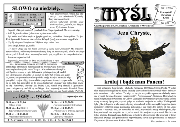 SŁOWO na niedzielę… Poszukaj! Przeczytaj! Prze-MYŚL! DZISIAJ Gdy ukrzyżowano Jezusa, lud stał i patrzył. Lecz członkowie Wysokiej Rady drwiąco mówili: – Innych wybawiał, niechże teraz Łk 23,35-43 Ewangelia: siebie wybawi, jeśli On jest Mesjaszem, Wybrańcem Bożym. Szydzili z Niego i żołnierze; podchodzili do Niego i podawali Mu ocet, mówiąc: – Jeśli Ty jesteś królem żydowskim, wybaw sam siebie. Był także nad Nim napis w języku greckim, łacińskim i hebrajskim: To jest Król żydowski. Jeden ze złoczyńców, których [tam] powieszono, urągał Mu: – Czy Ty nie jesteś Mesjaszem? Wybaw więc siebie i nas. Lecz drugi, karcąc go, rzekł: – Ty nawet Boga się nie boisz, chociaż tę samą karę ponosisz? My przecież sprawiedliwie, odbieramy bowiem słuszną karę za nasze uczynki, ale On nic złego nie uczynił. I dodał: Jezu, wspomnij na mnie, gdy przyjdziesz do swego królestwa. Jezus mu odpowiedział: – Zaprawdę, powiadam ci: Dziś ze Mną będziesz w raju. I co Ksiądz na to? Hm… Zawieszenie Jezusa na krzyżu było pierwszym aktem Jego intronizacji. Zanim zasiadł po prawicy Ojca, pierwsze rozporządzenie wydał z ‘tronu’ krzyża. A brzmiało ono niezwykle: dziś będziesz ze mną w raju. Kilkanaście godzin po tym, jak modlił się: Ojcze pragnę, aby także Ci, których mi dałeś byli ze mną tam, gdzie Ja jestem, zaczyna realizować swą wielką misję. Każdy z nas może więc pomyśleć, czy jest objęty tym wielkim pragnieniem Jezusa, i czy pozwala na to, żeby Pan prowadził go do swego królestwa? On nigdy nie będzie tego czynił na siłę. Potrzebuje, abyśmy jak Dobry Łotr, uznali swą słabość i grzeszność oraz z całą pokorą zwrócili się do Niego: Jezu, wspomnij na mnie. Przecież Pismo Święte poucza: Powierz Panu swą drogę i zaufaj Mu: On sam będzie działał (Ps 37,5). 20.11.2016 Uroczystość Chrystusa Króla Czytanie I: 2 Sm 5, 1-3 Psalm: Ps 122, 1-2.4-5 Czytanie II: Kol 1, 12-20 … i cały … tydzień … wytrwaj w nim! 21.11 pn.– Łk 21,1-4 24.11 cz. – Łk 21,20-28 Wdowi grosz Powtórne przyjście Chrystusa 22.11 wt. – Łk 21,5-11 25.11 pt. – Łk 21,29-33 Zapowiedź zburzenia świątyni Przypowieść o drzewie figowym 23.11 śr. – Łk 21,12-19 26.11 sb. – Łk 21,34-36 Czuwajcie i módlcie Prześladowanie uczniów ZA TYDZIEŃ: Iz 2, 1-5; Ps 122; Rz 13, 11–14; Mt 24, 37-44 Gazetka parafii p.w. św. Michała Archanioła w Wytomyślu Nr 221 Jezu Chryste, Króluj na m Chryste króluj i bądź nam Panem! Dziś kończymy Rok Święty i obchody Jubileuszu 1050-lecia Chrztu Polski. W ostatnich miesiącach mogliśmy na różne sposoby doświadczać konsekwencji wiary, która została nam dana … ale i zadana. To więc, co łączyło wszystkie tegoroczne obchody możemy wyrazić dwoma słowami: ‘wdzięczność’ i ‘zobowiązanie’. Światowe Dni Młodych, nasza pielgrzymka do Gniezna, na Ostrów Lednicki i do Poznania w poszukiwaniu korzeni wiary w naszej Ojczyźnie, czy też pobyt na stadionie miejskim w stolicy Wielkopolski, były tylko jednymi z wielu okazji, abyśmy uświadomili sobie niezwykłe bogactwo jakim zostaliśmy obdarzeni przez poprzednie pokolenia, i jak wiele dziś zależy od nas. Jezus Chrystus – wczoraj i dziś, ten sam także na wieki, przychodzi z mocą właśnie po to, abyśmy powierzyli mu wszystko to, co już za nami, i to, co jeszcze prze nami. On chce nie tylko, abyśmy dostrzegli Jego królowanie w historii, ale pozwolili Mu królować w teraźniejszości. Dlatego dziś pełni ufności wypowiadamy słowa aktu powierzenia się Jezusowi Chrystusowi jako naszemu Królowi i Panu. Wasz proboszcz – ks. Artur Akt Przyjęcia Jezusa Chrystusa za Króla i Pana . Nieśmiertelny Królu Wieków, Panie Jezu Chryste, nasz Boże i Zbawicielu! W Roku Jubileuszowym 1050-lecia Chrztu Polski, w roku Nadzwyczajnego Jubileuszu Miłosierdzia, oto my, Polacy, stajemy przed Tobą [wraz ze swymi władzami duchownymi i świeckimi], by uznać Twoje Panowanie, poddać się Twemu Prawu, zawierzyć i poświęcić Tobie naszą Ojczyznę i cały Naród. Wyznajemy wobec nieba i ziemi, że Twego królowania nam potrzeba. Wyznajemy, że Ty jeden masz do nas święte i nigdy nie wygasłe prawa. Dlatego z pokorą chyląc swe czoła przed Tobą, Królem Wszechświata, uznajemy Twe Panowanie nad Polską i całym naszym Narodem, żyjącym w Ojczyźnie i w świecie. Pragnąc uwielbić majestat Twej potęgi i chwały, z wielką wiarą i miłością wołamy: ● W naszych sercach – Króluj nam Chryste! ● W naszych rodzinach – Króluj nam Chryste! ● W naszych parafiach – Króluj nam Chryste! ● W naszych szkołach i uczelniach – Króluj nam Chryste! ● W środkach społecznej komunikacji – Króluj nam Chryste! ● W naszych urzędach, miejscach pracy, służby i odpoczynku – Króluj nam Chryste! ● W naszych miastach i wioskach – Króluj nam Chryste! ● W całym Narodzie i Państwie Polskim – Króluj nam Chryste! Błogosławimy Cię i dziękujemy Ci Panie Jezu Chryste: ● Za niezgłębioną Miłość Twojego Najświętszego Serca – Chryste nasz Królu, dziękujemy! ● Za łaskę chrztu świętego i przymierze z naszym Narodem zawarte przed wiekami – Chryste nasz Królu, dziękujemy! ● Za macierzyńską i królewską obecność Maryi w naszych dziejach – Chryste nasz Królu, dziękujemy! ● Za Twoje wielkie Miłosierdzie okazywane nam stale – Chryste nasz Królu, dziękujemy! ● Za Twą wierność mimo naszych zdrad i słabości – Chryste nasz Królu, dziękujemy! Świadomi naszych win i zniewag zadanych Twemu Sercu przepraszamy za wszelkie nasze grzechy, a zwłaszcza za odwracanie się od wiary świętej, za brak miłości względem Ciebie i bliźnich. Przepraszamy Cię za narodowe grzechy społeczne, za wszelkie wady, nałogi i zniewolenia. Wyrzekamy się złego ducha i wszystkich jego spraw. Pokornie poddajemy się Twemu Panowaniu i Twemu Prawu. Zobowiązujemy się por