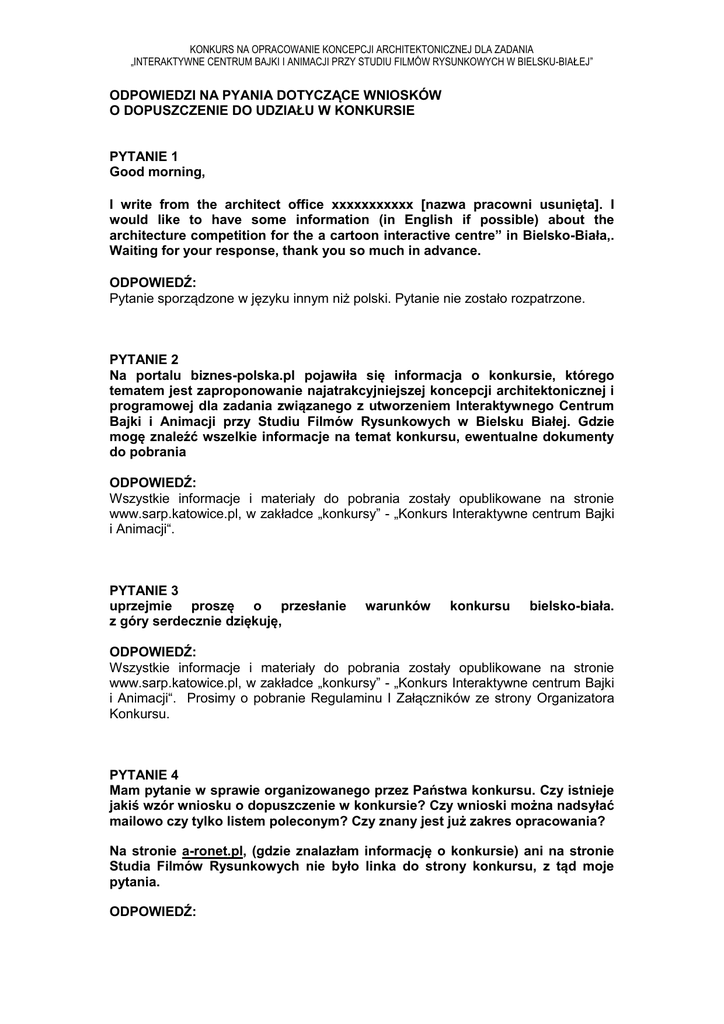 KONKURS NA OPRACOWANIE KONCEPCJI ARCHITEKTONICZNEJ DLA ZADANIA „INTERAKTYWNE CENTRUM BAJKI I ANIMACJI PRZY STUDIU FILMÓW RYSUNKOWYCH W BIELSKU-BIAŁEJ” ODPOWIEDZI NA PYANIA DOTYCZĄCE WNIOSKÓW O DOPUSZCZENIE DO UDZIAŁU W KONKURSIE PYTANIE 1 Good morning, I write from the architect office xxxxxxxxxxx [nazwa pracowni usunięta]. I would like to have some information (in English if possible) about the architecture competition for the a cartoon interactive centre” in Bielsko-Biała,. Waiting for your response, thank you so much in advance. ODPOWIEDŹ: Pytanie sporządzone w języku innym niż polski. Pytanie nie zostało rozpatrzone. PYTANIE 2 Na portalu biznes-polska.pl pojawiła się informacja o konkursie, którego tematem jest zaproponowanie najatrakcyjniejszej koncepcji architektonicznej i programowej dla zadania związanego z utworzeniem Interaktywnego Centrum Bajki i Animacji przy Studiu Filmów Rysunkowych w Bielsku Białej. Gdzie mogę znaleźć wszelkie informacje na temat konkursu, ewentualne dokumenty do pobrania ODPOWIEDŹ: Wszystkie informacje i materiały do pobrania zostały opublikowane na stronie www.sarp.katowice.pl, w zakładce „konkursy” - „Konkurs Interaktywne centrum Bajki i Animacji“. PYTANIE 3 uprzejmie proszę o przesłanie z góry serdecznie dziękuję, warunków konkursu bielsko-biała. ODPOWIEDŹ: Wszystkie informacje i materiały do pobrania zostały opublikowane na stronie www.sarp.katowice.pl, w zakładce „konkursy” - „Konkurs Interaktywne centrum Bajki i Animacji“. Prosimy o pobranie Regulaminu I Załączników ze strony Organizatora Konkursu. PYTANIE 4 Mam pytanie w sprawie organizowanego przez Państwa konkursu. Czy istnieje jakiś wzór wniosku o dopuszczenie w konkursie? Czy wnioski można nadsyłać mailowo czy tylko listem poleconym? Czy znany jest już zakres opracowania? Na stronie a-ronet.pl, (gdzie znalazłam informację o konkursie) ani na stronie Studia Filmów Rysunkowych nie było linka do strony konkursu, z tąd moje pytania. ODPOWIEDŹ: KONKURS NA OPRACOWANIE KONCEPCJI ARCHITEKTONICZNEJ DLA ZADANIA „INTERAKTYWNE CENTRUM BAJKI I ANIMACJI PRZY STUDIU FILMÓW RYSUNKOWYCH W BIELSKU-BIAŁEJ” Wzór Wniosku o dopuszczenie do udziału w Konkursie znajduje się na stronie www.sarp.katowice.pl, w zakładce „konkursy” - „Konkurs Interaktywne centrum Bajki i Animacji“. Wniosek o dopuszczenie do udziału w Konkursie oraz wymagane Regulaminem Konkursu załączniki i pozostałe dokumenty należy złożyć w oryginale odpowiednim terminie i według określonego wzoru: 1. Załącznik nr 1 Wniosek o dopuszczenie do udziału w Konkursie 2. Załącznik nr 2 Pełnomocnictwo 3. Załącznik nr 3 Oświadczenie o spełnianiu warunków udziału (JEDZ) Wszystkie informacje i materiały do pobrania zostały opublikowane na stronie www.sarp.katowice.pl, w zakładce „Konkurs Interaktywne centrum Bajki i Animacji“. Prosimy o pobranie Regulaminu ze strony Organizatora Konkursu. PYTANIE 5 Dzień dobry, bardzo proszę o odpowiedź dotyczącą składania wniosku przez osobę fizyczną. Z punktu 8.4 wynika, że oprócz swoich uprawnień architektonicznych osoba ta musi dysponować osobą mającą uprawnienia w specjalności konstrukcyjnej. Czy ten konstruktor powinien osobno złożyć także formularz JEDZ? A architekt powinien go załączyć do swojego wniosku? Tak, zgadza się, zgodnie z Regulaminem ROZDZIAŁ I, POSTANOWIENIA OGÓLNE, pkt. 8.4 d). Uczestnik Konkursu, który zamierza powierzyć wykonanie części zamówienia podwykonawcom, w celu wykazania braku istnienia wobec nich podstaw wykluczenia składa Oświadczenie, [w formie Jednolitego Europejskiego Dokumentu Zamówienia JEDZ], o którym mowa w pkt. 8.4. a) tiret pierwszy, dotyczące tych podwykonawców (podpisane przez uprawnionych przedstawicieli tych podmiotów). PYTANIE 6 Chciałbym uzyskać więcej informacji na temat warunków, jakie muszą spełnić uczestnicy, ew. chcielibyśmy zostać dopuszczeni do udziału w konkursie. Jaki zatem następny krok? ODPOWIEDŹ: Wszystkie informacje i materiały do pobrania zostały opublikowane na stronie www.sarp.katowice.pl, w zakładce „konkursy” - „Konkurs Interaktywne centrum Bajki i Animacji“. Prosimy o pobranie Regulaminu i Załączników ze strony Organizatora Konkursu. Wzór Wniosku o dopuszczenie do udziału w Konkursie znajduje się na stronie www.sarp.katowice.pl, w zakładce „konkursy” - „Konkurs Interaktywne centrum Bajki i Animacji“. Wniosek o dopuszczenie do udziału w Konkursie oraz wymagane Regulaminem Konkursu załączniki i pozostałe dokumenty należy złożyć w oryginale odpowiednim KONKURS NA OPRACOWANIE KONCEPCJI ARCHITEKTONICZNEJ DLA ZADANIA „INTERAKTYWNE CENTRUM BAJKI I ANIMACJI PRZY STUDIU FILMÓW RYSUNKOWYCH W BIELSKU-BIAŁEJ” terminie i według określonego wzoru: 1. Załącznik nr 1 Wniosek o dopuszczenie do udziału w Konkursie 2. Załącznik nr 2 Pełnomocnictwo 3. Załącznik nr 3 Oświadczenie o spełnianiu warunków udziału (JEDZ) PYTANIE 7 A) Odnalazłam regulamin i dokument zgłoszenia. Na Państwa stronie jest jednak problem z plikiem odnośnie zestawienia tabelarycznego powierzchni. Przy próbie jego ściągnięcia lub zapisu na komputer wyświetla się informacja, że jest on uszkodzony. B) Czy dobrze zrozumiałam regulamin, że wniosek o dopuszczenie udziału w konkursie zawiera załączniku nr 1,2,3 i oświadczenia z pkt. 8a) regulaminu? ODPOWIEDŹ: Na stronie organizatora zamieszczono dodatkowy załącznik 12a, który jest zestawieniem powierzchni w formacie pdf. Wniosek o dopuszczenie do udziału w Konkursie oraz wymagane Regulaminem Konkursu załączniki i pozostałe dokumenty należy złożyć w oryginale odpowiednim terminie i według określonego wzoru: 1. Załącznik nr 1 Wniosek o dopuszczenie do udziału w Konkursie 2. Załącznik nr 2 Pełnomocnictwo 3. Załącznik nr 3 Oświadczenie o spełnianiu warunków udziału (JEDZ) W Regulaminie nie istnieje pkt 8 a). Zał