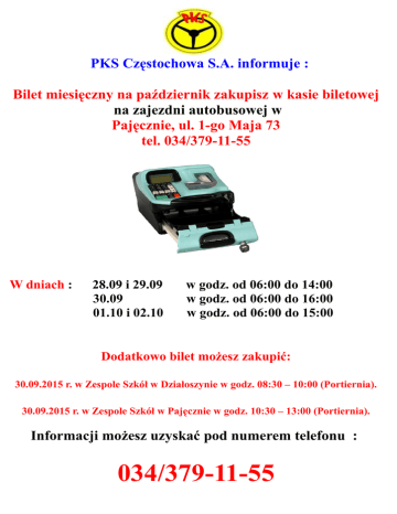 PKS Częstochowa S.A. informuje : Bilet miesięczny na październik zakupisz w kasie biletowej na zajezdni autobusowej w Pajęcznie, ul. 1-go Maja 73 tel. 034/379-11-55 W dniach : 28.09 i 29.09 30.09 01.10 i 02.10 w godz. od 06:00 do 14:00 w godz. od 06:00 do 16:00 w godz. od 06:00 do 15:00 Dodatkowo bilet możesz zakupić: 30.09.2015 r. w Zespole Szkół w Działoszynie w godz. 08:30 – 10:00 (Portiernia). 30.09.2015 r. w Zespole Szkół w Pajęcznie w godz. 10:30 – 13:00 (Portiernia). Informacji możesz uzyskać pod numerem telefonu : 034/379-11-55