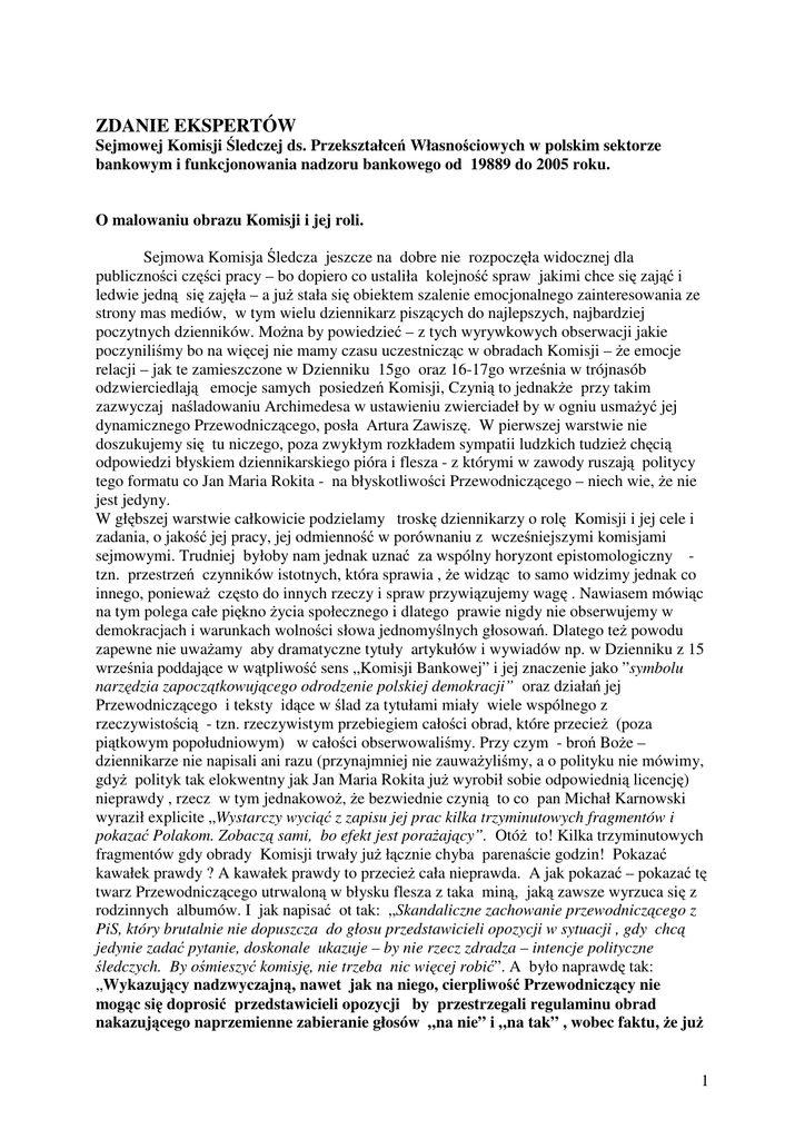 ZDANIE EKSPERTÓW Sejmowej Komisji Śledczej ds. Przekształceń Własnościowych w polskim sektorze bankowym i funkcjonowania nadzoru bankowego od 19889 do 2005 roku. O malowaniu obrazu Komisji i jej roli. Sejmowa Komisja Śledcza jeszcze na dobre nie rozpoczęła widocznej dla publiczności części pracy – bo dopiero co ustaliła kolejność spraw jakimi chce się zająć i ledwie jedną się zajęła – a już stała się obiektem szalenie emocjonalnego zainteresowania ze strony mas mediów, w tym wielu dziennikarz piszących do najlepszych, najbardziej poczytnych dzienników. Można by powiedzieć – z tych wyrywkowych obserwacji jakie poczyniliśmy bo na więcej nie mamy czasu uczestnicząc w obradach Komisji – że emocje relacji – jak te zamieszczone w Dzienniku 15go oraz 16-17go września w trójnasób odzwierciedlają emocje samych posiedzeń Komisji, Czynią to jednakże przy takim zazwyczaj naśladowaniu Archimedesa w ustawieniu zwierciadeł by w ogniu usmażyć jej dynamicznego Przewodniczącego, posła Artura Zawiszę. W pierwszej warstwie nie doszukujemy się tu niczego, poza zwykłym rozkładem sympatii ludzkich tudzież chęcią odpowiedzi błyskiem dziennikarskiego pióra i flesza - z którymi w zawody ruszają politycy tego formatu co Jan Maria Rokita - na błyskotliwości Przewodniczącego – niech wie, że nie jest jedyny. W głębszej warstwie całkowicie podzielamy troskę dziennikarzy o rolę Komisji i jej cele i zadania, o jakość jej pracy, jej odmienność w porównaniu z wcześniejszymi komisjami sejmowymi. Trudniej byłoby nam jednak uznać za wspólny horyzont epistomologiczny tzn. przestrzeń czynników istotnych, która sprawia , że widząc to samo widzimy jednak co innego, ponieważ często do innych rzeczy i spraw przywiązujemy wagę . Nawiasem mówiąc na tym polega całe piękno życia społecznego i dlatego prawie nigdy nie obserwujemy w demokracjach i warunkach wolności słowa jednomyślnych głosowań. Dlatego też powodu zapewne nie uważamy aby dramatyczne tytuły artykułów i wywiadów np. w Dzienniku z 15 września poddające w wątpliwość sens „Komisji Bankowej” i jej znaczenie jako ”symbolu narzędzia zapoczątkowującego odrodzenie polskiej demokracji” oraz działań jej Przewodniczącego i teksty idące w ślad za tytułami miały wiele wspólnego z rzeczywistością - tzn. rzeczywistym przebiegiem całości obrad, które przecież (poza piątkowym popołudniowym) w całości obserwowaliśmy. Przy czym - broń Boże – dziennikarze nie napisali ani razu (przynajmniej nie zauważyliśmy, a o polityku nie mówimy, gdyż polityk tak elokwentny jak Jan Maria Rokita już wyrobił sobie odpowiednią licencję) nieprawdy , rzecz w tym jednakowoż, że bezwiednie czynią to co pan Michał Karnowski wyraził explicite „Wystarczy wyciąć z zapisu jej prac kilka trzyminutowych fragmentów i pokazać Polakom. Zobaczą sami, bo efekt jest porażający”. Otóż to! Kilka trzyminutowych fragmentów gdy obrady Komisji trwały już łącznie chyba parenaście godzin! Pokazać kawałek prawdy ? A kawałek prawdy to przecież cała nieprawda. A jak pokazać – pokazać tę twarz Przewodniczącego utrwaloną w błysku flesza z taka miną, jaką zawsze wyrzuca się z rodzinnych albumów. I jak napisać ot tak: „Skandaliczne zachowanie przewodniczącego z PiS, który brutalnie nie dopuszcza do głosu przedstawicieli opozycji w sytuacji , gdy chcą jedynie zadać pytanie, doskonale ukazuje – by nie rzecz zdradza – intencje polityczne śledczych. By ośmieszyć komisję, nie trzeba nic więcej robić”. A było naprawdę tak: „Wykazujący nadzwyczajną, nawet jak na niego, cierpliwość Przewodniczący nie mogąc się doprosić przedstawicieli opozycji by przestrzegali regulaminu obrad nakazującego naprzemienne zabieranie głosów „na nie” i „na tak” , wobec faktu, że już 1 trzy razy pod rząd wygłaszane były głosy „na nie” i nie mogąc się doprosić przedstawicielki SLD mimo czterokrotnych wezwań, by określiła się przed zabraniem głosu, aby nie łamać po raz kolejny regulaminu obrad, nie udzielił jej głosu i zarządził głosowanie w sprawie. Zachowanie Przewodniczącego bezstronnie stojącego na straży regulaminu obrad i pilnującego ich porządku nie pierwszy już raz uratowało Komisję przed ośmieszającym paraliżującymi działaniami przedstawicieli opozycji. Ci bowiem konsekwentnie i od samego początku demonstrują, że jej sobie nie życzą.” i dalej już za panem Michałem : A przecież komisja śledcza to ciało kolegialne , budowane na zasadzie parlamentarnego parytetu: po to właśnie, żeby w miarę możliwości dążyło do wewnętrznego consensusu... ” i dalej też ładnie! I dziennikarze i my widzieliśmy to samo – drobny epizod - wystarczy jedynie byśmy inaczej pozapalali światła jak na scenie słowackiego „divadla” opisywanego przez Cata Mackiewicza - i ujrzymy co innego. Dodajmy jeszcze zdjęcie jak poseł stoi na głowie w słusznej, ale innej sprawie i będzie nam pasowało do słów w kółko powtarzanych i w czasie obrad i po tych do kamer i mikrofonów przez jednego z opozycyjnych przedstawicieli Komisji, który obdarza Przewodniczącego szczerą nienawiścią. Tak więc gdy przywołuje się Komisje ds. afery Rywina i jej przewodniczącego Tomasza Nałęcza i gdy się pisze, że nawet w swych najgorszych chwilach Nałęcz nie zbliżył się na krok do tego co na starcie pokazuje Zawisza , to przeoczone jest że nawet w najgorszych chwilach Nałęcza ni spotykało to co dla Zawiszy jest chlebem powszednim od chwili startu. Oto bowiem już na starcie opozycja występowała by A. Zawiszę odwołać a Komisję najlepiej rozwiązać, albo chociaż zawiesić bo „zakres jej zadań jest nieokreślony”, i trzeba czekać na decyzje Trybunału Konstytucyjnego. Prawdopodobnie odkrycie przez Przewodniczącego, że w Komisji Śledczej działa podkomisja anty-śledcza ja