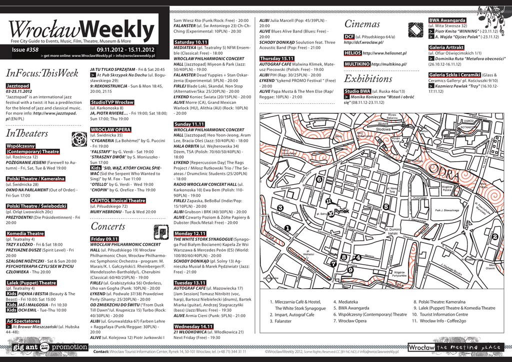 WrocławWeekly Sam Wiesz Kto (Funk/Rock: Free) - 20:00 FALANSTER (ul. Św Antoniego 23) Ch-ChChing (Experimental: 10PLN) - 20:30 Free City Guide to Events, Music, Film, Theatre, Museum & More Saturday 10.11 Issue #358 MEDIATEKA (pl. Teatralny 5) NFM Ensemble (Classical: Free) - 18:00 WROCŁAW PHILHARMONIC CONCERT HALL [Jazztopad] Miyeon & Park (Jazz: 50/40PLN) - 19:00 FALANSTER Dead Yuppies + Stan Oskarżenia (Experimental: 5PLN) - 20:00 FIRLEJ Blade Loki, Skandal, Non Stop (Alternative/Ska: 25/20PLN) - 20:00 ŁYKEND Koniec Świata (20/15PLN) - 20:00 ALIVE Morre (CA), Grand Mexican Warlock (HU), Alithia (AU) (Rock: 10PLN) - 20:00 09.11.2012 - 15.11.2012 > get more online: www.WroclawWeekly.pl > [email protected] InFocus:ThisWeek Jazztopad 03-25.11.2012 “Jazztopad" is an international jazz festival with a twist: it has a predilection for the blend of jazz and classical music. For more info: http://www.jazztopad. pl (EN/PL) InTheaters Współczesny (Contemporary) Theatre (ul. Rzeźnicza 12) Pożegnanie jesieni (Farewell to Autumn) - Fri, Sat, Tue & Wed 19:00 Polski Theatre / Kameralna (ul. Świdnicka 28) Okno na Parlament (Out of Order) Fri-Sun 17:00 Polski Theatre / Świebodzki (pl. Orląt Lwowskich 20c) Prezydentki (Die Präsidentinnen) - Fri 20:00 Komedia Theatre (pl. Teatralny 4) Trzy x Łóżko - Fri & Sat 18:00 Przyjazne Dusze (Spirit Level) - Fri 20:00 Szalone nożyczki - Sat & Sun 20:00 Psychoterapia czyli sex w życiu człowieka - Thu 20:00 Lalek (Puppet) Theatre (pl. Teatralny 4) Kids Piękna i Bestia (Beauty & The Beast) - Fri 10:00; Sat 15:00 Kids Jaś i Małgosia - Fri 10:30 Kids Och Emil - Tue-Thu 10:00 Ad Spectatores > At Browar Mieszczański (ul. Hubska 44-48): Ja tu tylko sprzątam - Fri & Sat 20:45 > At Pub Skrzypek Na Dachu (ul. Bogusławskiego 29): 9: rekonstrukcja - Sun & Mon 18:45, 20:00, 21:15 StudioTVP Wrocław (ul. Karkonoska 8) Ja, Piotr Riviere… - Fri 19:00; Sat 18:00; Sun 17:00; Thu 19:00 WROCŁAW OPERA (ul. Świdnicka 35) “Cyganeria (La Bohème)" by G. Puccini - Fri 19:00 “Falstaff" by G. Verdi - Sat 19:00 “Straszny dwór" by S. Moniuszko Sun 17:00 Kids “Sid, wąż, który chciał śpiewać (Sid the Serpent Who Wanted to Sing)" by M. Fox - Tue 11:00 “Otello" by G. Verdi - Wed 19:00 “Chopin" by G. Orefice - Thu 19:00 CAPITOL Musical Theatre (ul. Piłsudskiego 72) Mury Hebronu - Tue & Wed 20:00 Concerts Friday 09.11 WROCŁAW PHILHARMONIC CONCERT HALL (ul. Piłsudskiego 19) Wrocław Philharmonic Choir, Wrocław Philharmonic Symphonic Orchestra - program: M. Marais/K. I. Gałczyński/J. Rheinberger/F. Mendelssohn-Bartholdy/L. Cherubini (Classical: 60/40/25PLN) - 19:00 FIRLEJ (ul. Grabiszyńska 56) Orderless, Uho van Gogha (Punk: 10PLN) - 20:00 ŁYKEND (ul. Podwale 37/38) Prawdziwe Perły (Shanty: 25/20PLN) - 20:00 OD ZMIERZCHU DO ŚWITU (“From Dusk Till Dawn"/ul. Krupnicza 15) Turbo (Rock: 40/30PLN) - 20:00 ALIBI (ul. Grunwaldzka 67) Farben Lehre + Raggafaya (Punk/Reggae: 30PLN) 20:00 ALIVE (ul. Kolejowa 12) Piotr Jurkowski I ALIBI Julia Marcell (Pop: 45/39PLN) 20:00 ALIVE Blues Alive Band (Blues: Free) 20:00 SCHODY DONIKĄD Soulution feat. Three Acoustic Band (Pop: Free) - 21:00 Thursday 15.11 AUTOGRAF CAFE Malwina Klimek, Mateusz Piecowski (Polish: Free) - 19:00 ALIBI PIH (Rap: 30/25PLN) - 20:00 ŁYKEND “Łykend PROMO Festival “ (Free) - 20:00 ALIVE Papa Musta & The Men Else (Rap/ Reggae: 10PLN) - 21:00 Cinemas BWA Awangarda (ul. Wita Stwosza 32) > Piotr Kmita “WINNING" (-23.11.12) > A. Wajda “Ojciec Polak" (-23.11.12) DCF (ul. Piłsudskiego 64/a) http://dcf.wroclaw.pl/ Galeria Arttrakt HELIOS http://www.heliosnet.pl (ul. Ofiar Oświęcimskich 1/1) > Dominika Ruta “Metafora obecności" (26.10.12-16.11.12) MULTIKINO http://multikino.pl/ Exhibitions Studio BWA (ul. Ruska 46a/13) > Monika Konieczna “Wstań i obróć Galeria Szkła i Ceramiki (Glass & Ceramics Gallery/ pl. Kościuszki 9/10) > Kazmierz Pawlak “Trzy" (16.10.1217.11.12) się" (08.11.12-23.11.12) Sunday 11.11 WROCŁAW PHILHARMONIC CONCERT HALL [Jazztopad] Heo Yoon-Jeong, Aram Lee, Bracia Oleś (Jazz: 50/40PLN) - 18:00 HALA ORBITA (ul. Wejherowska 34) Dżem, TSA (Polish: 70/60/50/40PLN) 18:00 ŁYKEND [Repercussion Day] The Rags Project / Miłosz Rutkowski Trio / The Seateas / Drumclinic Students (25/20PLN) pl. Jana - 18:00 Pawła II RADIO WROCŁAW CONCERT HALL (ul. Karkonoska 10) Ewa Bem (Polish: 11090PLN) - 19:00 FIRLEJ Zapaska, BeBoBul (Indie/Pop: 15/10PLN) - 20:00 ALIBI Grubson i BRK (40/30PLN) - 20:00 ALIVE Czwarty Poziom & Żółte Papiery & Dubster (Rock/Metal: Free) - 20:00 Monday 12.11 6 11 3 5 10 1 THE WHITE STORK SYNAGOGUE (Synagoga Pod Białym Bocianem) Kapela Ze Wsi Warszawa & Mercedes Peón (ES) (World: 100/80/60/40PLN) - 20:00 SCHODY DONIKĄD (pl. Solny 13) Agnieszka Musiał & Marek Pędziwiatr (Jazz: Free) - 21:00 2 7 8 4 9 Tuesday 13.11 AUTOGRAF CAFE (ul. Mazowiecka 17) [Jam Session] Tomasz Nitribitt (voc, harp), Bartosz Niebielecki (drums), Bartek Miarka (guitar), Andrzej Stagraczyńki (bass) (Jazz/Blues: Free) - 19:30 ALIVE Armia Cieni (Punk: 5PLN) - 21:00 Wednesday 14.11 1. Mleczarnia Café & Hostel, The White Stork Synagogue 2. Impart, Autograf Cafe 3. Falanster 4. 5. 6. 7. Mediateka BWA Awangarda Współczesny (Contemporary) Theatre Wrocław Opera 8. Polski Theatre: Kameralna 9. Lalek (Puppet) Theatre & Komedia Theatre 10. Tourist Information Centre 11. Wrocław Info - Coffee2go 21 WŁODKOWICA (ul. Włodkowica 21) Next Friday (Free) - 19:30 Contact: Wrocław Tourist Information Center, Rynek 14, 50-101 Wrocław, tel. (+48 71) 344 31 11 ©WrocławWeekly 2012, Some Rights Reserved CC [BY-NC-ND] // [email protected] 12