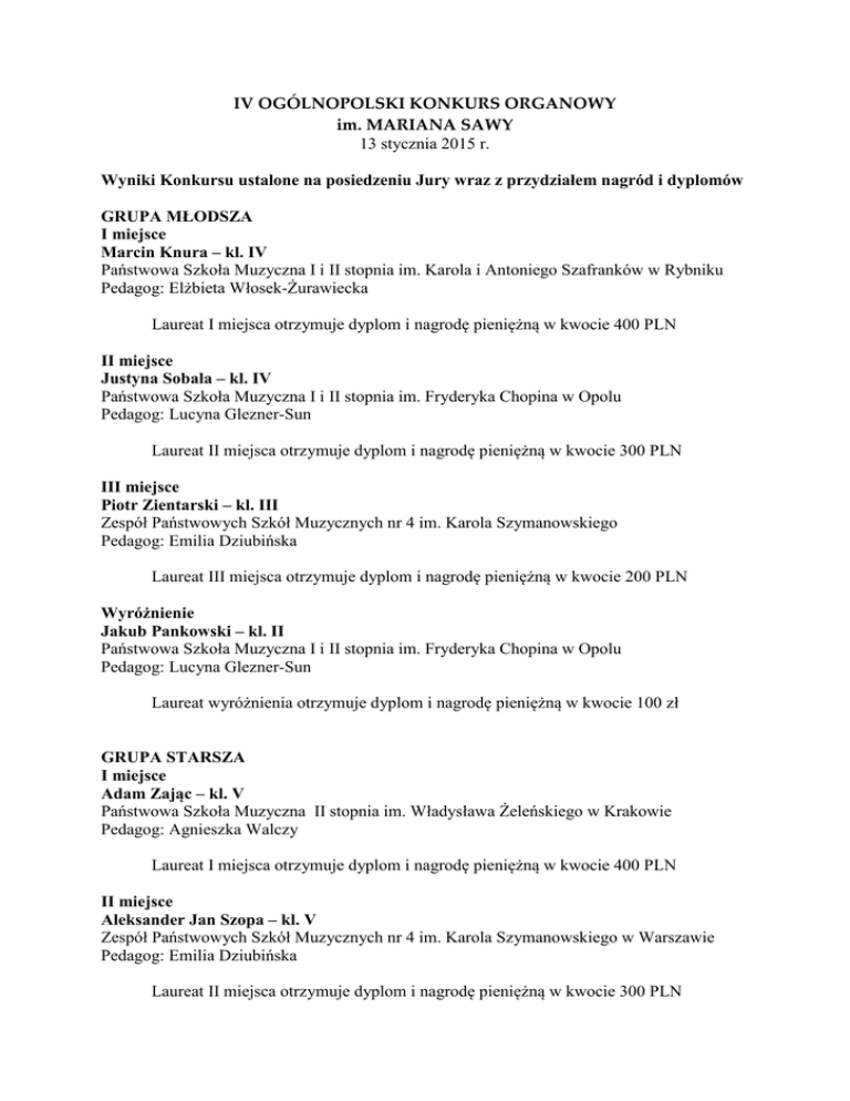 IV OGÓLNOPOLSKI KONKURS ORGANOWY im. MARIANA SAWY 13 stycznia 2015 r. Wyniki Konkursu ustalone na posiedzeniu Jury wraz z przydziałem nagród i dyplomów GRUPA MŁODSZA I miejsce Marcin Knura – kl. IV Państwowa Szkoła Muzyczna I i II stopnia im. Karola i Antoniego Szafranków w Rybniku Pedagog: Elżbieta Włosek-Żurawiecka Laureat I miejsca otrzymuje dyplom i nagrodę pieniężną w kwocie 400 PLN II miejsce Justyna Sobala – kl. IV Państwowa Szkoła Muzyczna I i II stopnia im. Fryderyka Chopina w Opolu Pedagog: Lucyna Glezner-Sun Laureat II miejsca otrzymuje dyplom i nagrodę pieniężną w kwocie 300 PLN III miejsce Piotr Zientarski – kl. III Zespół Państwowych Szkół Muzycznych nr 4 im. Karola Szymanowskiego Pedagog: Emilia Dziubińska Laureat III miejsca otrzymuje dyplom i nagrodę pieniężną w kwocie 200 PLN Wyróżnienie Jakub Pankowski – kl. II Państwowa Szkoła Muzyczna I i II stopnia im. Fryderyka Chopina w Opolu Pedagog: Lucyna Glezner-Sun Laureat wyróżnienia otrzymuje dyplom i nagrodę pieniężną w kwocie 100 zł GRUPA STARSZA I miejsce Adam Zając – kl. V Państwowa Szkoła Muzyczna II stopnia im. Władysława Żeleńskiego w Krakowie Pedagog: Agnieszka Walczy Laureat I miejsca otrzymuje dyplom i nagrodę pieniężną w kwocie 400 PLN II miejsce Aleksander Jan Szopa – kl. V Zespół Państwowych Szkół Muzycznych nr 4 im. Karola Szymanowskiego w Warszawie Pedagog: Emilia Dziubińska Laureat II miejsca otrzymuje dyplom i nagrodę pieniężną w kwocie 300 PLN Wyróżnienia Piotr Chromiński – kl. V Zespół Państwowych Szkół Muzycznych nr 4 im. Karola Szymanowskiego w Warszawie Pedagog: Marietta Kruzel-Sosnowska Szymon Gwóźdź – kl. V Państwowa Szkoła Muzyczna im. Mieczysława Karłowicza w Katowicach Pedagog: Brygida Tomala Joanna Rosicka – kl. IV Państwowa Szkoła Muzyczna I i II stopnia im. Fryderyka Chopina w Opolu Pedagog: Lucyna Glezner-Sun Laureaci wyróżnienia otrzymują dyplom i nagrody pieniężne w kwocie 100 zł Ponadto Jury postanowiło wyróżnić i przyznać dyplomy następującym pedagogom (w kolejności alfabetycznej): Emilia Dziubińska, Lucyna Glezner-Sun, Marietta KruzelSosnowska, Brygida Tomala, Agnieszka Walczy, Elżbieta Włosek-Żurawiecka. Wszyscy uczestnicy Konkursu otrzymują dyplomy uczestnictwa. Wszyscy uczestnicy Konkursu otrzymują upominki w postaci płyty CD oraz nut utworów organowych M. Sawy. Wszyscy pedagodzy otrzymują upominki w postaci nut utworów organowych M. Sawy. Sekretarz Jury Joanna Oczkowska