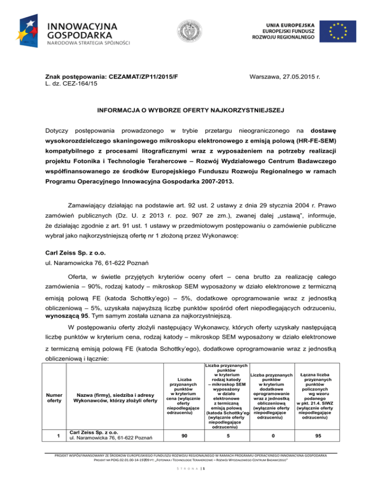 Znak postępowania: CEZAMAT/ZP11/2015/F L. dz. CEZ-164/15 Warszawa, 27.05.2015 r. INFORMACJA O WYBORZE OFERTY NAJKORZYSTNIEJSZEJ Dotyczy postępowania prowadzonego w trybie przetargu nieograniczonego na dostawę wysokorozdzielczego skaningowego mikroskopu elektronowego z emisją polową (HR-FE-SEM) kompatybilnego z procesami litograficznymi wraz z wyposażeniem na potrzeby realizacji projektu Fotonika i Technologie Terahercowe – Rozwój Wydziałowego Centrum Badawczego współfinansowanego ze środków Europejskiego Funduszu Rozwoju Regionalnego w ramach Programu Operacyjnego Innowacyjna Gospodarka 2007-2013. Zamawiający działając na podstawie art. 92 ust. 2 ustawy z dnia 29 stycznia 2004 r. Prawo zamówień publicznych (Dz. U. z 2013 r. poz. 907 ze zm.), zwanej dalej „ustawą”, informuje, że działając zgodnie z art. 91 ust. 1 ustawy w przedmiotowym postępowaniu o zamówienie publiczne wybrał jako najkorzystniejszą ofertę nr 1 złożoną przez Wykonawcę: Carl Zeiss Sp. z o.o. ul. Naramowicka 76, 61-622 Poznań Oferta, w świetle przyjętych kryteriów oceny ofert – cena brutto za realizację całego zamówienia – 90%, rodzaj katody – mikroskop SEM wyposażony w działo elektronowe z termiczną emisją polową FE (katoda Schottky’ego) – 5%, dodatkowe oprogramowanie wraz z jednostką obliczeniową – 5%, uzyskała najwyższą liczbę punktów spośród ofert niepodlegających odrzuceniu, wynoszącą 95. Tym samym została uznana za najkorzystniejszą. W postępowaniu oferty złożyli następujący Wykonawcy, których oferty uzyskały następującą liczbę punktów w kryterium cena, rodzaj katody – mikroskop SEM wyposażony w działo elektronowe z termiczną emisją polową FE (katoda Schottky’ego), dodatkowe oprogramowanie wraz z jednostką obliczeniową i łącznie: Numer oferty 1 Nazwa (firmy), siedziba i adresy Wykonawców, którzy złożyli oferty Carl Zeiss Sp. z o.o. ul. Naramowicka 76, 61-622 Poznań Liczba przyznanych punktów Łączna liczba w kryterium Liczba przyznanych przyznanych rodzaj katody Liczba punktów punktów – mikroskop SEM przyznanych w kryterium policzonych wyposażony punktów dodatkowe wg wzoru w działo w kryterium oprogramowanie podanego elektronowe cena (wyłącznie wraz z jednostką w pkt. 21.4. SIWZ z termiczną oferty obliczeniową (wyłącznie oferty emisją polową niepodlegające (wyłącznie oferty niepodlegające odrzuceniu) E (katoda Schottky’ego niepodlegające odrzuceniu) odrzuceniu) (wyłącznie oferty niepodlegające odrzuceniu) 90 5 0 95 PROJEKT WSPÓŁFINANSOWANY ZE ŚRODKOW EUROPEJSKIEGO FUNDUSZU ROZWOJU REGIONALNEGO W RAMACH PROGRAMU OPERACYJNEGO INNOWACYJNA GOSPODARKA PROJEKT NR POIG.02.01.00-14-197/09 PT: „FOTONIKA I TECHNOLOGIE TERAHERCOWE – ROZWÓJ WYDZIAŁOWEGO CENTRUM BADAWCZEGO" S T R O N A |1 Wykonawcy, który ma lub miał interes w uzyskaniu danego zamówienia oraz poniósł lub może ponieść szkodę w wyniku naruszenia przez Zamawiającego przepisów ustawy, przysługują środki ochrony prawnej przewidziane w Dziale VI ustawy. Romuald Beck /-/ Wiceprezes Zarządu CEZAMAT PW Sp. z o.o. ds. naukowych Mariusz Wielec /-/ Prezes Zarządu CEZAMAT PW Sp. z o.o. PROJEKT WSPÓŁFINANSOWANY ZE ŚRODKOW EUROPEJSKIEGO FUNDUSZU ROZWOJU REGIONALNEGO W RAMACH PROGRAMU OPERACYJNEGO INNOWACYJNA GOSPODARKA PROJEKT NR POIG.02.01.00-14-197/09 PT: „FOTONIKA I TECHNOLOGIE TERAHERCOWE – ROZWÓJ WYDZIAŁOWEGO CENTRUM BADAWCZEGO" S T R O N A |2