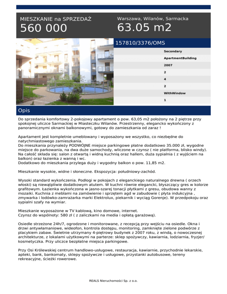 MIESZKANIE na SPRZEDAŻ 560 000 Warszawa, Wilanów, Sarmacka 63.05 m2 157810/3376/OMS Secondary ApartmentBuilding 2007 2 4 2 WithWindow 1 Opis Do sprzedania komfortowy 2-pokojowy apartament o pow. 63,05 m2 położony na 2 piętrze przy spokojnej uliczce Sarmackiej w Miasteczku Wilanów. Przestrzenny, elegancko wykończony z panoramicznymi oknami balkonowymi, gotowy do zamieszkania od zaraz ! Apartament jest kompletnie umeblowany i wyposażony we wszystko, co niezbędne do natychmiastowego zamieszkania. Do mieszkania przynależy PODWÓJNE miejsce parkingowe płatne dodatkowo 35.000 zł, wygodne miejsce do parkowania, na dwa duże samochody, wliczone w czynsz ( nie platforma, blisko windy). Na całość składa się: salon z otwartą i widną kuchnią oraz hallem, duża sypialnia ( z wyjściem na balkon) oraz łazienka z wanną i wc. Dodatkowo do mieszkania przylega duży i wygodny balkon o pow. 11,85 m2. Mieszkanie wysokie, widne i słoneczne. Ekspozycja: południowy-zachód. Wysoki standard wykończenia. Podłogi w pokojach z eleganckiego naturalnego drewna ( orzech włoski) są niewątpliwie dodatkowym atutem. W kuchni równie elegancki, błyszczący gres w kolorze grafitowym. Łazienka wykończona w jasno-szarej tonacji płytkami z gresu, obudowa wanny z mozaiki. Kuchnia z meblami na zamówienie i sprzętem agd w zabudowie ( płyta indukcyjna , zmywarka i lodówko-zamrażarka marki Elektrolux, piekarnik i wyciąg Gorenje). W przedpokoju oraz sypialni szafy na wymiar. Mieszkanie wyposażone w TV kablową, kino domowe, internet. Czynsz do wspólnoty: 580 zł ( z zaliczkami na media i opłatą garażową). Osiedle strzeżone 24h/7, ogrodzone i monitorowane, z recepcją przy wejściu na osiedle. Okna i drzwi antywłamaniowe, wideofon, kontrola dostępu, monitoring, zamknięte zielone podwórze z placykiem zabaw. Świetnie utrzymany 4-piętrowy budynek z 2007 roku, z windą, o nowoczesnej architekturze, z lokalami użytkowymi na parterze: sklep spożywczy, kawiarnia, lodziarnia, fryzjer/ kosmetyczka. Przy uliczce bezpłatne miejsca parkingowe. Przy Osi Królewskiej centrum handlowo-usługowe, restauracja, kawiarnie, przychodnie lekarskie, apteki, bank, bankomaty, sklepy spożywcze i usługowe, przystanki autobusowe, tereny rekreacyjne, ścieżki rowerowe. REALS Nieruchomości Sp. z o.o. Polecam i zapraszam na prezentację. Oddział Eliza Czechowicz tel. 531 007 511 tel. 22 829 92 10 email: [email protected] REALS Nieruchomości Sp. z o.o. Powered by TCPDF (www.tcpdf.org)
