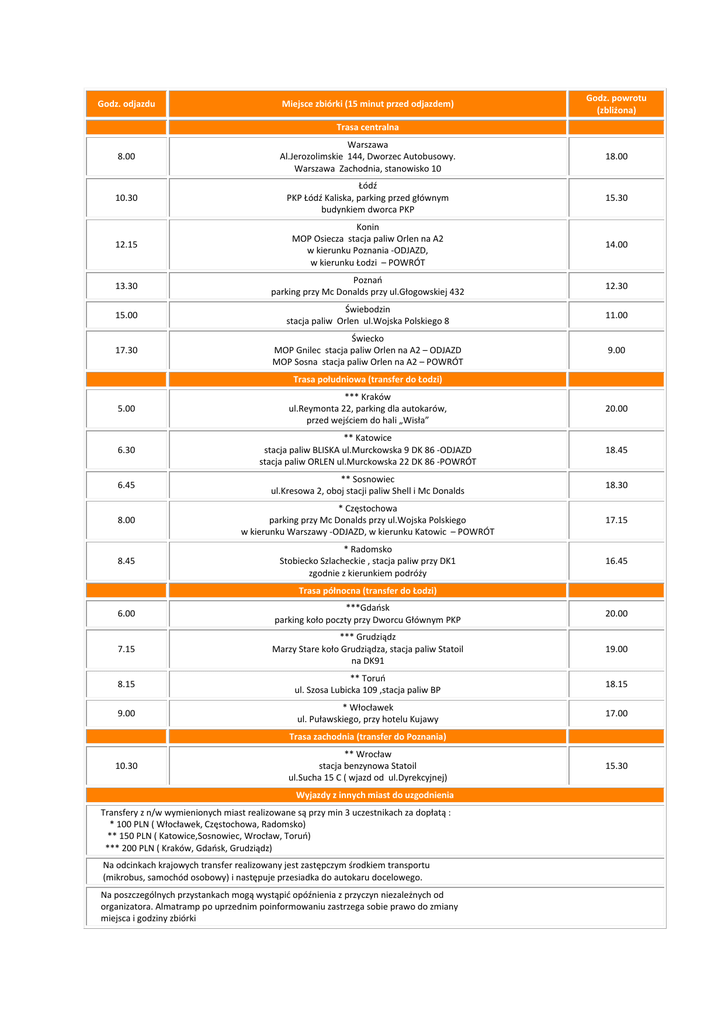 Godz. odjazdu Miejsce zbiórki (15 minut przed odjazdem) Godz. powrotu (zbliżona) Trasa centralna 8.00 Warszawa Al.Jerozolimskie 144, Dworzec Autobusowy. Warszawa Zachodnia, stanowisko 10 18.00 10.30 Łódź PKP Łódź Kaliska, parking przed głównym budynkiem dworca PKP 15.30 12.15 Konin MOP Osiecza stacja paliw Orlen na A2 w kierunku Poznania -ODJAZD, w kierunku Łodzi – POWRÓT 14.00 13.30 Poznań parking przy Mc Donalds przy ul.Głogowskiej 432 12.30 15.00 Świebodzin stacja paliw Orlen ul.Wojska Polskiego 8 11.00 17.30 Świecko MOP Gnilec stacja paliw Orlen na A2 – ODJAZD MOP Sosna stacja paliw Orlen na A2 – POWRÓT 9.00 Trasa południowa (transfer do Łodzi) 5.00 *** Kraków ul.Reymonta 22, parking dla autokarów, przed wejściem do hali „Wisła” 20.00 6.30 ** Katowice stacja paliw BLISKA ul.Murckowska 9 DK 86 -ODJAZD stacja paliw ORLEN ul.Murckowska 22 DK 86 -POWRÓT 18.45 6.45 ** Sosnowiec ul.Kresowa 2, oboj stacji paliw Shell i Mc Donalds 18.30 8.00 * Częstochowa parking przy Mc Donalds przy ul.Wojska Polskiego w kierunku Warszawy -ODJAZD, w kierunku Katowic – POWRÓT 17.15 8.45 * Radomsko Stobiecko Szlacheckie , stacja paliw przy DK1 zgodnie z kierunkiem podróży 16.45 Trasa północna (transfer do Łodzi) 6.00 ***Gdańsk parking koło poczty przy Dworcu Głównym PKP 20.00 7.15 *** Grudziądz Marzy Stare koło Grudziądza, stacja paliw Statoil na DK91 19.00 8.15 ** Toruń ul. Szosa Lubicka 109 ,stacja paliw BP 18.15 9.00 * Włocławek ul. Puławskiego, przy hotelu Kujawy 17.00 Trasa zachodnia (transfer do Poznania) 10.30 ** Wrocław stacja benzynowa Statoil ul.Sucha 15 C ( wjazd od ul.Dyrekcyjnej) Wyjazdy z innych miast do uzgodnienia Transfery z n/w wymienionych miast realizowane są przy min 3 uczestnikach za dopłatą : * 100 PLN ( Włocławek, Częstochowa, Radomsko) ** 150 PLN ( Katowice,Sosnowiec, Wrocław, Toruń) *** 200 PLN ( Kraków, Gdańsk, Grudziądz) Na odcinkach krajowych transfer realizowany jest zastępczym środkiem transportu (mikrobus, samochód osobowy) i następuje przesiadka do autokaru docelowego. Na poszczególnych przystankach mogą wystąpić opóźnienia z przyczyn niezależnych od organizatora. Almatramp po uprzednim poinformowaniu zastrzega sobie prawo do zmiany miejsca i godziny zbiórki 15.30