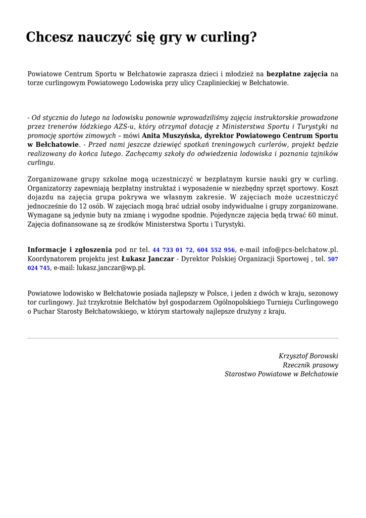 Chcesz nauczyć się gry w curling? Powiatowe Centrum Sportu w Bełchatowie zaprasza dzieci i młodzież na bezpłatne zajęcia na torze curlingowym Powiatowego Lodowiska przy ulicy Czaplinieckiej w Bełchatowie. - Od stycznia do lutego na lodowisku ponownie wprowadziliśmy zajęcia instruktorskie prowadzone przez trenerów łódzkiego AZS-u, który otrzymał dotację z Ministerstwa Sportu i Turystyki na promocję sportów zimowych – mówi Anita Muszyńska, dyrektor Powiatowego Centrum Sportu w Bełchatowie. - Przed nami jeszcze dziewięć spotkań treningowych curlerów, projekt będzie realizowany do końca lutego. Zachęcamy szkoły do odwiedzenia lodowiska i poznania tajników curlingu. Zorganizowane grupy szkolne mogą uczestniczyć w bezpłatnym kursie nauki gry w curling. Organizatorzy zapewniają bezpłatny instruktaż i wyposażenie w niezbędny sprzęt sportowy. Koszt dojazdu na zajęcia grupa pokrywa we własnym zakresie. W zajęciach może uczestniczyć jednocześnie do 12 osób. W zajęciach mogą brać udział osoby indywidualne i grupy zorganizowane. Wymagane są jedynie buty na zmianę i wygodne spodnie. Pojedyncze zajęcia będą trwać 60 minut. Zajęcia dofinansowane są ze środków Ministerstwa Sportu i Turystyki. Informacje i zgłoszenia pod nr tel. 44 733 01 72, 604 552 956, e-mail [email protected]. Koordynatorem projektu jest Łukasz Janczar - Dyrektor Polskiej Organizacji Sportowej , tel. 507 024 745, e-mail: [email protected]. Powiatowe lodowisko w Bełchatowie posiada najlepszy w Polsce, i jeden z dwóch w kraju, sezonowy tor curlingowy. Już trzykrotnie Bełchatów był gospodarzem Ogólnopolskiego Turnieju Curlingowego o Puchar Starosty Bełchatowskiego, w którym startowały najlepsze drużyny z kraju. Krzysztof Borowski Rzecznik prasowy Starostwo Powiatowe w Bełchatowie