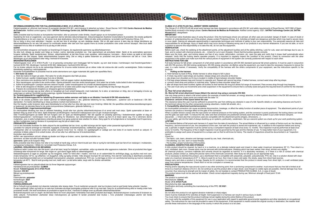INFORMASJONSBROSJYRE FOR FALLSIKRINGSSELE MOD. 21-C ATEX PLUS Fallsikringsselen er utformet med hensyn til europeisk standard EN 361, samt kravene til sikkerhet og helse i Royal Decree 1407/1992 Centro Nacional de Medios de Protección. Notified control agency: 0321. SATRA Technology Centre Ltd, SATRA Housedeltok i designfasen VIKTIG Dette produktet skal kun brukes av kompetente mennesker, eller av personer under direkte, visuelt oppsyn av en kompetent person. Opplæring før bruk er avgjørende. Les nøye gjennom denne tekniske dokumentasjonen. Dokumentasjonen illustrerer bruksmåtene til produktet. De eneste godkjente bruksteknikkene er de som vises her. All annen bruk skal ekskluderes: fare for død. I tilfelle tvil eller andre problemer, ta kontakt med Productos Climax, S.A. Det er farlig å drive med aktiviteter i høyden, og det kan føre til alvorlige, og selv dødelige skader. Det er ditt eget ansvar å lære deg de riktige teknikkene og sikkerhetstiltakene.Du tar selv fullt ansvar for eventuelle skader eller død som kan oppstå mens du bruker produktene våre under enhver situasjon. Ikke bruk dette materialet hvis du ikke er kvalifisert til å ta på deg et slikt ansvar. SJEKK Du må kontrollere stroppene ved høyden av forankrings D-ringene, de regulerende spennene og sikkerhetssømmen. Se etter kutt, slitasje og skader som følge av bruken, varme, kjemiske produkter osv. Vær oppmerksom på avkuttede tråder. Sjekk at de automatiske spennene fungerer skikkelig. Sjekk karabinkroken, klinken, sikkerhetslokket, at det ikke finnes noen sprekker, deformasjoner, korrosjon... Åpne kroken og sjekk at det lukkes automatisk når den slippes. Sjekk sikkerhetslokket fungerer riktig. Det er viktig å sjekke tilstanden av produktet med jevne mellomrom når det er i bruk. Sikre tilkoblingen og at utstyrssettene sitter riktig i henhold til hverandre. BRUKSINSTRUKSJONER Fallsikringssele mod. 21-C ATEX PLUS/ 1 er et personlig verneutstyr som forebygger fall fra høyder, og som skal brukes i kombinasjon med forankringsenheter i henhold til EN 795, tilkoblinger i henhold til EN 362, falldempere i henhold til EN 355 osv. Før du bruker utstyret må du ta de nødvendige tiltakene for å kunne redde brukeren på en sikker måte når sistnevnte står overfor vanskeligheter. Dette innebærer tilstrekkelig opplæring i redningsteknikk. Kontroller kompatibiliteten til produktet med de andre elementene som utgjør materialet ditt (sjekk den spesifikke filen). 1. Slik fester du selen a. Hold den bakre D-ringen på selen. Rist selen for at alle stroppene skal falle på plass. b. Koble fra bryst- og/eller midjestropper hvis de er tilkoblet. c. Skyv remmene over skuldrene helt til D-ringen sitter i midt på ryggen mellom skulderbladene og skuldrene. d. Skyv benstroppen og koble til den andre enden. Gjenta prosessen med den andre benstroppen. Hvis selen har et belte, koble beltet til etter benstroppene. e. Koble til bryststroppen i posisjon halvveis nedover brystet. Juster torsostroppene for å holde skulderstroppene stramme. f. Etter at alle stroppene er tilkoblet, juster alle spennene for at selen skal justere seg til kroppen din, og samtidig lar deg bevege deg godt. g. Passere de overskytende lengdene av stroppene gjennom plastløkkene. Brukeren kunne bevege seg og skal utføre en hengetest på hvert enkelt festepunkt, med materialet, for å sikre: at størrelsen er riktig, den er behagelig å bruke og justeringen er optimal. Kontroller jevnlig justerings- og/eller festeelementene under bruk. 2a. Forankringspunkt for ryggfallsikring 2b. Sternalt forankringspunkt for fallsikring (D-spennene settes sammen ved hjelp av en tilkobler i henhold til EN 362-standarden) Dette er de eneste punktene som kobler sammen et fallsikringssystem, f. eks. glidende fallsikring for tau, falldempere... systemer som er beskrevet i EN 363standarden. For bedre identifisering er disse punktene merket med bokstaven A. Den frie høyden under brukeren skal være tilstrekkelig for at han eller hun ikke slår seg mot noen hindring i tilfelle fall. De spesifikke sikkerhetsavstandsberegningene er beskrevet i de tekniske filene for de andre komponentene (falldempere, glidende fallsikring...). 3. Kompatibilitet: ringer/sammenkoblinger En inkompatibel tilkobling kan føre til utilsiktet frakobling, brudd eller kan påvirke sikkerhetsfunksjonen til et annet sett med utstyr. Sjekk systematisk at låsen er blokkert riktig og stram til for hånd. Sjekk tilstanden på tilkoblingene i henhold til indikasjonene som er gitt i bruksanvisningen. Obs! Forankringsringene på beltet ditt kan fungere som en spak på tilkoblingslåsen. Når det oppstår en plutselig spenning i festeelementet og/eller et slag på blokkeringssystemet i kombinasjon med en dårlig stilling for tilkobleren, kan sikkerhetslokket gå i stykker og føre til at låsen åpner seg. For å eliminere denne muligheten, prøv å sette hurtigkrokene ordentlig på plass hver gang systemet skal utsettes for stress. Sørg også for at hurtigkrokene er kompatible med D-spennene, og fjern hurtigkroker med en tendens til å posisjonere seg feil på en stabil måte. PRODUKTETS VARIGHET 5 år er den teoretiske levetiden for dette utstyret fra det øyeblikket det tas i bruk, og alltid så lenge det blir lagret under passende lagringsforhold. Levetiden for utstyret avhenger av intensitet, hyppighet, bruksmiljø, brukerkompetanse, vedlikehold, lagring osv. Produsenten eller en kompetent enhet må sjekke utstyret minst hver 12. måned. En oppfølgingsfil er vedlagt som kan bidra til en bedre kontroll av utstyret. Vi anbefaler å tildele utstyret til én enkelt bruker, slik at han eller hun alltid kjenner til brukshistorikken. Kontrollen skal omfatte: stoffet: vær oppmerksom på kutt, slitasje og skader som følge av bruken, varme, kjemiske produkter osv. sømmene: se etter kutt eller frynsete tråder spennene: sjekk at de fungerer riktig. Dette produktet skal ikke brukes mer etter å ha mottatt et