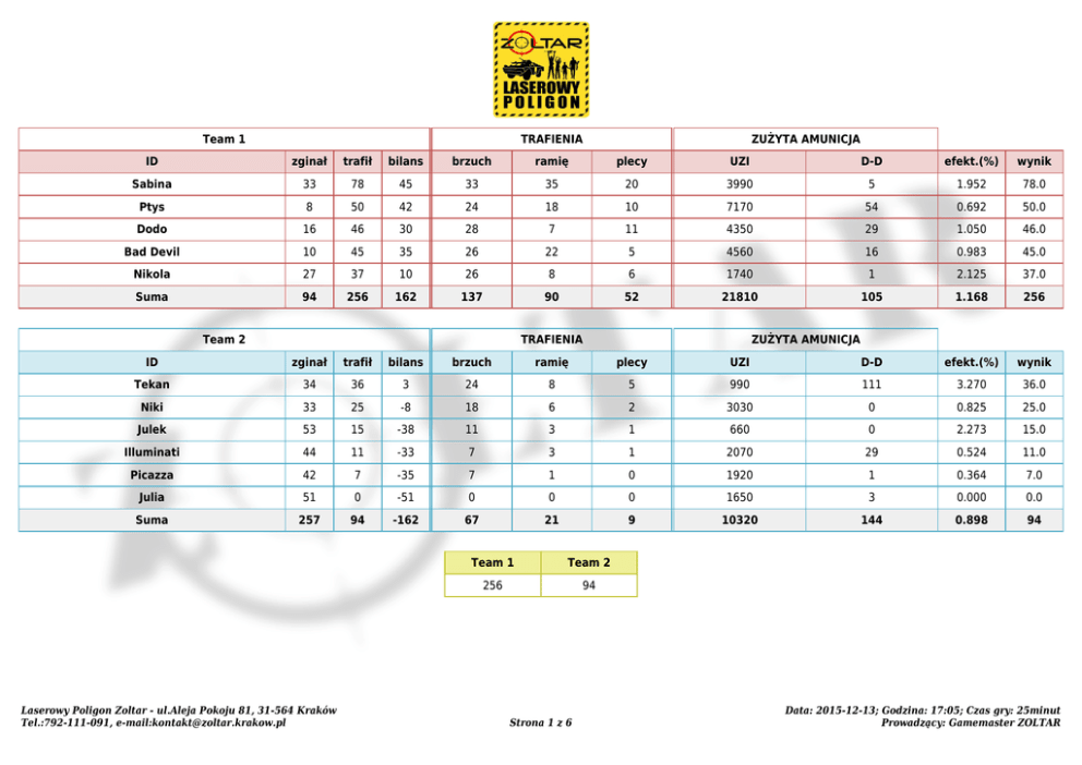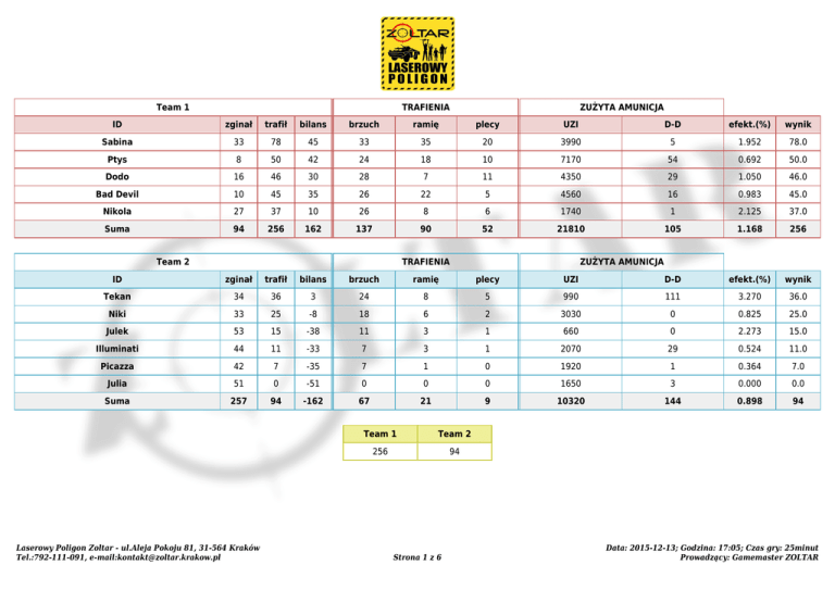 Team 1 TRAFIENIA ZUŻYTA AMUNICJA ID zginał trafił bilans