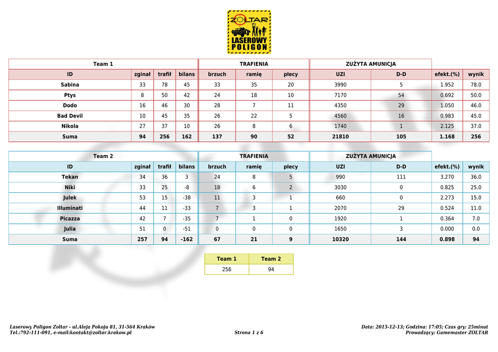Team 1 TRAFIENIA ZUŻYTA AMUNICJA ID zginał trafił bilans brzuch ramię plecy UZI D-D efekt.(%) wynik Sabina 33 78 45 33 35 20 3990 5 1.952 78.0 Ptys 8 50 42 24 18 10 7170 54 0.692 50.0 Dodo 16 46 30 28 7 11 4350 29 1.050 46.0 Bad Devil 10 45 35 26 22 5 4560 16 0.983 45.0 Nikola 27 37 10 26 8 6 1740 1 2.125 37.0 Suma 94 256 162 137 90 52 21810 105 1.168 256 Team 2 TRAFIENIA ZUŻYTA AMUNICJA ID zginał trafił bilans brzuch ramię plecy UZI D-D efekt.(%) wynik Tekan 34 36 3 24 8 5 990 111 3.270 36.0 Niki 33 25 -8 18 6 2 3030 0 0.825 25.0 Julek 53 15 -38 11 3 1 660 0 2.273 15.0 Illuminati 44 11 -33 7 3 1 2070 29 0.524 11.0 Picazza 42 7 -35 7 1 0 1920 1 0.364 7.0 Julia 51 0 -51 0 0 0 1650 3 0.000 0.0 Suma 257 94 -162 67 21 9 10320 144 0.898 94 Laserowy Poligon Zoltar - ul.Aleja Pokoju 81, 31-564 Kraków Tel.:792-111-091, e-mail:[email protected] Team 1 Team 2 256 94 Strona 1 z 6 Data: 2015-12-13; Godzina: 17:05; Czas gry: 25minut Prowadzący: Gamemaster ZOLTAR Team 1 TRAFIENIA ZUŻYTA AMUNICJA ID zginał trafił bilans brzuch ramię plecy UZI D-D efekt.(%) wynik Bad Devil 11 42 31 26 14 4 4740 3 0.886 42.0 Tekan 11 38 27 22 15 6 3990 8 0.950 38.0 Dodo 19 37 18 26 7 4 5280 0 0.701 37.0 Illuminati 24 12 -12 5 1 6 2970 16 0.402 12.0 Julek 18 6 -12 3 0 3 1560 0 0.385 6.0 Ptys 14 4 -10 3 1 0 4650 35 0.085 4.0 Suma 97 139 42 85 38 23 23190 62 0.598 139 Team 2 TRAFIENIA ZUŻYTA AMUNICJA ID zginał trafił bilans brzuch ramię plecy UZI D-D efekt.(%) wynik Niki 33 37 4 31 8 3 4200 0 0.881 37.0 Sabina 41 25 -16 17 4 6 3630 0 0.689 25.0 Nikola 24 23 -1 15 6 2 1830 0 1.257 23.0 Picazza 18 7 -11 5 5 0 2160 0 0.324 7.0 Julia 23 5 -18 2 3 1 660 0 0.758 5.0 Suma 139 97 -42 70 26 12 12480 0 0.777 97 Laserowy Poligon Zoltar - ul.Aleja Pokoju 81, 31-564 Kraków Tel.:792-111-091, e-mail:[email protected] Team 1 Team 2 139 97 Strona 2 z 6 Data: 2015-12-13; Godzina: 18:00; Czas gry: 25minut Prowadzący: Gamemaster ZOLTAR Drużyny Miejsce Laserowy Poligon Zoltar - ul.Aleja Pokoju 81, 31-564 Kraków Tel.:792-111-091, e-mail:[email protected] Nazwa Rozgrywki 1 2 Suma Team 1 256 139 395 Team 2 191 94 Strona 3 z 6 97 Data: 2015-12-13 Prowadzący: Gamemaster ZOLTAR Zestawienie wg wyniku Miejsce TRAFIENIA ZUŻYTA AMUNICJA ID zginał trafił bilans brzuch ramię plecy UZI D-D efekt.(%) wynik Sabina 88.80 123.60 34.80 60.00 46.80 31.20 9144.00 6.00 1.351 123.60 Bad Devil 25.20 104.40 79.20 62.40 43.20 10.80 11160.00 22.80 0.934 104.40 Dodo 42.00 99.60 57.60 64.80 16.80 18.00 11556.00 34.80 0.859 99.60 4 Tekan 54.00 88.80 34.80 55.20 27.60 13.20 5976.00 142.80 1.451 88.80 5 Niki 79.20 74.40 -4.80 58.80 16.80 6.00 8676.00 0.00 0.858 74.40 6 Nikola 61.20 72.00 10.80 49.20 16.80 9.60 4284.00 1.20 1.680 72.00 7 Ptys 26.40 64.80 38.40 32.40 22.80 12.00 14184.00 106.80 0.453 64.80 8 Illuminati 81.60 27.60 -54.00 14.40 4.80 8.40 6048.00 54.00 0.452 27.60 9 Julek 85.20 25.20 -60.00 16.80 3.60 4.80 2664.00 0.00 0.946 25.20 10 Picazza 72.00 16.80 -55.20 14.40 7.20 0.00 4896.00 1.20 0.343 16.80 11 Julia 88.80 6.00 -82.80 2.40 3.60 1.20 2772.00 3.60 0.216 6.00 Laserowy Poligon Zoltar - ul.Aleja Pokoju 81, 31-564 Kraków Tel.:792-111-091, e-mail:[email protected] Strona 4 z 6 Data: 2015-12-13 Prowadzący: Gamemaster ZOLTAR Zestawienie wg bilansu Miejsce TRAFIENIA ZUŻYTA AMUNICJA ID zginał trafił bilans brzuch ramię plecy UZI D-D efekt.(%) wynik Bad Devil 25.20 104.40 79.20 62.40 43.20 10.80 11160.00 22.80 0.934 104.40 Dodo 42.00 99.60 57.60 64.80 16.80 18.00 11556.00 34.80 0.859 99.60 Ptys 26.40 64.80 38.40 32.40 22.80 12.00 14184.00 106.80 0.453 64.80 Tekan 54.00 88.80 55.20 27.60 13.20 5976.00 142.80 1.451 88.80 Sabina 88.80 123.60 60.00 46.80 31.20 9144.00 6.00 1.351 123.60 5 Nikola 61.20 72.00 10.80 49.20 16.80 9.60 4284.00 1.20 1.680 72.00 6 Niki 79.20 74.40 -4.80 58.80 16.80 6.00 8676.00 0.00 0.858 74.40 7 Illuminati 81.60 27.60 -54.00 14.40 4.80 8.40 6048.00 54.00 0.452 27.60 8 Picazza 72.00 16.80 -55.20 14.40 7.20 0.00 4896.00 1.20 0.343 16.80 9 Julek 85.20 25.20 -60.00 16.80 3.60 4.80 2664.00 0.00 0.946 25.20 10 Julia 88.80 6.00 -82.80 2.40 3.60 1.20 2772.00 3.60 0.216 6.00 4 Laserowy Poligon Zoltar - ul.Aleja Pokoju 81, 31-564 Kraków Tel.:792-111-091, e-mail:[email protected] 34.80 Strona 5 z 6 Data: 2015-12-13 Prowadzący: Gamemaster ZOLTAR Zestawienie wg efektywności Miejsce TRAFIENIA ZUŻYTA AMUNICJA ID zginał trafił bilans brzuch ramię plecy UZI D-D efekt.(%) wynik Nikola 61.20 72.00 10.80 49.20 16.80 9.60 4284.00 1.20 1.680 72.00 Tekan 54.00 88.80 34.80 55.20 27.60 13.20 5976.00 142.80 1.451 88.80 Sabina 88.80 123.60 34.80 60.00 46.80 31.20 9144.00 6.00 1.351 123.60 4 Julek 85.20 25.20 -60.00 16.80 3.60 4.80 2664.00 0.00 0.946 25.20 5 Bad Devil 25.20 104.40 79.20 62.40 43.20 10.80 11160.00 22.80 0.934 104.40 6 Dodo 42.00 99.60 57.60 64.80 16.80 18.00 11556.00 34.80 0.859 99.60 7 Niki 79.20 74.40 -4.80 58.80 16.80 6.00 8676.00 0.00 0.858 74.40 8 Ptys 26.40 64.80 38.40 32.40 22.80 12.00 14184.00 106.80 0.453 64.80 9 Illuminati 81.60 27.60 -54.00 14.40 4.80 8.40 6048.00 54.00 0.452 27.60 10 Picazza 72.00 16.80 -55.20 14.40 7.20 0.00 4896.00 1.20 0.343 16.80 11 Julia 88.80 6.00 -82.80 2.40 3.60 1.20 2772.00 3.60 0.216 6.00 Laserowy Poligon Zoltar - ul.Aleja Pokoju 81, 31-564 Kraków Tel.:792-111-091, e-mail:[email protected] Strona 6 z 6 Data: 2015-12-13 Prowadzący: Gamemaster ZOLTAR