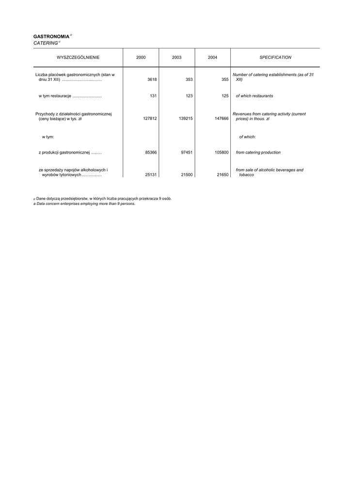 GASTRONOMIA a CATERING a WYSZCZEGÓLNIENIE Liczba placówek gastronomicznych (stan w dniu 31 XII) .................................. w tym restauracje ......................... Przychody z działalności gastronomicznej (ceny bieżące) w tys. zł 2000 2003 2004 SPECIFICATION 3618 353 355 131 123 125 127812 139215 147666 w tym: Number of catering establishments (as of 31 XII) of which restaurants Revenues from catering activity (current prices) in thous. zl of which: z produkcji gastronomicznej ......... 85366 97451 105800 ze sprzedaży napojów alkoholowych i wyrobów tytoniowych ................. 25131 21500 21650 a Dane dotyczą przedsiębiorstw, w których liczba pracujących przekracza 9 osób. a Data concern enterprises employing more than 9 persons. from catering production from sale of alcoholic beverages and tobacco