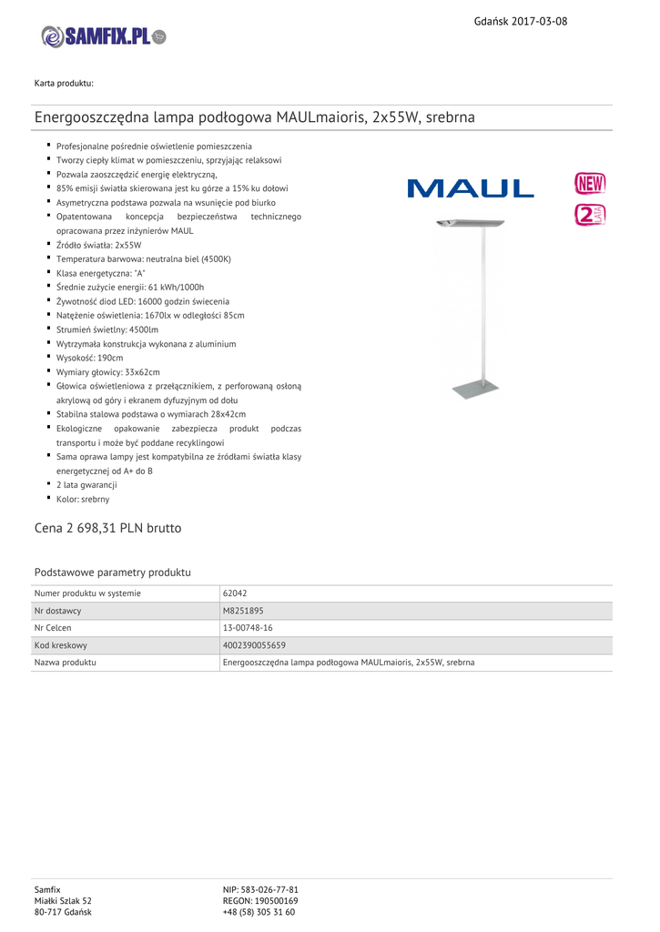 Gdańsk 2017-03-08 Karta produktu: Energooszczędna lampa podłogowa MAULmaioris, 2x55W, srebrna Profesjonalne pośrednie oświetlenie pomieszczenia Tworzy ciepły klimat w pomieszczeniu, sprzyjając relaksowi Pozwala zaoszczędzić energię elektryczną, 85% emisji światła skierowana jest ku górze a 15% ku dołowi Asymetryczna podstawa pozwala na wsunięcie pod biurko Opatentowana koncepcja bezpieczeństwa technicznego opracowana przez inżynierów MAUL Źródło światła: 2x55W Temperatura barwowa: neutralna biel (4500K) Klasa energetyczna: "A" Średnie zużycie energii: 61 kWh/1000h Żywotność diod LED: 16000 godzin świecenia Natężenie oświetlenia: 1670lx w odległości 85cm Strumień świetlny: 4500lm Wytrzymała konstrukcja wykonana z aluminium Wysokość: 190cm Wymiary głowicy: 33x62cm Głowica oświetleniowa z przełącznikiem, z perforowaną osłoną akrylową od góry i ekranem dyfuzyjnym od dołu Stabilna stalowa podstawa o wymiarach 28x42cm Ekologiczne opakowanie zabezpiecza produkt podczas transportu i może być poddane recyklingowi Sama oprawa lampy jest kompatybilna ze źródłami światła klasy energetycznej od A+ do B 2 lata gwarancji Kolor: srebrny Cena 2 698,31 PLN brutto Podstawowe parametry produktu Numer produktu w systemie 62042 Nr dostawcy M8251895 Nr Celcen 13-00748-16 Kod kreskowy 4002390055659 Nazwa produktu Energooszczędna lampa podłogowa MAULmaioris, 2x55W, srebrna Samfix Miałki Szlak 52 80-717 Gdańsk NIP: 583-026-77-81 REGON: 190500169 +48 (58) 305 31 60 Gdańsk 2017-03-08 Karta katalogowa produktu cd. Energooszczędna lampa podłogowa MAULmaioris, 2x55W, srebrna Opis Profesjonalne pośrednie oświetlenie pomieszczenia; tworzy ciepły klimat w pomieszczeniu, sprzyjając relaksowi; pozwala zaoszczędzić energię elektryczną,; 85% emisji światła skierowana jest ku górze a 15% ku dołowi; asymetryczna podstawa pozwala na wsunięcie pod biurko; opatentowana koncepcja bezpieczeństwa technicznego opracowana przez inżynierów MAUL; źródło światła: 2x55W; temperatura barwowa: neutralna biel (4500K); klasa energetyczna: "A"; średnie zużycie energii: 61 kWh/1000h; żywotność diod LED: 16000 godzin świecenia; natężenie oświetlenia: 1670lx w odległości 85cm; strumień świetlny: 4500lm; wytrzymała konstrukcja wykonana z aluminium; wysokość: 190cm; wymiary głowicy: 33x62cm; głowica oświetleniowa z przełącznikiem, z perforowaną osłoną akrylową od góry i ekranem dyfuzyjnym od dołu; stabilna stalowa podstawa o wymiarach 28x42cm; ekologiczne opakowanie zabezpiecza produkt podczas transportu i może być poddane recyklingowi; sama oprawa lampy jest kompatybilna ze źródłami światła klasy energetycznej od A+ do B; 2 lata gwarancji; kolor: srebrny Kategoria Lampki Klasa Premium Marka MAUL Cecha Natężenie światła LUX 1670 Rodzaj 2x55W Natężenie światła LUMEN 4500 Cykl życia (h) 16 000 Typ Energooszczędna Produkt Lampka podłogowa W ofercie od 2016-10 Klasa energetyczna A Materiał Metal/plastik Wymiary Wysokość (mm) 1900 Wspólny słownik zamówień CPV 31521200-6 Certyfikaty Ilość lat gwarancji 2 Hit Standard Nowy produkt w ofercie Nowość Samfix Miałki Szlak 52 80-717 Gdańsk NIP: 583-026-77-81 REGON: 190500169 +48 (58) 305 31 60 Gdańsk 2017-03-08 Karta katalogowa produktu cd. Energooszczędna lampa podłogowa MAULmaioris, 2x55W, srebrna Kolor Kolor Srebrny Pozostałe zdjęcia produktu Serdecznie zapraszamy do współpracy Zespół Samfix. Samfix Miałki Szlak 52 80-717 Gdańsk NIP: 583-026-77-81 REGON: 190500169 +48 (58) 305 31 60