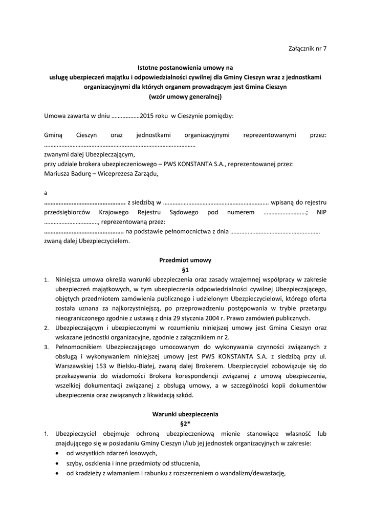 Załącznik nr 7 Istotne postanowienia umowy na usługę ubezpieczeń majątku i odpowiedzialności cywilnej dla Gminy Cieszyn wraz z jednostkami organizacyjnymi dla których organem prowadzącym jest Gmina Cieszyn (wzór umowy generalnej) Umowa zawarta w dniu ………………2015 roku w Cieszynie pomiędzy: Gminą Cieszyn oraz jednostkami organizacyjnymi reprezentowanymi …………………………………………………………………………………… zwanymi dalej Ubezpieczającym, przy udziale brokera ubezpieczeniowego – PWS KONSTANTA S.A., reprezentowanej przez: Mariusza Badurę – Wiceprezesa Zarządu, przez: a ………………………………………….. z siedzibą w …………………………………………………………. wpisaną do rejestru przedsiębiorców Krajowego Rejestru Sądowego pod numerem ………………………; NIP ……………………………., reprezentowaną przez: …………………………………………. na podstawie pełnomocnictwa z dnia ………………………………………………… zwaną dalej Ubezpieczycielem. Przedmiot umowy §1 1. Niniejsza umowa określa warunki ubezpieczenia oraz zasady wzajemnej współpracy w zakresie ubezpieczeń majątkowych, w tym ubezpieczenia odpowiedzialności cywilnej Ubezpieczającego, objętych przedmiotem zamówienia publicznego i udzielonym Ubezpieczycielowi, którego oferta została uznana za najkorzystniejszą, po przeprowadzeniu postępowania w trybie przetargu nieograniczonego zgodnie z ustawą z dnia 29 stycznia 2004 r. Prawo zamówień publicznych. 2. Ubezpieczającym i ubezpieczonymi w rozumieniu niniejszej umowy jest Gmina Cieszyn oraz wskazane jednostki organizacyjne, zgodnie z załącznikiem nr 2. 3. Pełnomocnikiem Ubezpieczającego umocowanym do wykonywania czynności związanych z obsługą i wykonywaniem niniejszej umowy jest PWS KONSTANTA S.A. z siedzibą przy ul. Warszawskiej 153 w Bielsku-Białej, zwaną dalej Brokerem. Ubezpieczyciel zobowiązuje się do przekazywania do wiadomości Brokera korespondencji związanej z umową ubezpieczenia, wszelkiej dokumentacji związanej z obsługą umowy, a w szczególności kopii dokumentów ubezpieczenia oraz związanych z likwidacją szkód. 1. Warunki ubezpieczenia §2* Ubezpieczyciel obejmuje ochroną ubezpieczeniową mienie stanowiące własność lub znajdującego się w posiadaniu Gminy Cieszyn i/lub jej jednostek organizacyjnych w zakresie: od wszystkich zdarzeń losowych, szyby, oszklenia i inne przedmioty od stłuczenia, od kradzieży z włamaniem i rabunku z rozszerzeniem o wandalizm/dewastację, od wszystkich ryzyk – dla sprzętu elektronicznego stacjonarnego i przenośnego, 2. Ubezpieczyciel udziela ochrony w zakresie odpowiedzialności cywilnej Ubezpieczonych, z tytułu posiadanego przez nich mienia oraz prowadzonej działalności. 3. Szczegółowy zakres ochrony ubezpieczeniowej udzielanej dla ubezpieczeń wymienionych w ust. 1 i 2 określa załącznik nr 1. 4. Wykaz jednostek organizacyjnych objętych umową ubezpieczenia określa załącznik nr 2. 5. Wykaz poszczególnych składników mienia oraz sum ubezpieczenia dla ubezpieczenia od ognia i innych zdarzeń losowych oraz ubezpieczenia sprzętu elektronicznego określa załącznik nr 3. 6. Ubezpieczyciel obejmuje ochroną ubezpieczeniową w zakresie wybranych ubezpieczeń komunikacyjnych pojazdy objęte wykazem stanowiącym załącznik nr 4. 7. Ubezpieczyciel obejmuje dodatkową (nadwyżkową) ochroną odpowiedzialność cywilną Gminy Cieszyn oraz jednostek organizacyjnych. 8. Ubezpieczyciel obejmuje ochroną ubezpieczeniową następstwa nieszczęśliwych wypadków Członków Ochotniczych Straży Pożarnych Gminy Cieszyn (typ I i typ II). 9. Ubezpieczyciel obejmuje ochroną ubezpieczeniową odpowiedzialność cywilną za szkody spowodowane podejmowaniem decyzji i wydawaniem decyzji administracyjnych i składaniem oświadczeń woli. 10. W razie gdy postanowienia ogólnych warunków ubezpieczenia są sprzeczne z zapisami niniejszej umowy lub szczegółowych warunków ubezpieczenia opisanych w załączniku nr 1, stosuje się zapisy niniejszej umowy. Zasady obsługi umowy §3 1. Mienie zgłoszone przez Ubezpieczającego do ubezpieczenia w trakcie trwania niniejszej umowy generalnej będzie ubezpieczane do dnia 31 grudnia 2017 roku. 2. W razie zgłoszenia mienia do ubezpieczenia zgodnie z ust. 1 Ubezpieczyciel potwierdzi objęcie ochroną ubezpieczeniową dokumentem ubezpieczenia w terminie do 2 dni roboczych od otrzymania wszystkich danych niezbędnych do ubezpieczenia tego mienia. 1. 2. Zasady płatności i rozliczania składki ubezpieczeniowej §4 Stawka mająca zastosowanie do obliczenia ceny oferty dla poszczególnych rodzajów ubezpieczeń ma zastosowanie przez okres obowiązywania niniejszej umowy, przy czym składka za ubezpieczenie mienia zgłaszanego do ubezpieczenia w ciągu danego roku ubezpieczenia zostanie obliczona z zachowaniem faktycznego okresu udzielania ochrony ubezpieczeniowej – pro rata, do dnia 31 grudnia danego roku. Ubezpieczyciel oświadcza, że do obliczenia ceny ubezpieczenia mienia i odpowiedzialności cywilnej zastosował następujące składki lub stawki procentowe: a) ubezpieczenie mienia od ognia i innych zdarzeń losowych: …………%, b) ubezpieczenie szyb i oszkleń: …………… zł przy zachowaniu limitów wspólnych obejmujących wszystkie zgłoszone jednostki, opisanych w załączniku nr 1, c) ubezpieczenie mienia od kradzieży z włamaniem i rabunku: …………zł przy zachowaniu limitów wspólnych obejmujących wszystkie zgłoszone jednostki, opisanych w załączniku nr 1, d) ubezpieczenie sprzętu elektronicznego od wszystkich ryzyk: stacjonarnego: ………% 3. 4. 5. 6. 7. 8. przenośnego: ………% oprogramowania i danych: ………% e) ubezpieczenie odpowiedzialności cywilnej z tytułu prowadzonej działalności i posiadanego mienia: …………zł przy zachowaniu limitów wspóln