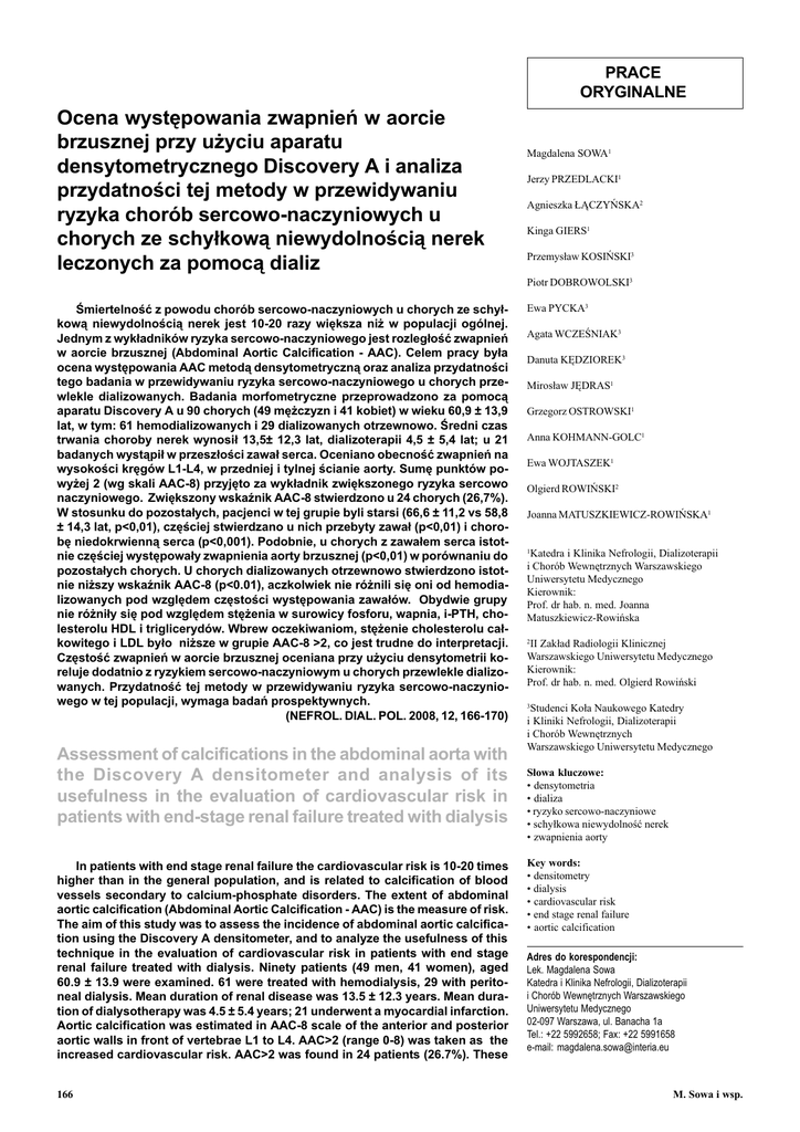 PRACE ORYGINALNE Ocena wystêpowania zwapnieñ w aorcie brzusznej przy u¿yciu aparatu densytometrycznego Discovery A i analiza przydatnoci tej metody w przewidywaniu ryzyka chorób sercowo-naczyniowych u chorych ze schy³kow¹ niewydolnoci¹ nerek leczonych za pomoc¹ dializ miertelnoæ z powodu chorób sercowo-naczyniowych u chorych ze schy³kow¹ niewydolnoci¹ nerek jest 10-20 razy wiêksza ni¿ w populacji ogólnej. Jednym z wyk³adników ryzyka sercowo-naczyniowego jest rozleg³oæ zwapnieñ w aorcie brzusznej (Abdominal Aortic Calcification - AAC). Celem pracy by³a ocena wystêpowania AAC metod¹ densytometryczn¹ oraz analiza przydatnoci tego badania w przewidywaniu ryzyka sercowo-naczyniowego u chorych przewlekle dializowanych. Badania morfometryczne przeprowadzono za pomoc¹ aparatu Discovery A u 90 chorych (49 mê¿czyzn i 41 kobiet) w wieku 60,9 ± 13,9 lat, w tym: 61 hemodializowanych i 29 dializowanych otrzewnowo. redni czas trwania choroby nerek wynosi³ 13,5± 12,3 lat, dializoterapii 4,5 ± 5,4 lat; u 21 badanych wyst¹pi³ w przesz³oci zawa³ serca. Oceniano obecnoæ zwapnieñ na wysokoci krêgów L1-L4, w przedniej i tylnej cianie aorty. Sumê punktów powy¿ej 2 (wg skali AAC-8) przyjêto za wyk³adnik zwiêkszonego ryzyka sercowo naczyniowego. Zwiêkszony wskanik AAC-8 stwierdzono u 24 chorych (26,7%). W stosunku do pozosta³ych, pacjenci w tej grupie byli starsi (66,6 ± 11,2 vs 58,8 ± 14,3 lat, p<0,01), czêciej stwierdzano u nich przebyty zawa³ (p<0,01) i chorobê niedokrwienn¹ serca (p<0,001). Podobnie, u chorych z zawa³em serca istotnie czêciej wystêpowa³y zwapnienia aorty brzusznej (p<0,01) w porównaniu do pozosta³ych chorych. U chorych dializowanych otrzewnowo stwierdzono istotnie ni¿szy wskanik AAC-8 (p<0.01), aczkolwiek nie ró¿nili siê oni od hemodializowanych pod wzglêdem czêstoci wystêpowania zawa³ów. Obydwie grupy nie ró¿ni³y siê pod wzglêdem stê¿enia w surowicy fosforu, wapnia, i-PTH, cholesterolu HDL i triglicerydów. Wbrew oczekiwaniom, stê¿enie cholesterolu ca³kowitego i LDL by³o ni¿sze w grupie AAC-8 >2, co jest trudne do interpretacji. Czêstoæ zwapnieñ w aorcie brzusznej oceniana przy u¿yciu densytometrii koreluje dodatnio z ryzykiem sercowo-naczyniowym u chorych przewlekle dializowanych. Przydatnoæ tej metody w przewidywaniu ryzyka sercowo-naczyniowego w tej populacji, wymaga badañ prospektywnych. (NEFROL. DIAL. POL. 2008, 12, 166-170) Assessment of calcifications in the abdominal aorta with the Discovery A densitometer and analysis of its usefulness in the evaluation of cardiovascular risk in patients with end-stage renal failure treated with dialysis In patients with end stage renal failure the cardiovascular risk is 10-20 times higher than in the general population, and is related to calcification of blood vessels secondary to calcium-phosphate disorders. The extent of abdominal aortic calcification (Abdominal Aortic Calcification - AAC) is the measure of risk. The aim of this study was to assess the incidence of abdominal aortic calcification using the Discovery A densitometer, and to analyze the usefulness of this technique in the evaluation of cardiovascular risk in patients with end stage renal failure treated with dialysis. Ninety patients (49 men, 41 women), aged 60.9 ± 13.9 were examined. 61 were treated with hemodialysis, 29 with peritoneal dialysis. Mean duration of renal disease was 13.5 ± 12.3 years. Mean duration of dialysotherapy was 4.5 ± 5.4 years; 21 underwent a myocardial infarction. Aortic calcification was estimated in AAC-8 scale of the anterior and posterior aortic walls in front of vertebrae L1 to L4. AAC>2 (range 0-8) was taken as the increased cardiovascular risk. AAC>2 was found in 24 patients (26.7%). These 166 Magdalena SOWA1 Jerzy PRZEDLACKI1 Agnieszka £¥CZYÑSKA2 Kinga GIERS1 Przemys³aw KOSIÑSKI3 Piotr DOBROWOLSKI3 Ewa PYCKA3 Agata WCZENIAK3 Danuta KÊDZIOREK3 Miros³aw JÊDRAS1 Grzegorz OSTROWSKI1 Anna KOHMANN-GOLC1 Ewa WOJTASZEK1 Olgierd ROWIÑSKI2 Joanna MATUSZKIEWICZ-ROWIÑSKA1 1 Katedra i Klinika Nefrologii, Dializoterapii i Chorób Wewnêtrznych Warszawskiego Uniwersytetu Medycznego Kierownik: Prof. dr hab. n. med. Joanna Matuszkiewicz-Rowiñska II Zak³ad Radiologii Klinicznej Warszawskiego Uniwersytetu Medycznego Kierownik: Prof. dr hab. n. med. Olgierd Rowiñski 2 Studenci Ko³a Naukowego Katedry i Kliniki Nefrologii, Dializoterapii i Chorób Wewnêtrznych Warszawskiego Uniwersytetu Medycznego 3 S³owa kluczowe: densytometria dializa ryzyko sercowo-naczyniowe schy³kowa niewydolnoæ nerek zwapnienia aorty Key words: densitometry dialysis cardiovascular risk end stage renal failure aortic calcification Adres do korespondencji: Lek. Magdalena Sowa Katedra i Klinika Nefrologii, Dializoterapii i Chorób Wewnêtrznych Warszawskiego Uniwersytetu Medycznego 02-097 Warszawa, ul. Banacha 1a Tel.: +22 5992658; Fax: +22 5991658 e-mail: [email protected] M. Sowa i wsp. patients were older (66.6 ± 11.2 years) as compared to those with AAC-8>2 (58.8 ± 14.3 years), (p<0.01). Patients with hurt infarct in past had more often aortic calcification (p<0.01) when compared to the rest of patients. Patients treated wit peritoneal dialysis had lower AAC-8 score, although the frequency of hurt infarct was similar to those treated with hemodialysis. Both groups did not differ in serum concentrations of phosphate, PTH, HDL and TG. Contrary to our expectations, serum concentrations of total cholesterol and LDL were lower in the AAC>2 group what is difficult to explain. We conclude that there is a relationship between the incidence of abdominal aortic calcification assessed via the IVA and cardiovascular risk in patients with end stage renal failure. The proposed method needs further prospective examinations. (NEPHROL. DIAL. POL. 2008, 12, 166-170) Wstêp Choroby uk³adu sercowo-naczyniowego (ChSN) stanowi¹ podstawowy problem zdrowotny na wiecie i s¹ najczêstsz¹ przyczyn¹ zgonów i ch