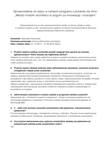 Sprawozdanie ze stażu w ramach programu Leonardo da Vinci „Młodzi mobilni architekci w pogoni za innowacją i rozwojem” Sprawozdanie ma na celu upowszechnienie wiedzy na temat udziału w stażu w ramach programu LdV i zamieszczone zostanie na stronie internetowej Biura Wymiany Międzynarodowej Politechniki Lubelskiej Uczestnik: Sebastian Szymanek Placówka partnerska: Schraut Rentschler Architekten Data i miejsce stażu: 01.12.2014 – 31.05.2015, Mainz 1. W jakim stopniu według uczestnika projekt osiągnął cele zawarte we wniosku zgłoszeniowym? Które okazały się najbardziej istotne? Zawarte we wniosku cele zostały spełnione w stopniu wysokim ponieważ wykonywane przeze mnie zadania pokrywaly sie z nimi. Za naistotniejsze uważam naukę języka niemieckiego oraz część praktyczną stażu. 2. Prosimy opisać zdobyte podczas stażu doświadczenie zawodowe, wymienić konkretne umiejętności nabyte przez uczestnika Zapoznanie się z procesem projektowania, zaczynając od pierwszej koncepcji, a kończąc na oddaniu gotowej dokumentacji budowlanej inwestorowi. Powierzane mi obowiązki były początkowo mało istotne, jednakże w miare upływu czasu, odpowiedzialność wzrastała. Ponadto zapoznałem się z systemem pracy w niemieckim biurze architektonicznym. Nabyte umiejętności: wykonywanie dokładnej inwentaryzacji budynków, praca w zespole oraz indywidualna nad koncepcją, tworzenie modeli 3d, składanie projektu budowlanego na pozwolenie na budowe. 3. Jakie korzyści zawodowe w ramach udziału w programie odniósł uczestnik? Zapoznanie się z niemieckim prawem budowlanym. Udział w procesie projektowym od pierwszego spotkania z inwestorem. Poznanie nowego oprogramowania bazującego na technologii BIM. 4. 4. Jakie inne korzyści przyniósł uczestnikowi staż (językowe, interpersonalne, społeczne)? Poznanie języka niemieckiego. Umiejętność rozmowy z klientem. Poprzez liczne weekendowe podroze po Niemczech i Szwajcarii bezpośrednie obcowanie z architekturą nowoczesną. 5. Czy kryteria zastosowane przy wyborze uczestników okazały się adekwatne do postawionych później przed uczestnikiem celów? Tak. 6. Czy przygotowanie kulturowo – językowo – pedagogiczne okazało się wystarczające podczas stażu? W jakim stopniu ułatwiło jego organizację i przebieg? Tak. Przygotowanie polegało na odbyciu intensywnego kursu języka niemieckiego, na rozmowach o sprawach bieżących z kolegami/koleżankami w pracy oraz na czynnym uczestnictwie w życiu towarzyskim miasta Mainz. 7. Jak przebiegała organizacja podróży oraz organizacja zakwaterowania? Podróż zorganizowana we własnym zakresie. Mieszkanie znalezione na portalu internetowym. Pomocna przy zakwaterowaniu okazała się znajoma mieszkająca od paru lat w Niemczech. Dodatkowo zawsze mogłem liczyć na pomoc ze strony kolegów/koleżanki z biura. 8. Jakie doświadczenia zdobyte podczas stażu okazały się najistotniejsze? Istotnym doświadczeniem była nieteoretyczna, a realna praca projektowa oraz bezpośredni kontakt z wykonawcami.