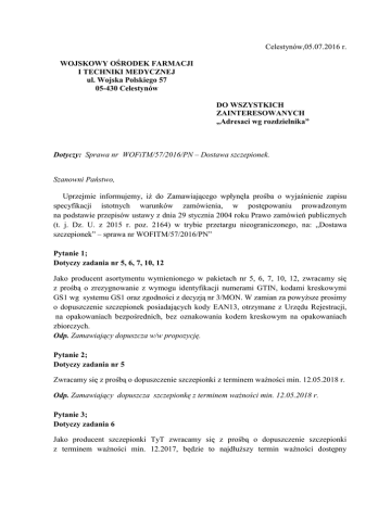 Celestynów,05.07.2016 r. WOJSKOWY OŚRODEK FARMACJI I TECHNIKI MEDYCZNEJ ul. Wojska Polskiego 57 05-430 Celestynów DO WSZYSTKICH ZAINTERESOWANYCH „Adresaci wg rozdzielnika” Dotyczy: Sprawa nr WOFiTM/57/2016/PN – Dostawa szczepionek. Szanowni Państwo, Uprzejmie informujemy, iż do Zamawiającego wpłynęła prośba o wyjaśnienie zapisu specyfikacji istotnych warunków zamówienia, w postępowaniu prowadzonym na podstawie przepisów ustawy z dnia 29 stycznia 2004 roku Prawo zamówień publicznych (t. j. Dz. U. z 2015 r. poz. 2164) w trybie przetargu nieograniczonego, na: „Dostawa szczepionek” – sprawa nr WOFITM/57/2016/PN” Pytanie 1; Dotyczy zadania nr 5, 6, 7, 10, 12 Jako producent asortymentu wymienionego w pakietach nr 5, 6, 7, 10, 12, zwracamy się z prośbą o zrezygnowanie z wymogu identyfikacji numerami GTIN, kodami kreskowymi GS1 wg systemu GS1 oraz zgodności z decyzją nr 3/MON. W zamian za powyższe prosimy o dopuszczenie szczepionek posiadających kody EAN13, otrzymane z Urzędu Rejestracji, na opakowaniach bezpośrednich, bez oznakowania kodem kreskowym na opakowaniach zbiorczych. Odp. Zamawiający dopuszcza w/w propozycję. Pytanie 2; Dotyczy zadania nr 5 Zwracamy się z prośbą o dopuszczenie szczepionki z terminem ważności min. 12.05.2018 r. Odp. Zamawiający dopuszcza szczepionkę z terminem ważności min. 12.05.2018 r. Pytanie 3; Dotyczy zadania 6 Jako producent szczepionki TyT zwracamy się z prośbą o dopuszczenie szczepionki z terminem ważności min. 12.2017, będzie to najdłuższy termin ważności dostępny w roku 2016. Odp. Zamawiający dopuszcza szczepionkę z terminem ważności min. 12.2017 r. Pytanie 4; Dotyczy zadania 7 Jako producent szczepionki Ty zwracamy się z prośbą o dopuszczenie szczepionki z terminem ważności min. 12.2017, będzie to najdłuższy termin ważności dostępny w roku 2016. Odp. Zamawiający dopuszcza szczepionkę z terminem ważności min. 12.2017 r. Pytanie 5; Dotyczy zadania 10, 12 Jako producent szczepionki d zwracamy się z prośbą o dopuszczenie szczepionki z terminem ważności min. 03.2019, będzie to najdłuższy termin ważności dostępny w roku 2016. Odp. Zamawiający dopuszcza szczepionkę z terminem ważności min. 03.2019 r. Informujemy, że zgodnie z wymogiem art. 38 ust. 2 ustawy, stanowisko Zamawiającego zostało rozesłane do wszystkich wykonawców, którym przekazano SIWZ. KOMENDANT płk Krzysztof KACZMAREK Sprawa WOFiTM/57/2016/PN