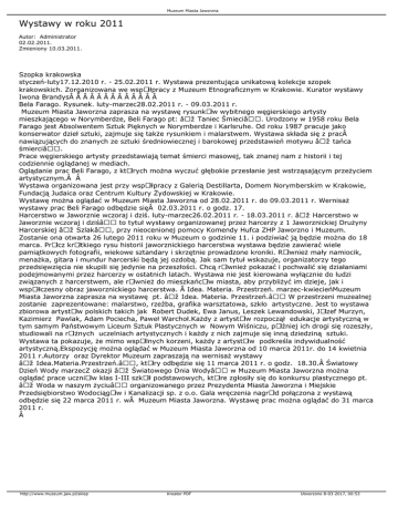 Muzeum Miasta Jaworzna Wystawy w roku 2011 Autor: Administrator 02.02.2011. Zmieniony 10.03.2011. Szopka krakowska styczeń-luty17.12.2010 r. - 25.02.2011 r. Wystawa prezentująca unikatową kolekcje szopek krakowskich. Zorganizowana we wspÃłłpracy z Muzeum Etnograficznym w Krakowie. Kurator wystawy Iwona Brandys             Bela Farago. Rysunek. luty-marzec28.02.2011 r. - 09.03.2011 r. Muzeum Miasta Jaworzna zaprasza na wystawę rysunkÃłw wybitnego węgierskiego artysty mieszkającego w Norymberdze, Beli Farago pt: „Taniec Śmieci―. Urodzony w 1958 roku Bela Farago jest Absolwentem Sztuk Pięknych w Norymberdze i Karlsruhe. Od roku 1987 pracuje jako konserwator dzieł sztuki, zajmuje się także rysunkiem i malarstwem. Wystawa składa się z prac nawiązujących do znanych ze sztuki średniowiecznej i barokowej przedstawień motywu „tańca śmierci―. Prace węgierskiego artysty przedstawiają temat śmierci masowej, tak znanej nam z historii i tej codziennie oglądanej w mediach. Oglądanie prac Beli Farago, z ktÃłrych można wyczuć głębokie przesłanie jest wstrząsającym przeżyciem artystycznym.  Wystawa organizowana jest przy wspÃłłpracy z Galerią Destillarta, Domem Norymberskim w Krakowie, Fundacją Judaica oraz Centrum Kultury Żydowskiej w Krakowie. Wystawę można oglądać w Muzeum Miasta Jaworzna od 28.02.2011 r. do 09.03.2011 r. Wernisaż wystawy prac Beli Farago odbędzie się 02.03.2011 r. o godz. 17. Harcerstwo w Jaworznie wczoraj i dziś. luty-marzec26.02.2011 r. - 18.03.2011 r. „Harcerstwo w Jaworznie wczoraj i dziśâ€• to tytuł wystawy organizowanej przez harcerzy z 1 Jaworznickiej Drużyny Harcerskiej „Szlak―, przy nieocenionej pomocy Komendy Hufca ZHP Jaworzno i Muzeum. Zostanie ona otwarta 26 lutego 2011 roku w Muzeum o godzinie 11. i podziwiać ją będzie można do 18 marca. PrÃłcz krÃłtkiego rysu historii jaworznickiego harcerstwa wystawa będzie zawierać wiele pamiątkowych fotografii, wiekowe sztandary i skrzętnie prowadzone kroniki. RÃłwnież mały namiocik, menażka, gitara i mundur harcerski będą jej ozdobą. Jak sam tytuł wskazuje, organizatorzy tego przedsięwzięcia nie skupili się jedynie na przeszłości. Chcą rÃłwnież pokazać i pochwalić się działaniami podejmowanymi przez harcerzy w ostatnich latach. Wystawa nie jest kierowana wyłącznie do ludzi związanych z harcerstwem, ale rÃłwnież do mieszkańcÃłw miasta, aby przybliżyć im dzieje, jak i wspÃłłczesny obraz jaworznickiego harcerstwa.  Idea. Materia. Przestrzeń. marzec-kwiecieńMuzeum Miasta Jaworzna zaprasza na wystawę pt. „Idea. Materia. Przestrzeń.― W przestrzeni muzealnej zostanie zaprezentowane: malarstwo, rzeźba, grafika warsztatowa, szkło artystyczne. Jest to wystawa zbiorowa artystÃłw polskich takich jak Robert Dudek, Ewa Janus, Leszek Lewandowski, JÃłzef Murzyn, Kazimierz Pawlak, Adam Pociecha, Paweł Warchoł.Każdy z artystÃłw rozpoczął edukacje artystyczną w tym samym Państwowym Liceum Sztuk Plastycznych w Nowym Wiśniczu, pÃłźniej ich drogi się rozeszły, studiowali na rÃłżnych uczelniach artystycznych i każdy z nich zajmuje się inną dziedziną sztuki. Wystawa ta pokazuje, że mimo wspÃłlnych korzeni, każdy z artystÃłw podkreśla indywidualność artystyczną.Ekspozycję można oglądać w Muzeum Miasta Jaworzna od 10 marca 2011r. do 14 kwietnia 2011 r.Autorzy oraz Dyrektor Muzeum zapraszają na wernisaż wystawy „Idea.Materia.Przestrzeń.―, ktÃłry odbędzie się 11 marca 2011 r. o godz. 18.30. Światowy Dzień Wody marzecZ okazji „Światowego Dnia Wody― w Muzeum Miasta Jaworzna można oglądać prace uczniÃłw klas I-III szkÃłł podstawowych, ktÃłre zgłosiły się do konkursu plastycznego pt. „Woda w naszym życiu― organizowanego przez Prezydenta Miasta Jaworzna i Miejskie Przedsiębiorstwo WodociągÃłw i Kanalizacji sp. z o.o. Gala wręczenia nagrÃłd połączona z wystawą odbędzie się 22 marca 2011 r. w Muzeum Miasta Jaworzna. Wystawę prac można oglądać do 31 marca 2011 r.  http://www.muzeum.jaw.pl/sklep Kreator PDF Utworzono 8-03-2017, 00:53