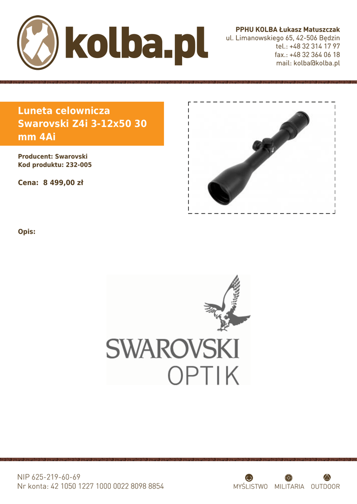 Luneta celownicza Swarovski Z4i 3-12x50 30 mm 4Ai Producent: Swarovski Kod produktu: 232-005 Cena: 8 499,00 zł Opis: Wysokiej klasy układ optyczny i precyzyjna siatka celownicza z podświetleniem sprawiają, że nowa luneta Swarovski Z4i 3-12x50 to luneta celownicza przenaczona dla wymagających strzelców, doświadczonych myśliwych oraz tych, ktorzy swoją przygodę ze strzelectwem i myślistwem rozpoczynają. Model lunety celowniczej Swarovski Z4i jest uniwersalną optyką sprawdzającą się podczas różnych rodzajów polowań. Dzięki nowoczesnemu wzornictwu i wyważonym proporcjom ta luneta celownicza prezentuje się doskonale na każdej broni myśliwskiej. Główne zalety lunety celowniczej Swarovski Z4i. Lekkość: ● zminimalizowana waga, ● trwały aluminiowy korpus zapewnijący wysoką odporność na wstrząsy, ● opcjonalnie dostępna z szyną montażową (SR), Doskonała optyka: ● ● ● wysoki poziom transmisji światła zapewniający oddanie celnego strzały także o zmierzchu, sprawdzony układ optyczny o wysokim kontraście z optymalną ostrością peryferyjną, wypełnienie azotem chroniące przed wewnętrznym zaparowaniem, Precyzja: ● precyzyjna siatka celownicza na drugim planie zapewniająca wysokim poziom dokładności podczas strzelania, ● wyraźny, podświetlany znak celowniczy dzięki nowej technologiii HIGH GRID, ● precyzyjna regulacja sietki celowniczej, Funkcjonalne podświetlenie: ● ● ● ● demontowany moduł podświetlenia BE 5 pozwalający na bezgłośne ustawienie 48 stopni jasności (32 stopnie w trybie nocnym i 16 stopini w trybie dziennym), funkcja zapamiętywania ustawionego poziomu jasności, automatyczne wyłączenie po 3 godzinach, informacja o wymianie baterii: migający znak celowniczy informuje, iż bateria jest bliska wyczerpania, Dane techniczne: ● ● ● powiększenie: 3-12x średnicza soczewki obiektywu (mm): 39-50 średnica źrenicy wyjściowej (mm): 13,1-4,2 ● ● ● ● ● ● ● ● ● ● ● ● ● ● odległość źrenicy wyjściowej (mm): 90 pole widzenia (m/100 m): 11-3,5 pole widzenia (stopnie): 6,3-2,0 pole widzenia pozorne (w stopniach) 23,2 kompensacja dioptrii (dpt): -3 do +2 przepuszczalność światła (%): 93 sprawnosć zmierzchowa (DIN 58388): 9-25 korekcja punktu trafienia na klik (mm/100 m): 10 maksymalna regulacja w pionie i poziomie (m/ 100 m): 1,1 długość (mm): 344 masa całkowita (g): 520 średnica tubusa (mm): 30 siatka celownicza z podświetleniem: 4A-I zakres temp. działania: -20 st. C / +55 st. C