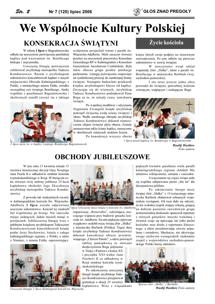 Str. 2 GŁOS ZNAD PREGOŁY Nr 7 (120) lipiec 2006 We Wspólnocie Kultury Polskiej Życie kościoła KONSEKRACJA ŚWIĄTYNI W sobotę 1 lipca w Bagrationowsku odbyła się uroczystość poświęcenia parafialnej kaplicy pod wezwaniem św. Bonifacego biskupa i męczennika. Uroczystą liturgię poświęcenia celebrował arcybiskup metropolita Tadeusz Kondrusiewicz. Razem z arcybiskupem nabożeństwo koncelebrowali kapłani z innych miejscowości Obwodu Kaliningradzkiego, z Polski, z niemieckiego miasta Fulda, ośrodka szczególnej czci świętego Bonifacego. Ażeby wspólnie z parafianami Bagrationowska i okolicznych osiedli cieszyć się z takiego wydarzenia przyjechali wierni z parafii św. Wojciecha-Adalberta. Mieli zaszczyt również przybyć na uroczystość pracownicy Konsulatu Generalnego RP w Kaliningradzie z Konsulem Generalnym Jarosławem Czubińskim. Była także obecna grupa posłów polskiego parlamentu. Liturgię poświęcenia rozpoczęto od symbolicznej procesji do zamkniętej bramy świątyni. Następnie budowlani przekazali księdzu arcybiskupowi klucze od kaplicy. Zwracając się do wiernych, arcybiskup Tadeusz Kondrusiewicz podziękował Panu Bogu za to, że minęły czasy zamykania świątyń. Po wspólnej modlitwie i odczytaniu fragmentu Ewangelii ksiądz arcybiskup pokropił święconą wodą ściany świątyni i ołtarz. Wedle ustalonego obrzędu arcybiskup Tadeusz Kondrusiewicz dokonał namaszczenia olejem świętym płyty ołtarza. Zostały namaszczone także ściany kaplicy, zaznaczone w określonych miejscach znakiem krzyża. Po konsekracji wszyscy obecni księża złożyli swoje podpisy na stosownym zaświadczeniu. Po tym odbyło się pierwsze nabożeństwo w nowej świątyni. W uroczystości wziął udział wspaniały chór „Halka”, także z parafii św. Bonifacego w miasteczku Barlinek (woj. zachodnio-pomorskie). I oto teraz jeszcze jedna ulica prowadzi do świątyni, potrzebnej ludziom wierzącym, wątpiącym i szukającym Boga. 1 lipca przed kaplicą św. Bonifacego w Bagrationowsku 1 lipca msza św. w kaplicy świętego Bonifacego Bagrationowsk Wasilij Wasiliew Foto autora OBCHODY JUBILEUSZOWE W tym roku 13 kwietnia minęła 15 rocznica historycznej decyzji Ojca Świętego Jana Pawła II o odbudowie struktur kościoła rzymskokatolickiego w Rosji. W bieżącym roku również swój srebrny jubileusz 25-lecia kapłaństwa obchodzi Jego Ekscelencja arcybiskup metropolita Tadeusz Kondrusiewicz. Z powodu tak znakomitych rocznic w kaliningradzkim kościele Św. WojciechaAdalberta 2 lipca zostało odprawione uroczyste nabożeństwo. Kościół tej niedzieli2 był wypełniony po brzegi. Nie starczało miejsc siedzących, ludzie musieli stanąć w przejściach. Jubileuszową liturgię wraz z jubilatem księdzem arcybiskupem Tadeuszem Kondrusiewiczem koncelebrowali ksiądz prałat Jerzy Steckiewicz, księża z całego kaliningradzkiego regionu, z Polski, a także z Niemiec, z miasta Fulda, reprezentujący pięknych kwiatów parafianie wielu parafii kaliningradzkiego regionu składali Mu mnóstwo wdzięczności, uznania i szacunku. Uwięczeniem tej części święta stało się wspólne odśpiewanie pieśni „Sto lat” dla duszpasterza-jubilata. Po zakończeniu liturgii mszy świętej chór „Halka” z 15-tysięcznego miasteczka Barlinek obdarował zebranych wspaniałym występem. Od razu dało się odczuć, że ten wokalny zespół, mający własną, grającą lipca Uroczysta msza święta w kościele św. Adalberta na dobrym poziomie zawodowym grupę organizację „Renovabis”, udzielającą zna- instrumentalną doskonale opanował repertuar czącego wsparcia przy budowie gmachu koś- z różnych gatunków muzyki wokalnej i cioła św. Adalberta. Swoim pięknym śpiewem świetnie czuje się śpiewając nie tylko pieśni wyjątkowo ozdobił mszę świętą chór „Halka” kościelne oraz dzieła z repertuaru klasyczz miasteczka Barlinek (Polska). Tegoż dnia nego, a także przedstawiając utwory popuksiądz arcybiskup Tadeusz Kondrusiewicz larne i estradowe. Słuchacze, nie ukrywając dokonał konsekracji obrazu przedsta- swego zachwytu wynagrodzili znakomity wiającego „Chrzest Pański”, a także poświęcił zespól z województwa zachodnio-pomortablicę pamiątkową ze słowami skiego Polski burzą oklasków. dziękczynienia Bogu jedynemu w Trójcy i Piotrowi z końca XX i początku XXI wieku Janu Pawłowi II za odbudowę w Rosji struktur kościoła rzymskokatolickiego. Po zakończeniu uroczystej liturgii ksiądz arcybiskup Tadeusz Kondrusiewicz przyjmował gratulacje z okazji 25 rocznicy Śpiewa chór „Halka” z Barlinka kapłaństwa. Wraz z wiązankami Wasilij Wasiliew Foto autora Uroczysta liturgia 2 lipca Kaliningrad kościół św. Wojciecha